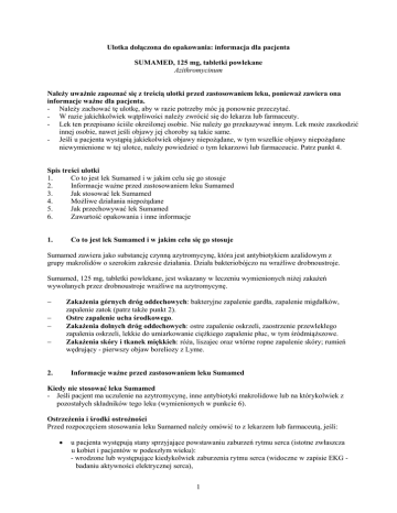Ulotka dołączona do opakowania: informacja dla pacjenta SUMAMED, 125 mg, tabletki powlekane Azithromycinum Należy uważnie zapoznać się z treścią ulotki przed zastosowaniem leku, ponieważ zawiera ona informacje ważne dla pacjenta. - Należy zachować tę ulotkę, aby w razie potrzeby móc ją ponownie przeczytać. - W razie jakichkolwiek wątpliwości należy zwrócić się do lekarza lub farmaceuty. - Lek ten przepisano ściśle określonej osobie. Nie należy go przekazywać innym. Lek może zaszkodzić innej osobie, nawet jeśli objawy jej choroby są takie same. - Jeśli u pacjenta wystąpią jakiekolwiek objawy niepożądane, w tym wszelkie objawy niepożądane niewymienione w tej ulotce, należy powiedzieć o tym lekarzowi lub farmaceucie. Patrz punkt 4. Spis treści ulotki 1. Co to jest lek Sumamed i w jakim celu się go stosuje 2. Informacje ważne przed zastosowaniem leku Sumamed 3. Jak stosować lek Sumamed 4. Możliwe działania niepożądane 5. Jak przechowywać lek Sumamed 6. Zawartość opakowania i inne informacje 1. Co to jest lek Sumamed i w jakim celu się go stosuje Sumamed zawiera jako substancję czynną azytromycynę, która jest antybiotykiem azalidowym z grupy makrolidów o szerokim zakresie działania. Działa bakteriobójczo na wrażliwe drobnoustroje. Sumamed, 125 mg, tabletki powlekane, jest wskazany w leczeniu wymienionych niżej zakażeń wywołanych przez drobnoustroje wrażliwe na azytromycynę. Zakażenia górnych dróg oddechowych: bakteryjne zapalenie gardła, zapalenie migdałków, zapalenie zatok (patrz także punkt 2). Ostre zapalenie ucha środkowego. Zakażenia dolnych dróg oddechowych: ostre zapalenie oskrzeli, zaostrzenie przewlekłego zapalenia oskrzeli, lekkie do umiarkowanie ciężkiego zapalenie płuc, w tym śródmiąższowe. Zakażenia skóry i tkanek miękkich: róża, liszajec oraz wtórne ropne zapalenie skóry; rumień wędrujący - pierwszy objaw boreliozy z Lyme. 2. Informacje ważne przed zastosowaniem leku Sumamed Kiedy nie stosować leku Sumamed - Jeśli pacjent ma uczulenie na azytromycynę, inne antybiotyki makrolidowe lub na którykolwiek z pozostałych składników tego leku (wymienionych w punkcie 6). Ostrzeżenia i środki ostrożności Przed rozpoczęciem stosowania leku Sumamed należy omówić to z lekarzem lub farmaceutą, jeśli: u pacjenta występują stany sprzyjające powstawaniu zaburzeń rytmu serca (istotne zwłaszcza u kobiet i pacjentów w podeszłym wieku): - wrodzone lub występujące kiedykolwiek zaburzenia rytmu serca (widoczne w zapisie EKG badaniu aktywności elektrycznej serca), 1 - ciężka niewydolność serca, - bardzo wolna czynność serca (zwana bradykardią), - zaburzenia elektrolitowe we krwi, zwłaszcza małe stężenie potasu i magnezu, - przyjmowanie innych leków mogących powodować wydłużenie odstępu QT w zapisie EKG (patrz punkt "Lek Sumamed a inne leki”); pacjent ma ciężkie zaburzenia czynności nerek; pacjent ma ciężkie zaburzenia czynności wątroby: lekarz może kontrolować czynność wątroby lub przerwać leczenie; pacjent ma nowe zakażenie (może to świadczyć o nadmiernym wzroście opornych drobnoustrojów lub o zakażeniu grzybiczym); pacjent ma zaburzenia nerwowe (neurologiczne) lub umysłowe (psychiczne); pacjent ma chorobę przenoszoną drogą płciową: lekarz powinien upewnić się czy u pacjenta nie współistnieje zakażenie kiłą; pacjent stosuje pochodne ergotaminy (preparaty sporyszu); pacjent ma zakażone rany oparzeniowe. Zakażenia wywołane przez paciorkowce W leczeniu zapalenia gardła i migdałków podniebiennych spowodowanych przez paciorkowce lekiem z wyboru jest zwykle penicylina. Rzekomobłoniaste zapalenie okrężnicy W razie wystąpienia biegunki należy to natychmiast zgłosić lekarzowi, gdyż może to być objaw rzekomobłoniastego zapalenia okrężnicy - powikłania występującego niekiedy podczas stosowania antybiotyków makrolidowych. Takie rozpoznanie lekarz powinien rozważyć u pacjentów, u których wystąpi biegunka po rozpoczęciu leczenia azytromycyną. W przypadku rzekomobłoniastego zapalenia okrężnicy w wyniku stosowania azytromycyny konieczne może być odstawienie leku Sumamed i zastosowanie odpowiedniego leczenia. Przeciwwskazane jest podawanie środków hamujących perystaltykę. Stosowanie długotrwałe Brak danych na temat bezpieczeństwa i skuteczności azytromycyny stosowanej długotrwale w wymienionych wyżej wskazaniach. W przypadku szybko nawracających zakażeń, lekarz rozważy leczenie innym lekiem przeciwbakteryjnym. Miastenia W trakcie leczenia azytromycyną obserwowano zaostrzenie objawów miastenii lub wystąpienie zespołu miastenicznego (patrz punkt „Możliwe działania niepożądane”). Dzieci i młodzież Sumamed w postaci tabletek powlekanych 125 mg jest zalecany do stosowania u dzieci o odpowiedniej masie ciała, które potrafią połknąć tabletkę. Dla pozostałej grupy dzieci zaleca się stosowanie produktu Sumamed w postaci zawiesiny doustnej. Dla dzieci o masie przekraczającej 45 kg zaleca się stosowanie kapsułek twardych 250 mg lub tabletek powlekanych 500 mg. Lek Sumamed a inne leki Należy powiedzieć lekarzowi lub farmaceucie o wszystkich lekach stosowanych przez pacjenta obecnie lub ostatnio, a także o lekach, które pacjent planuje stosować. Jeśli pacjent stosuje którykolwiek z niżej wymienionych leków, jest szczególnie ważne, aby powiedzieć o tym lekarzowi lub farmaceucie: leki wpływające na odstęp QT, takie jak - chinidyna, prokainamid, dofetylid, amiodaron, sotalol (stosowane w leczeniu zaburzeń rytmu serca), - cyzapryd (stosowany w zaburzeniach żołądka), 2 - terfenadyna (stosowana w leczeniu alergii), - leki przeciwpsychotyczne, np. pimozyd, - leki przeciwdepresyjne, np. cytalopram, - fluorochinolony (stosowane w zakażeniach), np. moksyfloksacyna, lewofloksacyna; leki zobojętniające (Sumamed należy podawać co najmniej 1 godzinę przed lub 2 godziny po pr