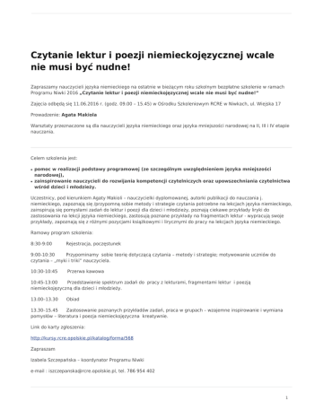 Czytanie lektur i poezji niemieckojęzycznej wcale nie musi być nudne! Zapraszamy nauczycieli języka niemieckiego na ostatnie w bieżącym roku szkolnym bezpłatne szkolenie w ramach Programu Niwki 2016 „Czytanie lektur i poezji niemieckojęzycznej wcale nie musi być nudne!” Zajęcia odbędą się 11.06.2016 r. (godz. 09.00 – 15.45) w Ośrodku Szkoleniowym RCRE w Niwkach, ul. Wiejska 17 Prowadzenie: Agata Makiola Warsztaty przeznaczone są dla nauczycieli języka niemieckiego oraz języka mniejszości narodowej na II, III i IV etapie nauczania. Celem szkolenia jest: ● ● pomoc w realizacji podstawy programowej (ze szczególnym uwzględnieniem języka mniejszości narodowej), zainspirowanie nauczycieli do rozwijania kompetencji czytelniczych oraz upowszechniania czytelnictwa wśród dzieci i młodzieży. Uczestnicy, pod kierunkiem Agaty Makioli – nauczycielki dyplomowanej, autorki publikacji do nauczania j. niemieckiego, zapoznają się /przypomną sobie metody i strategie czytania potrzebne na lekcjach języka niemieckiego, zainspirują się pomysłami zadań do lektur i poezji dla dzieci i młodzieży, poznają ciekawe przykłady liryki do zastosowania na lekcji języka niemieckiego, zastosują poznane przykłady na fragmentach lektur - wypracują swoje przykłady, zapoznają się z różnymi pozycjami książkowymi i lirycznymi do pracy na lekcjach języka niemieckiego. Ramowy program szkolenia: 8:30-9:00 Rejestracja, poczęstunek 9:00-10:30 Przypominamy sobie teorię dotyczącą czytania – metody i strategie; motywowanie uczniów do czytania – „myki i triki” nauczyciela. 10:30-10:45 Przerwa kawowa 10:45-13:00 Przedstawienie spektrum zadań do pracy z lekturami, fragmentami lektur i poezją niemieckojęzyczną dla dzieci i młodzieży. 13.00–13.30 Obiad 13.30–15.45 Zastosowanie poznanych przykładów zadań, praca w grupach – wzajemne inspirowanie i wymiana pomysłów – literatura i poezja niemieckojęzyczna kreatywnie. Link do karty zgłoszenia: http://kursy.rcre.opolskie.pl/katalog/forma/568 Zapraszam Izabela Szczepańska – koordynator Programu Niwki e-mail : [email protected], tel. 786 954 402 1