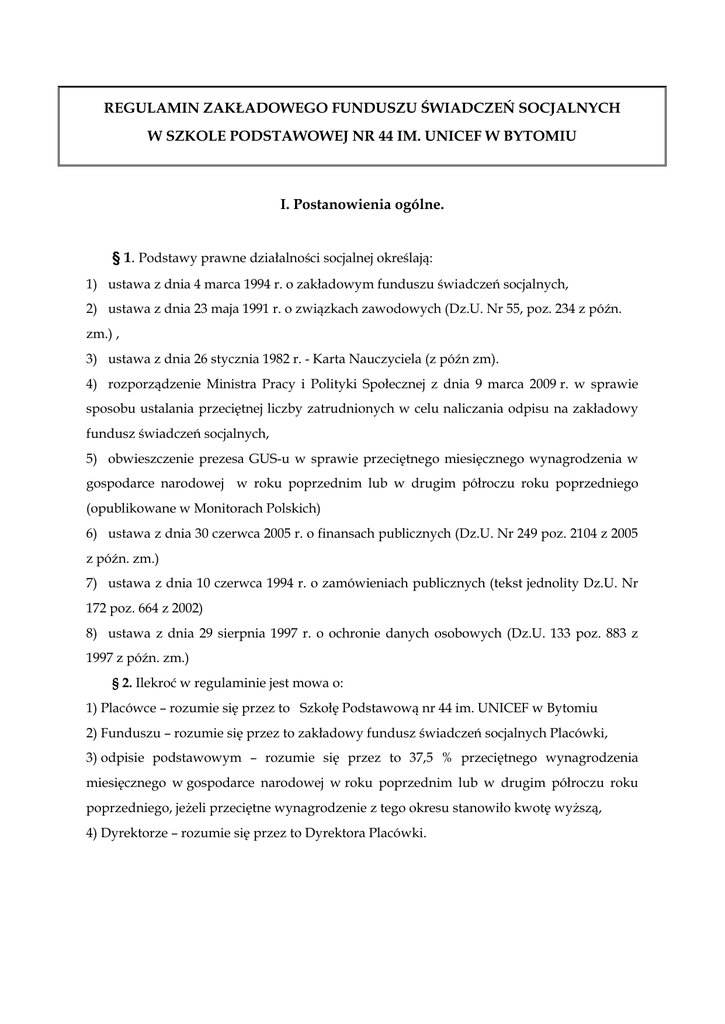 REGULAMIN ZAKŁADOWEGO FUNDUSZU ŚWIADCZEŃ SOCJALNYCH W SZKOLE PODSTAWOWEJ NR 44 IM. UNICEF W BYTOMIU I. Postanowienia ogólne. § 1. Podstawy prawne działalności socjalnej określają: 1) ustawa z dnia 4 marca 1994 r. o zakładowym funduszu świadczeń socjalnych, 2) ustawa z dnia 23 maja 1991 r. o związkach zawodowych (Dz.U. Nr 55, poz. 234 z późn. zm.) , 3) ustawa z dnia 26 stycznia 1982 r. - Karta Nauczyciela (z późn zm). 4) rozporządzenie Ministra Pracy i Polityki Społecznej z dnia 9 marca 2009 r. w sprawie sposobu ustalania przeciętnej liczby zatrudnionych w celu naliczania odpisu na zakładowy fundusz świadczeń socjalnych, 5) obwieszczenie prezesa GUS-u w sprawie przeciętnego miesięcznego wynagrodzenia w gospodarce narodowej w roku poprzednim lub w drugim półroczu roku poprzedniego (opublikowane w Monitorach Polskich) 6) ustawa z dnia 30 czerwca 2005 r. o finansach publicznych (Dz.U. Nr 249 poz. 2104 z 2005 z późn. zm.) 7) ustawa z dnia 10 czerwca 1994 r. o zamówieniach publicznych (tekst jednolity Dz.U. Nr 172 poz. 664 z 2002) 8) ustawa z dnia 29 sierpnia 1997 r. o ochronie danych osobowych (Dz.U. 133 poz. 883 z 1997 z późn. zm.) § 2. Ilekroć w regulaminie jest mowa o: 1) Placówce – rozumie się przez to Szkołę Podstawową nr 44 im. UNICEF w Bytomiu 2) Funduszu – rozumie się przez to zakładowy fundusz świadczeń socjalnych Placówki, 3) odpisie podstawowym – rozumie się przez to 37,5 % przeciętnego wynagrodzenia miesięcznego w gospodarce narodowej w roku poprzednim lub w drugim półroczu roku poprzedniego, jeżeli przeciętne wynagrodzenie z tego okresu stanowiło kwotę wyższą, 4) Dyrektorze – rozumie się przez to Dyrektora Placówki. § 3. Podstawą gospodarowania środkami zakładowego funduszu świadczeń socjalnych jest roczny plan finansowy Funduszu, stanowiący załącznik nr 1. § 4. 1. Regulamin, roczny plan finansowy, sprawozdanie z realizacji planu finansowego z roku poprzedniego oraz wszystkie załączniki wymagają uzgodnienia z zakładowymi organizacjami związkowymi zrzeszającymi pracowników Placówki, tzn. z Zarządem Oddziału Związku Nauczycielstwa Polskiego w Bytomiu i Radzionkowie Międzyzakładową Organizacją Związkową „Solidarność” Pracowników oraz z Oświaty i Wychowania Bytom-Radzionków-Piekary Śląskie. 2. Decyzja w sprawie przyznania indywidualnych świadczeń ze środków Funduszu wymaga również uzgodnienia z zakładowymi organizacjami związkowymi. Sposób uzgadniania tych decyzji określa zakładowa organizacja związkowa. 3. Dyrektor powołuje komisję składającą się z upoważnionych przedstawicieli zakładowych organizacji związkowych działających w placówce. § 5. Wszelką odpowiedzialność za administrowanie środkami Funduszu ponosi Dyrektor. § 6. Podstawą do przyznania świadczeń i usług jest średni dochód brutto przypadający na osobę w rodzinie z okresu 1 miesiąca poprzedzającego miesiąc przyznania świadczenia. II. Osoby uprawnione do świadczeń. § 6. 1. Do korzystania ze świadczeń Funduszu uprawnieni są pracownicy Placówki i członkowie ich rodzin oraz emeryci i renciści - byli pracownicy Placówki i członkowie ich rodzin. 2. Osoby korzystające z urlopu wychowawczego oraz nauczyciele na urlopach zdrowotnych bądź pozostający w stanie nieczynnym korzystają ze świadczeń Funduszu na zasadach obowiązujących wobec pracowników. 3. Za członków rodziny, o których mowa w ust. 1, uważa się wszystkie osoby pozostające na utrzymaniu pracownika lub emeryta albo rencisty - byłego pracownika, wspólnie z nim zamieszkujące, w tym dzieci w wieku do lat 18, do lat 25 jeżeli się kształcą i pozostają na utrzymaniu rodziców. 4. Za emeryta lub rencistę - byłego pracownika Placówki uznaje się emeryta lub rencistę, dla którego Placówka była ostatnim miejscem pracy poprzedzającym pobieranie świadczenia emerytalnego lub rentowego. § 7. Osobami uprawnionymi do świadczeń są również członkowie rodziny zmarłego pracownika Placówki lub emeryta albo rencisty - byłego pracownika Placówki, pobierający z tego tytułu rentę rodzinną. III. Przeznaczenie Funduszu § 8. 1. Fundusz przeznaczony jest na dofinansowanie: 1) różnych form krajowego i zagranicznego wypoczynku osób uprawnionych, 2) kolonii, obozów, zielonych szkół, zimowisk, 3) udziału osób uprawnionych w imprezach kulturalnych, sportowych oraz rekreacyjnych, 4) pomocy materialnej – rzeczowej lub finansowej dla osób uprawnionych, 5) pomocy materialnej lub rzeczowej w formie zapomóg losowych, 6) pomocy na cele mieszkaniowe. § 9. Przez finansowanie wypoczynku osób uprawnionych rozumie się: 1) wypłatę świadczeń urlopowych dla nauczycieli (art. 53KN), 2) dofinansowanie wypoczynku organizowanego we własnym zakresie (np. wczasy pod gruszą) – tabela nr 1 3) dopłata do wczasów zorganizowanych – tabela nr 5 4) dofinansowanie do kolonii, obozów, zielonych szkół, zimowisk - tabela nr 2 § 10. Przez działalność kulturalno-oświatową i sportowo-rekreacyjną rozumie się w szczególności: 1) krajowe i zagraniczne wycieczki organizowane lub współorganizowane przez Placówkę, 2) spektakle teatralne lub filmowe oraz wydarzenia sportowe i rekreacyjne, w których udział (bilety wstępu) zakupiono przez placówkę, Dzień Dziecka, Mikołaj 3) spotkanie kulturalno-oświatowe np. z okazji Dnia Edukacji Narodowej organizowaną lub współorganizowaną przez placówkę, § 11. Przez pomoc materialną dla osób uprawnionych rozumie się w szczególności: 1) zapomogi pieniężne przyznawane w związku z różnymi przypadkami losowymi (ciężka choroba, wypadek, strata w wyniku kradzieży, pożaru bądź zalania itp.), 2) pomoc rzeczową dla dzieci osób uprawnionych , w związku z rozpoczęciem zajęć w roku szkolnym – tabela nr 6 3) pomoc rzeczową lub finansową dla osób uprawnionych z okazji świąt – tabela nr 3 i 4 § 12. Przez cele mieszkaniowe rozumie się: 1)