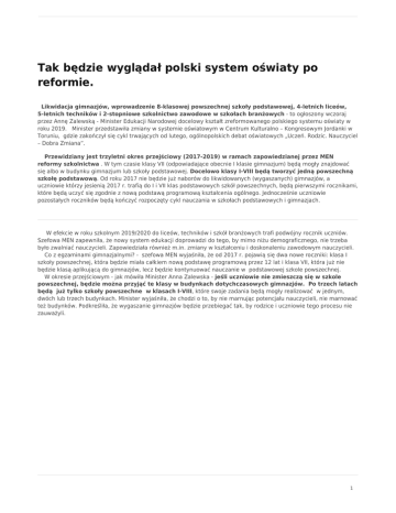 Tak będzie wyglądał polski system oświaty po reformie. Likwidacja gimnazjów, wprowadzenie 8-klasowej powszechnej szkoły podstawowej, 4-letnich liceów, 5-letnich techników i 2-stopniowe szkolnictwo zawodowe w szkołach branżowych - to ogłoszony wczoraj przez Annę Zalewską - Minister Edukacji Narodowej docelowy kształt zreformowanego polskiego systemu oświaty w roku 2019. Minister przedstawiła zmiany w systemie oświatowym w Centrum Kulturalno – Kongresowym Jordanki w Toruniu, gdzie zakończył się cykl trwających od lutego, ogólnopolskich debat oświatowych „Uczeń. Rodzic. Nauczyciel – Dobra Zmiana”. Przewidziany jest trzyletni okres przejściowy (2017-2019) w ramach zapowiedzianej przez MEN reformy szkolnictwa . W tym czasie klasy VII (odpowiadające obecnie I klasie gimnazjum) będą mogły znajdować się albo w budynku gimnazjum lub szkoły podstawowej. Docelowo klasy I-VIII będą tworzyć jedną powszechną szkołę podstawową. Od roku 2017 nie będzie już naborów do likwidowanych (wygaszanych) gimnazjów, a uczniowie którzy jesienią 2017 r. trafią do I i VII klas podstawowych szkół powszechnych, będą pierwszymi rocznikami, które będą uczyć się zgodnie z nową podstawą programową kształcenia ogólnego. Jednocześnie uczniowie pozostałych roczników będą kończyć rozpoczęty cykl nauczania w szkołach podstawowych i gimnazjach. W efekcie w roku szkolnym 2019/2020 do liceów, techników i szkół branżowych trafi podwójny rocznik uczniów. Szefowa MEN zapewniła, że nowy system edukacji doprowadzi do tego, by mimo niżu demograficznego, nie trzeba było zwalniać nauczycieli. Zapowiedziała również m.in. zmiany w kształceniu i doskonaleniu zawodowym nauczycieli. Co z egzaminami gimnazjalnymi? - szefowa MEN wyjaśniła, że od 2017 r. pojawią się dwa nowe roczniki: klasa I szkoły powszechnej, która będzie miała całkiem nową podstawę programową przez 12 lat i klasa VII, która już nie będzie klasą aplikującą do gimnazjów, lecz będzie kontynuować nauczanie w podstawowej szkole powszechnej. W okresie przejściowym - jak mówiła Minister Anna Zalewska - jeśli uczniowie nie zmieszczą się w szkole powszechnej, będzie można przyjąć te klasy w budynkach dotychczasowych gimnazjów. Po trzech latach będą już tylko szkoły powszechne w klasach I-VIII, które swoje zadania będą mogły realizować w jednym, dwóch lub trzech budynkach. Minister wyjaśniła, że chodzi o to, by nie marnując potencjału nauczycieli, nie marnować też budynków. Podkreśliła, że wygaszanie gimnazjów będzie przebiegać tak, by rodzice i uczniowie tego procesu nie zauważyli. 1