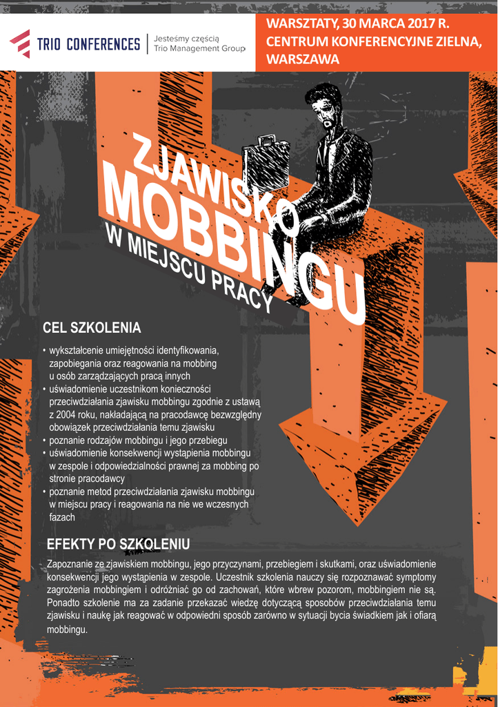 WARSZTATY, 30 MARCA 2017 R. CENTRUM KONFERENCYJNE ZIELNA, WARSZAWA ZJA W M IS WM OBB KO ING U IEJS CEL SZKOLENIA CU PRA CY • wykształcenie umiejętności identyfikowania, zapobiegania oraz reagowania na mobbing u osób zarządzających pracą innych • uświadomienie uczestnikom konieczności przeciwdziałania zjawisku mobbingu zgodnie z ustawą z 2004 roku, nakładającą na pracodawcę bezwzględny obowiązek przeciwdziałania temu zjawisku • poznanie rodzajów mobbingu i jego przebiegu • uświadomienie konsekwencji wystąpienia mobbingu w zespole i odpowiedzialności prawnej za mobbing po stronie pracodawcy • poznanie metod przeciwdziałania zjawisku mobbingu w miejscu pracy i reagowania na nie we wczesnych fazach EFEKTY PO SZKOLENIU Zapoznanie ze zjawiskiem mobbingu, jego przyczynami, przebiegiem i skutkami, oraz uświadomienie konsekwencji jego wystąpienia w zespole. Uczestnik szkolenia nauczy się rozpoznawać symptomy zagrożenia mobbingiem i odróżniać go od zachowań, które wbrew pozorom, mobbingiem nie są. Ponadto szkolenie ma za zadanie przekazać wiedzę dotyczącą sposobów przeciwdziałania temu zjawisku i naukę jak reagować w odpowiedni sposób zarówno w sytuacji bycia świadkiem jak i ofiarą mobbingu. PROGRAM WARSZTATÓW 30 MARCA 2017, CENTRUM KONFERENCYJNE ZIELNA, WARSZAWA 08:20-08:50 08:50-09:00 REJESTRACJA UCZESTNIKÓW WPROWADZENIE DO WARSZTATU, POZNANIE UCZESTNIKÓW I USTALENIE INDYWIDUALNYCH CELÓW NA WARSZTAT 09:00-10:00 I BLOK SZKOLENIOWY: Wprowadzenie do tematyki mobbingu • Dlaczego mówimy o mobbingu? • Jaka jest skala mobbingy w Polsce i krajach UE • Mobbing i inne formy dyskryminacji w zatrudnieniu • Definicja, pochodzenie i znaczenie terminu • Regulacje i kwestie prawne (Wykład interaktywny) 10:00-10:15 PRZERWA KAWOWA 10:15-11:45 II BLOK SZKOLENIOWY: Zjawiska sprzyjające pojawianiu się mobbingu: • Po stronie osób mobbowanych • Mobberów • Obserwatorów • Organizacji (Dyskusja moderowana i analiza przypadków) Zachowania mobbera: Taktyki Typy zachowań Cechy osobowości (Analiza przypadków, dyskusja moderowana) • • • 11:45-12:00 PRZERWA KAWOWA 12:00-13:20 III BLOK SZKOLENIOWY: Zachowanie osoby mobbowanej: Osobowość Emocje Sposób komunikacji Spirala bezsilności i złości (Gra interaktywna i dyskusja moderowana) • • • • Różnice między mobbingiem i konfliktem interpersonalnym: Dynamika obu procesów Zachowania i znaczenie Kiedy konflikt jest mobbingiem? (Wykład interaktywny i ćwiczenia w grupach) • • • 13:20-14:00 PRZERWA OBIADOWA 14:00-15:30 IV BLOK SZKOLENIOWY: Skutki mobbingu: • • Na poziomie indywidualnym Społecznym i organizacyjnym (Dyskusja moderowana w oparciu o przykłady) Sposoby identyfikacji i rozpoznawania mobbingu. • • • • 15:30-15:45 Sposoby identyfikowania sytuacji w rozmowach z ofiarą Reagowanie na różne zachowania osoby przejawiającej tendencje do bycia mobberem Identyfikowanie konfliktów i sposoby wczesnego reagowania na potencjalne skutki konfliktów Reagowanie na fałszywe alarmy oraz nadużycia w zakresie oskarżeń o stoso wanie mobbingu PRZERWA KAWOWA 15:45-16:45 V BLOK SZKOLENIOWY: Zapobieganie zjawisku mobbingu: Formy pomocy dla osób mobbowanych Kultura organizacyjna oraz relacje w zespole - identyfikowanie czynników sprzyjających powstawaniu zjawisku Zachowania oraz relacje pomiędzy poszczególnymi członkami zespołu Działania praktyczne zapobiegające zjawisku (Dyskusja moderowana) • • • • 16:45-17:00 PODSUMOWANIE SZKOLENIA I ZAKOŃCZENIE SZKOLENIA INFORMACJE O TRENERZE: DAGMARA GŁOWACKA Coach, Mentor, Trener, Manager Trener, coach i mentor z kilkunastoletnim doświadczeniem w pracy z zespołami produkcyjnymi i logistycznymi, Wyższą Kadrą Managerską. Od zawsze zainteresowana mechanizmami zachowań ludzi i metodami motywującymi ich do przekraczania granic. Inspiruje ludzi do zmiany perspektywy, rozszerzenia horyzontów i dostrzegania nieoczywistych na pierwszy rzut oka rozwiązań. Wspiera ludzi w budowaniu pewności siebie i braniu odpowiedzialności za podejmowane decyzje. Jako przełożony, trener i coach łączy koncentrację na osiąganiu celów z holistycznym i coachingowym podejściem do rozwoju ludzi. Zdaniem jej podwładnych jest wymagająca, ale sprawiedliwa. Stawia ambitne, a zarazem realne cele, które motywują ludzi do rozwoju i sięgania po więcej. Widzi ludzi w ludziach pamiętając o realiach i potrzebach biznesu. W swojej karierze zawodowej wielokrotnie przeciwdziałała zjawiskowi mobbingu. INFORMACJE O TRIO CONFERENCES: Jesteśmy niezależnym organizatorem wydarzeń dedykowanych dla biznesu. Wchodząc w skład grupy Trio Management, korzystamy z wieloletniego doświadczenia naszego partnera w obszarze wspierania rozwoju i poprawy efektywności organizacji. Tworzymy kompleksowe projekty szkoleń zarówno na płaszczyźnie rozwoju kompetencji miękkich, jak i wiedzy specjalistycznej. Organizowane przez nas szkolenia to unikalne połączenie wiedzy i praktyki. FORMULARZ FORMULARZ FORMULARZ zgłoszeniowy zgłoszeniowy WARSZTAT – ZJAWISKO MOBBINGU W MIEJSCU PRACY 13-14 13-14Grudnia, Grudnia,2016 2016 13-14 Grudnia, 2016 30Konferencyjne MARCA 2017, Centrum Centrum Konferencyjne Zielna, 13-14 Grudnia, 2016 Zielna, Centrum Konferencyjne Zielna, ul. ul.Zielna ZielnaKonferencyjne 37, 37,Warszawa WarszawaZielna, Centrum ul. Zielna 37, Warszawa ul. Zielna 37, Warszawa zgłoszeniowy CENTRUM KONFERENCYJNE ZIELNA Wyślij WyślijDZIŚ DZIŚZGŁOSZENIE ZGŁOSZENIENA NANUMER NUMERFAKSU FAKSU Wyślij DZIŚ ZGŁOSZENIE NA NUMER FAKSU 1. Imięii nazwisko........................................................................................... i nazwisko........................................................................................... 1.1.Imię Imię nazwisko........................................................................................... 22 22ZGŁOSZENIE 444 44478 7834 34LUB LUB ZAREJESTRUJ ZAREJESTRUJ SIĘ 