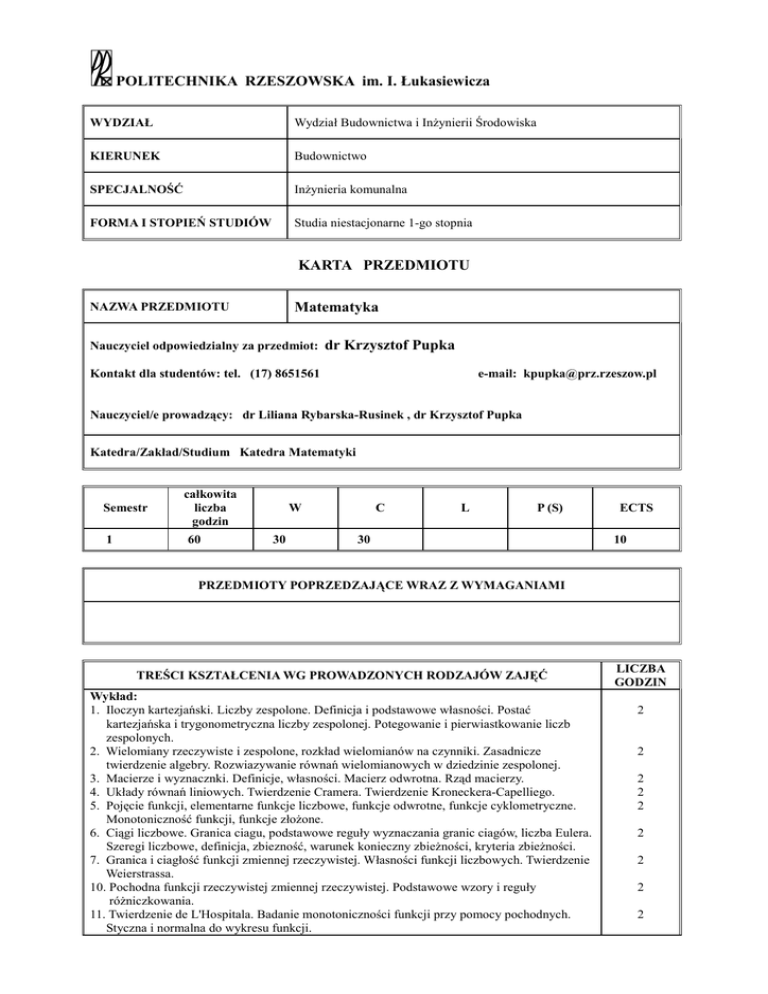 POLITECHNIKA RZESZOWSKA im. I. Łukasiewicza WYDZIAŁ Wydział Budownictwa i InŜynierii Środowiska KIERUNEK Budownictwo SPECJALNOŚĆ InŜynieria komunalna FORMA I STOPIEŃ STUDIÓW Studia niestacjonarne 1-go stopnia KARTA PRZEDMIOTU Matematyka NAZWA PRZEDMIOTU Nauczyciel odpowiedzialny za przedmiot: dr Krzysztof Pupka Kontakt dla studentów: tel. (17) 8651561 e-mail: [email protected] Nauczyciel/e prowadzący: dr Liliana Rybarska-Rusinek , dr Krzysztof Pupka Katedra/Zakład/Studium Katedra Matematyki Semestr 1 całkowita liczba godzin 60 W 30 C L P (S) 30 ECTS 10 PRZEDMIOTY POPRZEDZAJĄCE WRAZ Z WYMAGANIAMI TREŚCI KSZTAŁCENIA WG PROWADZONYCH RODZAJÓW ZAJĘĆ Wykład: 1. Iloczyn kartezjański. Liczby zespolone. Definicja i podstawowe własności. Postać kartezjańska i trygonometryczna liczby zespolonej. Potegowanie i pierwiastkowanie liczb zespolonych. 2. Wielomiany rzeczywiste i zespolone, rozkład wielomianów na czynniki. Zasadnicze twierdzenie algebry. Rozwiazywanie równań wielomianowych w dziedzinie zespolonej. 3. Macierze i wyznacznki. Definicje, własności. Macierz odwrotna. Rząd macierzy. 4. Układy równań liniowych. Twierdzenie Cramera. Twierdzenie Kroneckera-Capelliego. 5. Pojęcie funkcji, elementarne funkcje liczbowe, funkcje odwrotne, funkcje cyklometryczne. Monotoniczność funkcji, funkcje złoŜone. 6. Ciągi liczbowe. Granica ciagu, podstawowe reguły wyznaczania granic ciagów, liczba Eulera. Szeregi liczbowe, definicja, zbiezność, warunek konieczny zbieŜności, kryteria zbieŜności. 7. Granica i ciagłość funkcji zmiennej rzeczywistej. Własności funkcji liczbowych. Twierdzenie Weierstrassa. 10. Pochodna funkcji rzeczywistej zmiennej rzeczywistej. Podstawowe wzory i reguły róŜniczkowania. 11. Twierdzenie de L'Hospitala. Badanie monotoniczności funkcji przy pomocy pochodnych. Styczna i normalna do wykresu funkcji. LICZBA GODZIN 2 2 2 2 2 2 2 2 2 12. Zastosowanie rachunku pochodnych (ekstrema, badanie funkcji). Pochodne wyŜszych rzędów, twierdzenie Taylora (aproksymacje funkcjami wielomianowymi). Rozwijanie funkcj w szereg potęgowy. 13. Wyznaczanie wartości największych i najmniejszych oraz wartości ekstremalnych w zadaniach technicznych i geometrycznych. 14. Elementy geometrii analitycznej. Wektory na płaszczyźnie i w przestrzeni. Iloczyn skalarny, wektorowy, interpretacje geometryczne oraz fizyczne. 15. Wzajemne połoŜenie prostej i płaszczyzny w przestrzeni. Powierzchnie w przestrzeni. Ćwiczenia: 1. Działania na liczbach zespolonych w postaci kartezjańskiej i trygonometrycznej. Potęgowanie i pierwiastkowanie liczb zespolonych. 2. Rozwiazywanie równań wielomianowych o wspołczynnikach zespolonych w zbiorze liczb zespolonych. Wyznaczanie podzbiorów płaszczyzny zespolonej. 3. Działania na macierzach, wyznaczniki i rzędy macierzy. 4. Układy równań liniowych. Układy kramerowskie. Twierdzenie Kroneckera-Capelliego. Rozwiązywanie dowolnych układów równan. 5. Wyznaczanie granic ciagów i badanie zbieŜności szeregów liczbowych. 6. Wyznaczanie granic funkcji i badanie ciagłości funkcji. 7. Pochodna funkcji. Stosowanie twierdzenia de L'Hospitala do obliczania granic funkcji. 8. Zastosowanie rachunku pochodnych do badania przebiegu zmienności funkcji. 9. Wyznaczanie wartosci najmniejszych i największych oraz ekstremalnych w zadaniach technicznych i geometrycznych. 10. Algebra zbiorów na płaszczyźnie i w przestrzeni. Iloczyn skalarny, iloczyn wektorowy i i loczyn mieszany. 11. Równania prostych i płaszczyzn w przestrzeni. Analiza wzajemnych połoŜeń. Łącznie liczba godzin 2 2 2 2 2 4 2 4 2 2 4 2 2 2 4 30+30=60 DyŜury dydaktyczne (konsultacje): w terminach podanych w harmonogramie pracy jednostki EFEKTY KSZTAŁCENIA - UMIEJĘTNOŚCI KSZTAŁCENIA Celem kursu jest zapoznanie studentów z podstawami analizy matematycznej. Student powinien rozumieć podstawowe pojęcia analizy matematycznej oraz zdobyć praktyczną umiejetność rozwiązywania prostych problemów analizy matematycznej. FORMA I WARUNKI ZALICZENIA PRZEDMIOTU (RODZAJU ZAJĘĆ) Warunkiem zaliczenia przedmiotu jest uzyskanie pozytywnych ocen z kolokwiów oraz z egzaminu. WYKAZ LITERATURY PODSTAWOWEJ 1. W. Krysicki, L. Włodarski, Analiza matematyczna w zadaniach, cz. I, PWN, Warszawa 2000. 2. T. Jurlewicz, Z. Skoczylas, Algebra liniowa I, Oficyna Wydawnicza GiS, Wrocław 2003. 3. M. Gewret, E. Skoczylas, Analiza matematyczna I, Oficyna Wydawnicza GiS, Wrocław 2004. WYKAZ LITERATURY UZUPEŁNIAJĄCEJ 1. J. Banaś, S. Wędrychowicz, Zbiór zadań z analizy matematycznej, WNT, Warszawa 1996. 2. J. Stankiewicz, K. Wilczek, Algebra z geometrią, Oficyna wydawnicza Politechniki Rzeszowskiej, Rzeszów 2000. 3. W. Stankiewicz, Zadania z matematyki dla wyŜszych uczelni technicznych, cz. I, PWN, Warszawa 1999. Podpis nauczyciela odpowiedzialnego za przedmiot Podpis kierownika (zakładu/studium) katedry Data i podpis dziekana właściwego wydziału