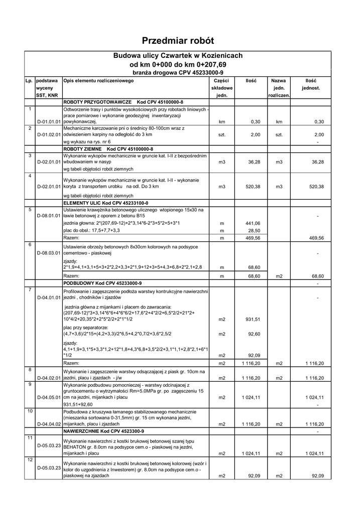 Przedmiar robót Budowa ulicy Czwartek w Kozienicach od km 0+000 do km 0+207,69 bran a drogowa CPV 45233000-9 Lp. podstawa Opis elementu rozliczeniowego Cz wyceny SST, KNR ROBOTY PRZYGOTOWAWCZE 1 2 3 ci Ilo Nazwa sk adowe jedn. jedn. rozliczen. Ilo jednost. Kod CPV 45100000-8 Odtworzenie trasy i punktów wysoko ciowych przy robotach liniowych prace pomiarowe i wykonanie geodezyjnej inwentaryzacji D-01.01.01 powykonawczej, Mechaniczne karczowanie pni o rednicy 80-100cm wraz z do 3 km D-01.02.01 odwiezieniem karpiny na odleg wg wykazu na rys. nr 6 ROBOTY ZIEMNE Kod CPV 45100000-8 Wykonanie wykopów mechanicznie w gruncie kat. I-II z bezpo rednim D-02.01.01 wbudowaniem w nasyp wg tabeli obj to ci robót ziemnych km 0,30 km 0,30 szt. 2,00 szt. 2,00 - m3 36,28 m3 36,28 m3 520,38 m3 520,38 m 441,06 4 Wykonanie wykopów mechanicznie w gruncie kat. I-II - wykonanie D-02.01.01 koryta z transportem urobku na odl. Do 3 km wg tabeli obj to ci robót ziemnych 5 ELEMENTY ULIC Kod CPV 45233100-0 Ustawienie kraw nika betonowego ulicznego wtopionego 15x30 na D-08.01.01 awie betonowej z oporem z betonu B15 jezdnia g owna: 2*(207,69-12)+2*3,14*6-2*3+5*2+5+3*1 6 - plac do obs .: 17,5+7,7+3,3 m 28,50 Razem: m 469,56 469,56 Ustawienie obrze y betonowych 8x30cm kolorowych na podsypce D-08.03.01 cementowo - piaskowej - zjazdy: 2*1,9+4,1+3,1+5+3+2*2,2+3,3+2*1,9+12+3+5+4,3+6,8+2*2,1+2,8 m 68,60 Razem: m 68,60 m2 PODBUDOWY Kod CPV 45233000-9 7 8 9 Profilowanie i zag szczenie pod D-04.01.01 jezdni , chodników i zjazdów - a warstwy kontrukcyjne nawierzchni - jezdnia g ówna z mijankami i placem do zawracania: (207,69-12)*3+3,14*6*6+4*6*6/2+17,6*2+4*2/2+6,5*2/2+21*2+ 10*4/2+20,35*2+2*5*2/2+2*1*1/2 m2 931,51 plac przy separatorze: (4,7+3,6)/2*15+(4,2+3,3)/2*6,5+4,2*0,7/2+3,6*2,5/2 m2 92,60 zjazdy: 4,1+1,9+3,1*5+3,3*1,2+12*1,8+4,3*6,8+3,5*2/2+3,1*1,1+2,8*2,1+6*1 *1/2 m2 92,09 Razem: m2 1 116,20 m2 1 116,20 m2 1 116,20 m2 1 116,20 m2 1 024,11 Wykonanie i zag szczenie warstwy ods czaj cej z piask gr. 10cm na D-04.02.01 jezdni, placu i zjazdach - j/w Wykonanie podbudowu pomocnieczej - warstwy odcinajacej z gruntocementu o wytrzyma ci Rm=5.0MPa gr. po zag sczeniu 15 D-04.05.01 cm na jezdni, mijankach i placu 1 024,11 931,51+92,60 10 11 12 68,60 Podbudowa z kruszywa amanego stabilizowanego mechanicznie (mieszanka sortowana 0-31,5mm) gr. 15 cm wykonana jezdni, D-04.04.02 mijankach, placu i zjazdach NAWIERZCHNIE Kod CPV 4523300-9 - m2 1 116,20 m2 1 116,20 - Wykonanie nawierzchni z kostki brukowej betonowej szarej typu D-05.03.23 BEHATON gr. 8.0cm na podsypce cem.o - piaskowej na jezdni, mijankach i placu m2 1 024,11 m2 1 024,11 Wykonanie nawierzchni z kostki brukowej betonowej kolorowej (wzór i D-05.03.23 kolor do uzgodnienia z Inwestorem) gr. 8.0cm na podsypce cem.o piaskowej na zjazdach m2 92,09 m2 92,09 ROBOTY DODATKOWE I WYKO CZ. Kod CPV 45100000-8 13 - wycena asna Regulacja i obrobienie drobnych urzadzen zwiazanych z uzbrojeniem podziemnym - obudowy zasuw, s czków itp.. kmpl 1,00 kmpl 1,00 wycena asna Regulacja wysoko ciowa betonem studni urz dze uzbrojenia podziemnego - studnie reiwzyjne kanalizacji sanitarnej i burzowej szt. 10,00 szt. 10,00 wycena asna Ulepszenie nawierzchni poboczy gruntowych - zag szczenia pod a oraz wykonanie naw. t uczniowej z mieszanki sortowanej 0/31mm gr. 12 cm (207,69-4,4-5-4,3-26-2,8+6)*0,75+(207,69-7,3-3,3-12+6)*1 m2 319,48 m2 319,48 - m 15,00 m 15,00 szt. 1,00 szt. 1,00 14 15 16 Wykonanie ogrodzenia - panelowe przet aczane 3D sk adaj ce si z paneli zgrzewanych z drutów pionowych i poziomych o rednicy min. KNNR 2 4,0 mm w form kraty, wysoko c paneli 1230mm ze s upkami z 1603/0200 kszta towników prostok tnych 60x40x1,5 mm lub okr ych 48x1,5 mm zako czonych od góry daszkami na podmurówce betonowej prefabrykowanej sk adaj cej si z desek betonowych wysoko ci 200 mm i grubo ci 60 mm 17 wycena asna 18 wycena asna Wykonanie i monta furtki o szeroko ci 1,0m wg rozwi za indywidualnych Wykonawcy – z kszta towników stalowych z wype nieniem elementami stalowymi lub panelami drutu wraz ze upkami, zawiasami i ryglami do zamykania, wszystkie elementy nale y zabezpieczone antykorozyjnie poprzez cynkowanie ogniowe OZNAKOWANIE i ELEMENTY BRD Kod CPV 45233280-5 Monta skrajna drogowych barier ochronnych typu SP-05 ze s upkami co 4 m, o normalnym poziomie powstrzymywania wg projektu organizacji ruchu 19 Monta znaków pionowych typu A " rednich" 900mm z licem z folii D-07.02.01 odblaskowej I generacji m szt. 108,00 1,00 m szt. 108,00 1,00 wg projektu organizacji ruchu 20 Monta znaków pionowych typu D " rednich" 600x600mm z licem z D-07.02.01 folii odblaskowej I generacji wg projektu organizacji ruchu 21 Monta znaków pionowych typu D "mini" 400x400mm z licem z folii D-07.02.01 odblaskowej I generacji szt. 5,00 szt. szt. 1,00 szt. wg projektu organizacji ruchu 22 23 24 5,00 1,00 - Monta znaków pionowych tablic typu T 600x50mm jednostronnych z D-07.02.01 licem z folii odblaskowej I generacji szt. 1,00 szt. 1,00 Monta znaków pionowych typu B-31 " rednich"800mm z licem z folii D-07.02.01 odblaskowej I generacji szt. 3,00 szt. 5,00 wg projektu organizacji ruchu Ustawienie s upków do znaków z rur ocynkowanych 1,5 cala d ugo ci D-07.02.01 3,5m szt. 8,00 szt. 8,00 -