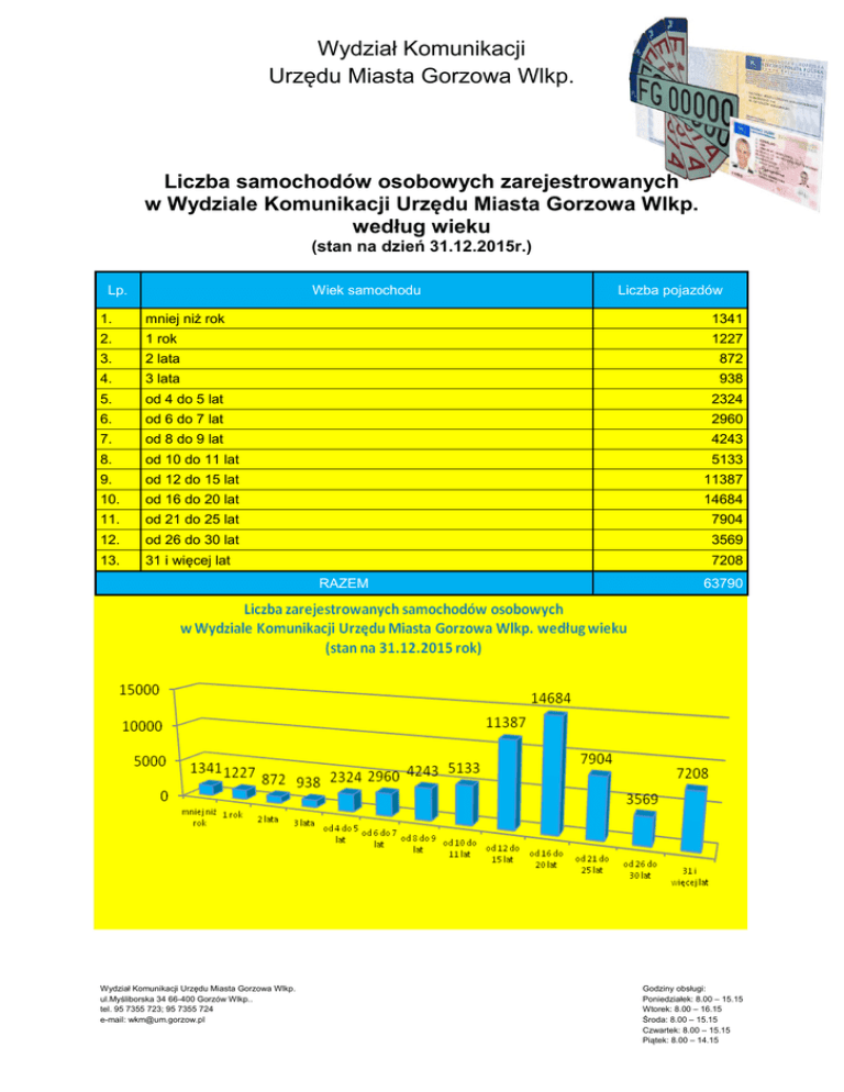 Wydział Komunikacji Urzędu Miasta Gorzowa Wlkp. Liczba samochodów osobowych zarejestrowanych w Wydziale Komunikacji Urzędu Miasta Gorzowa Wlkp. według wieku (stan na dzień 31.12.2015r.) Lp. Wiek samochodu Liczba pojazdów 1. mniej niż rok 1341 2. 1 rok 1227 3. 2 lata 872 4. 3 lata 938 5. od 4 do 5 lat 2324 6. od 6 do 7 lat 2960 7. od 8 do 9 lat 4243 8. od 10 do 11 lat 5133 9. od 12 do 15 lat 11387 10. od 16 do 20 lat 14684 11. od 21 do 25 lat 7904 12. od 26 do 30 lat 3569 13. 31 i więcej lat 7208 RAZEM Wydział Komunikacji Urzędu Miasta Gorzowa Wlkp. ul.Myśliborska 34 66-400 Gorzów Wlkp.. tel. 95 7355 723; 95 7355 724 e-mail: [email protected] 63790 Godziny obsługi: Poniedziałek: 8.00 – 15.15 Wtorek: 8.00 – 16.15 Środa: 8.00 – 15.15 Czwartek: 8.00 – 15.15 Piątek: 8.00 – 14.15