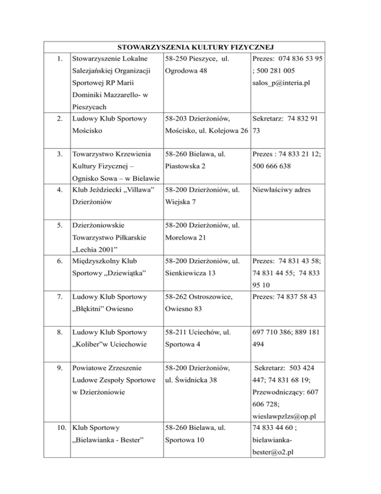 STOWARZYSZENIA KULTURY FIZYCZNEJ 1. Stowarzyszenie Lokalne 58-250 Pieszyce, ul. Prezes: 074 836 53 95 Salezjańskiej Organizacji Ogrodowa 48 ; 500 281 005 Sportowej RP Marii [email protected] Dominiki Mazzarello- w Pieszycach 2. 3. Ludowy Klub Sportowy 58-203 Dzierżoniów, Sekretarz: 74 832 91 Mościsko Mościsko, ul. Kolejowa 26 73 Towarzystwo Krzewienia 58-260 Bielawa, ul. Prezes : 74 833 21 12; Kultury Fizycznej – Piastowska 2 500 666 638 Klub Jeździecki „Villawa” 58-200 Dzierżoniów, ul. Niewłaściwy adres Dzierżoniów Wiejska 7 Dzierżoniowskie 58-200 Dzierżoniów, ul. Towarzystwo Piłkarskie Morelowa 21 Ognisko Sowa – w Bielawie 4. 5. „Lechia 2001” 6. Międzyszkolny Klub 58-200 Dzierżoniów, ul. Prezes: 74 831 43 58; Sportowy „Dziewiątka” Sienkiewicza 13 74 831 44 55; 74 833 95 10 7. 8. 9. Ludowy Klub Sportowy 58-262 Ostroszowice, „Błękitni” Owiesno Owiesno 83 Ludowy Klub Sportowy 58-211 Uciechów, ul. 697 710 386; 889 181 „Koliber”w Uciechowie Sportowa 4 494 Powiatowe Zrzeszenie 58-200 Dzierżoniów, Sekretarz: 503 424 Ludowe Zespoły Sportowe ul. Świdnicka 38 447; 74 831 68 19; w Dzierżoniowie Prezes: 74 837 58 43 Przewodniczący: 607 606 728; [email protected] 10. Klub Sportowy „Bielawianka - Bester” 58-260 Bielawa, ul. 74 833 44 60 ; Sportowa 10 [email protected] 11. Ludowy Klub Sportowy „Czarni” Sieniawka 58-210 Łagiewniki, Sieniawka 61 Adres do korespondencji: Sieniawka 54 12. Towarzystwo Krzewienia Kultury Fizycznej Ognisko 58-200 Dzierżoniów os. Prezes: 74 645 17 10; Różane 33c 600 740 306 Dzierżoniów przy Spółdzielni Mieszkaniowej w Dzierżoniowie 13. Ludowy Klub Sportowy „Zieloni” Łagiewniki 14. Ludowy Klub Sportowy „Sparta” Ostroszowice 15. Zapaśniczy Klub Sportowy „Bielawianka” 58-210 Łagiewniki, ul. Przemysłowa 1 58-262 Ostroszowice, ul. Wiceprezes: 603 377 Bielawska 55 718 58-260 Bielawa, ul. Polna Wiceprezes: 607 606 2 728 ; Adres do korespondencji: [email protected] 58-260 Bielawa, ul. Ludowa 10/18 16. Ludowy Lekkoatletyczny Klub Sportowy 58-260 Bielawa, ul. Sekretarz: 695 182 Sportowa 10 886; „Bielawianka” 17. Ludowy Klub Sportowy „Orzeł” Piława Dolna [email protected] 58-241 Piława Dolna, ul. Prezes: 885 513 824; Główna 35 ; 74 837 02 02; Adres do korespondencji: edward.kasztelan@wp ul. Bielawska 24 a, 58- .pl 241 Piława Dolna 18. Ludowy Klub Sportowy „Atom „ w Dzierżoniowie 58-200 Dzierżoniów, os. Wiceprezes: 504 174 Tęczowe 9 797; Prezes: 605 363 Adres do korespondencji: 676; ul. Żeromskiego 59 a/2, [email protected] 58-260 Bielawa 19. Ludowy Klub Sportowy „Niemczanka” w Niemczy 58-230 Niemcza, ul. Prezes : 74 837 64 20; Sienkiewicza 1 601 727 687 Adres do korespondencji: ul. Bolesława Chrobrego 48a/4 20. Międzyszkolny Klub Sportowy „Żagiew” w 58-200 Dzierżoniów Tel. OSIR :74 645 05 ul. Strumykowa 1 41; Prezes: 604 578 0 Dzierżoniowie 10 [email protected] 21. Ludowy Klub Sportowy w 58-217 Gilów, Gilów 43 Gilowie 22. Amatorska Liga Koszykówki 23. Sportowy Klub Taekwon- 58-260 Bielawa, ul. Grota Niewłaściwy adres Roweckiego 16 58-200 Dzierżoniów, os. Do „Tiger” w Dzierżoniowie Błękitne 20 b/3 Prezes: 74 831 16 67; 501 073 411 [email protected] 24. Stowarzyszenie „Super Kibic- Mistrz Wiedzy 58-200 Dzierżoniów, ul. Prezes: 601 251 881; Świdnicka 38 74 831 13 32 58-200 Dzierżoniów, ul. 74 831 98 79 Dżentelmen Sportowych Aren” 25. Klub Sportowy Niepełnosprawnych Struga 2 „START” Dzierżoniów 26. Miejski Klub Sportowy „POGOŃ” Pieszyce 58-250 Pieszyce, ul. Prezes: 784 546 270; Hermana 1 - skr. poczt. 20 74 836 69 80 Adres do korespondencji: [email protected] 58-200 Dzierżoniów, ul. Kościuszki 7/4 27. Miejsko - Zakładowy Klub Sportowy „Lechia” w 58-200 Dzierżoniów Prezes : 604 562 153 ul. Wrocławska 47 [email protected]; Dzierżoniowie Wiceprezes: 727 628 744 adkucharski606@wp. pl; 28. Klub Sportowy 58-240 Piława Górna, ul. 74 837 17 45 „Piławianka” w Piławie Piastowska 15a Górnej 29. Ludowy Klub Sportowy „VICTORIA” Tuszyn 30. Zrzeszenie Ludowych 58-203 Dzierżoniów, Prezes: 74 830 28 36, Tuszyn 36 600 516 248, Adres do korespondencji: Wiceprezes: 696 375 58-203 Dzierżoniów, 092 58-200 Dzierżoniów, ul. Klubów Sportowych Gminy Świdnicka 38 Dzierżoniów Adres do korespondencji: 58-200 Dzierżoniów, ul. Szkolna 14 31. Klub Piłkarski „Bielawianka” Bielawa 58-260 Bielawa, ul. Tel./faks: 74 833 15 Sportowa 10 27 www.bielawianka.pl