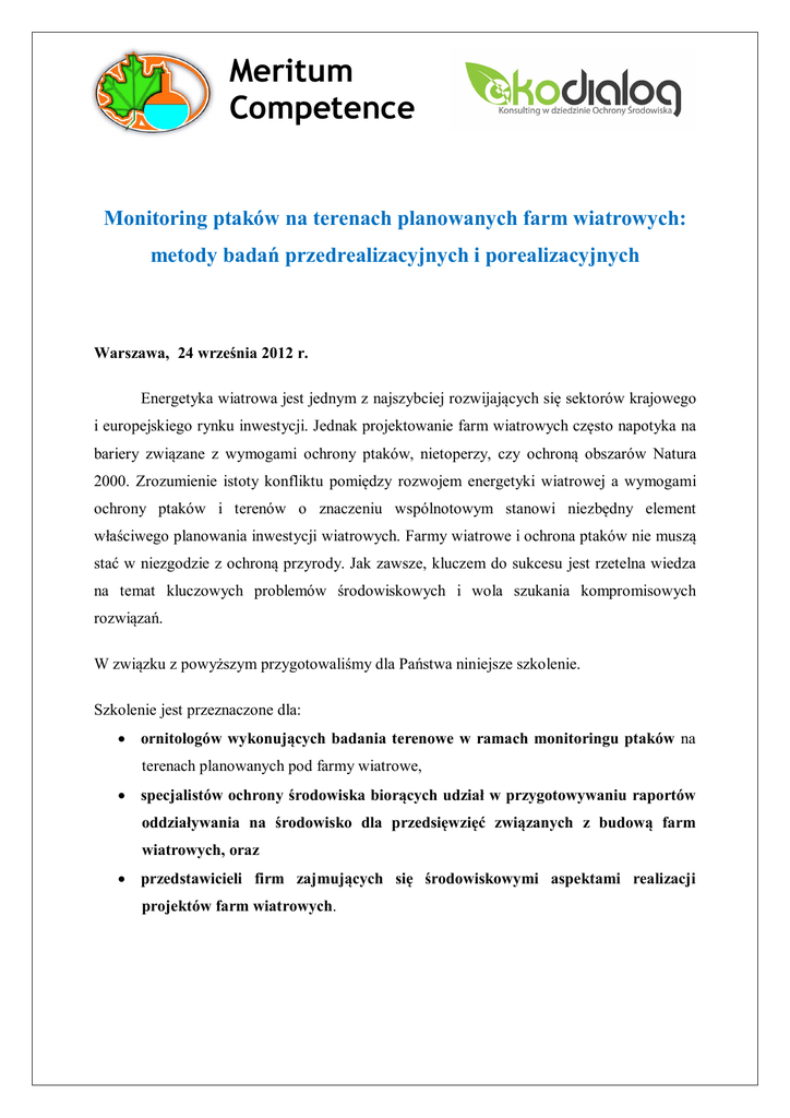 Meritum Competence Monitoring ptaków na terenach planowanych farm wiatrowych: metody badań przedrealizacyjnych i porealizacyjnych Warszawa, 24 września 2012 r. Energetyka wiatrowa jest jednym z najszybciej rozwijających się sektorów krajowego i europejskiego rynku inwestycji. Jednak projektowanie farm wiatrowych często napotyka na bariery związane z wymogami ochrony ptaków, nietoperzy, czy ochroną obszarów Natura 2000. Zrozumienie istoty konfliktu pomiędzy rozwojem energetyki wiatrowej a wymogami ochrony ptaków i terenów o znaczeniu wspólnotowym stanowi niezbędny element właściwego planowania inwestycji wiatrowych. Farmy wiatrowe i ochrona ptaków nie muszą stać w niezgodzie z ochroną przyrody. Jak zawsze, kluczem do sukcesu jest rzetelna wiedza na temat kluczowych problemów środowiskowych i wola szukania kompromisowych rozwiązań. W związku z powyższym przygotowaliśmy dla Państwa niniejsze szkolenie. Szkolenie jest przeznaczone dla: ornitologów wykonujących badania terenowe w ramach monitoringu ptaków na terenach planowanych pod farmy wiatrowe, specjalistów ochrony środowiska biorących udział w przygotowywaniu raportów oddziaływania na środowisko dla przedsięwzięć związanych z budową farm wiatrowych, oraz przedstawicieli firm zajmujących się środowiskowymi aspektami realizacji projektów farm wiatrowych. Meritum Competence Program szkolenia: 1. O co chodzi z tymi ptakami, nietoperzami i wpływem wiatraków na ich populacje? Dlaczego jest to ważne? Istota problemu, rodzaje oddziaływań wiatraków na ptaki, skala problemu. 2. Dlaczego NATURA 2000 jest szczególną formą ochrony przyrody? Co z tego wynika dla projektów farm wiatrowych? Prawo związane z ochroną obszarów NATURA 2000, głównie art. 6 Dyrektywy Siedliskowej oraz wskazania Dyrektywy Ptasiej. 3. Jakie informacje o ptakach trzeba zgromadzić dla potrzeb decyzji środowiskowej dla farmy wiatrowej? Po co są potrzebne? Zakres danych do zgromadzenia w toku monitoringu przedrealizacyjnego. 4. Schemat przedrealizacyjnych badań awifauny na terenach planowanej farmy. Krótkie omówienie głównych modułów i całej logiki tych badań. 5. Schemat badan porealizacyjnych. Ich logika i powiązania z monitoringiem przedinwestycyjnym. 6. Badania transektowe ptaków. Metody, techniki. 7. Badania intensywności przelotu. Metody, techniki. 8. Prognozy kolizyjności ptaków. Źródła danych, techniki. 9. Badania rzeczywistej kolizyjności ptaków (porealizacyjne). Metody, techniki. 10. Co powinien zawierać raport Oceny Oddziaływania na Środowisko (OOŚ)? Jakie dane? Jak opracowane? 11. Uwagi ogólne o planowaniu współpracy zespołu prowadzącego monitoring ptaków na terenie planowanej elektrowni wiatrowej z organami ochrony przyrody (RDOŚ). Wykładowca: Dr Przemysław Chylarecki Współautor opracowania Wytycznych w zakresie oceny oddziaływania elektrowni wiatrowych na ptaki. Współautor programów monitoringu populacji ptaków, specjalista w zakresie technik ich inwentaryzacji. Współpracuje m.in. z GDOŚ, GIOŚ i organizacjami pozarządowymi jako ekspert w dziedzinie monitoringu i inwentaryzacji ptaków. Autor wielu publikacji na temat awifauny lęgowej i pozalęgowej Polski. Meritum Competence Lokalizacja: Warszawa, sala w dogodnej lokalizacji (szczegółowe informacje o miejscu szkolenia otrzymają Państwo kilka dni przed szkoleniem), Termin: 24 września 2012 r., zajęcia odbywają się w godzinach 10.00 – 16.00 Koszt za osobę: 600 PLN netto (+23% VAT) dla każdej kolejnej osoby z tej samej firmy/instytucji zniżka 10 % W koszt szkolenia wchodzą: Materiały szkoleniowe, Zaświadczenie uczestnictwa, Serwis kawowy, Obiad. Kontakt: [email protected], tel. 0 728 956 434 fax. 0 22 631 07 19 Strona internetowa: www.szkolenia.meritumnet.pl