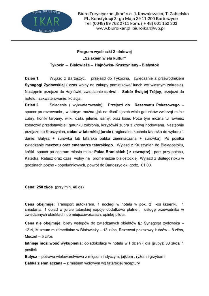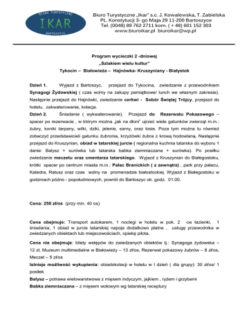 Program wycieczki 2 -dniowej „Szlakiem wielu kultur” Tykocin – Białowieża – Hajnówka- Kruszyniany - Białystok Dzień 1. Wyjazd z Bartoszyc, przejazd do Tykocina, zwiedzanie z przewodnikiem Synagogi Żydowskiej ( czas wolny na zakupy pamiątkowe/ lunch we własnym zakresie). Następnie przejazd do Hajnówki, zwiedzanie cerkwi - Sobór Świętej Trójcy, przejazd do hotelu, zakwaterowanie, kolacja. Dzień 2. Śniadanie ( wykwaterowanie). Przejazd do Rezerwatu Pokazowego – spacer po rezerwacie , w którym można „jak na dłoni” ujrzeć wiele gatunków zwierząt m.in.: żubry, koniki tarpany, wilki, dziki, jelenie, sarny, oraz łosie. Poza tym można tu również zobaczyć przedstawicieli gatunku żubronia, krzyżówki żubra z krową hodowlaną. Następnie przejazd do Kruszynian, obiad w tatarskiej jurcie ( regionalna kuchnia tatarska do wyboru 1 danie: Balysz + surówka lub tatarska babka ziemniaczana + surówka). Po posiłku zwiedzanie meczetu oraz cmentarza tatarskiego. Wyjazd z Kruszynian do Białegostoku, krótki spacer po centrum miasta m.in.: Pałac Branickich ( z zewnątrz) , park przy pałacu, Katedra, Ratusz oraz czas wolny na promenadzie białostockiej. Wyjazd z Białegostoku w godzinach późno - popołudniowych, powrót do Bartoszyc ok. godz. 01.00. Cena: 250 zł/os (przy min. 40 os) Cena obejmuje: Transport autokarem, 1 noclegi w hotelu w pok. 2 -os łazienki, 1 śniadania, 1 obiad w jurcie tatarskiej napoje dodatkowo płatne , usługę przewodnika w zwiedzanych obiektach lub miejscowościach, opiekę pilota. Cena nie obejmuje: bilety wstępów do zwiedzanych obiektów tj.: Synagoga żydowska – 12 zł, Muzeum multimedialne w Białowieży – 13 zł/os, Rezerwat pokazowy żubrów – 8 zł/os, Meczet – 5 zł/os Istnieje możliwość wykupienia: obiadokolacji w hotelu w I dzień ( dla grupy): 30 zł/os/ 1 posiłek Balysz – potrawa wielowarstwowa z mięsem indyczym, jajkiem , ryżem i grzybami Babka ziemniaczana – z mięsem wołowym wg tatarskiej receptury