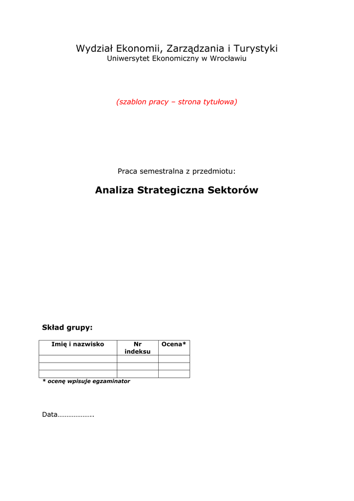 Wydział Ekonomii, Zarządzania i Turystyki Uniwersytet Ekonomiczny w Wrocławiu (szablon pracy – strona tytułowa) Praca semestralna z przedmiotu: Analiza Strategiczna Sektorów Skład grupy: Imię i nazwisko Nr indeksu * ocenę wpisuje egzaminator Data……………….. Ocena* Praca zaliczeniowa z Analizy Strategicznej Sektorów_2015 Zakres i zasady przygotowania oraz weryfikacji pracy semestralnej: I. Temat i cel pracy: Cel: Zidentyfikuj niszę rynkową dla inwestora z siedzibą w Jeleniej Górze. Oceń atrakcyjność wybranej niszy. Założenie: Obywatel X jest typem aktywnego inwestora. Jest też miłośnikiem Jeleniej Góry i Dolnego Śląska. Pomóż znaleźć niszę rynkową, która będzie dla niego atrakcyjnym miejscem inwestycji. Najważniejszym wyznacznikiem tej atrakcyjności jest wzrost w rynku oraz jego zyskowność, liczą się również bariery wejścia do sektora (inwestor zakłada dominację kapitału obcego). II. Harmonogramowanie projektu Założenie: Częścią integralną projektu jest jego harmonogram wykonywany dla celów racjonalnego planowania terminów i podziału obowiązków pracy nad projektem oraz ich weryfikacji. Części 1. 2. 3. 4. 5. składowe harmonogramu: etap pracy przewidziany termin przewidziane osoby odpowiedzialne termin rzeczywistej realizacji osoba rzeczywiście realizująca Przykład**: Etap Planowanie Termin Odpowiedzialny Uwagi do etapu Realizacja Termin Wykonawca ** harmonogram może przyjąć dowolną formę, powinien jednak uwzględniać przynajmniej 5 wymienionych powyżej elementów UWAGA: Planowany harmonogram pracy należy złożyć przed zakończeniem projektu, w dniu wyznaczonym przez prowadzącą! Planowane działania oraz harmonogram uwzględniający rzeczywistą realizację działań w projekcie należy natomiast złożyć w dniu zaliczenia projektu. III. Warunki zaliczenia i zakres prac Warunkiem przystąpienia do zaliczenia przedmiotu jest przygotowanie (indywidualnie lub w grupie – max. 3 osoby) opracowania dotyczącego identyfikacji i oceny atrakcyjności niszy rynkowej 1 na rynku lokalnym lub/i dla lokalnego inwestora. Elementy obowiązkowe opracowań: 1. Harmonogram prac 2. Przesłanki wyboru tematu – informacja o źródłach pomysłu, krótkie słowo wstępne autora/ów. 3. Definicja i krótka charakterystyka wybranej niszy, w tym uzasadnienie jej zajęcia w obszarze Miasta Jelenia Góra i okolic. 4. Udowodnienie istnienia niszy rynkowej – rzetelne, aktualne i wiarygodne dane statystyczne, w tym dane benchmarkingowe wskazujące na istniejący, potencjalny czy rosnący popyt oraz ustalenie braku podaży w określonym zakresie na obszarze Jeleniej Góry np. poprzez analizę mapy grup strategicznych czy inne dane dotyczące potencjalnej konkurencji. 5. Ustalenie atrakcyjności niszy rynkowej w ujęciu: perspektyw i skali wzrostu popytu, zyskowności (np. nakłady vs efekty) oraz barier wejścia i wyjścia (dla ustalenia zagrożenia konkurencją). 6. Określenie mnożnika zysku dla proponowanej działalności. Nisza rynkowa to miejsce nie zapełnione działalnością, na którą jednak istnieje lub mógłby istnieć popyt, to również niewykorzystywany do tej pory w sektorze sposób pozycjonowania oferty (konfiguracji produktu, projektowania obsługi, itd), gwarantujący generowanie nowego popytu. 1 2 Praca zaliczeniowa z Analizy Strategicznej Sektorów_2015 7. Opcje finansowania działalności, w tym propozycje współpracy w tym zakresie potencjalnego inwestora i pomysłodawcy/ów. 8. Tabela zbiorcza (skrót pracy na potrzeby Giełdy Pomysłów, edycja 2016) – patrz poniżej Tabela: Wytyczne dla przygotowania skróconej wersji projektu niszy rynkowych na potrzeby Giełdy Pomysłów 2014 Element obowiązkowy Nazwa własna i merytoryczne wyjaśnienie Dowód na istnienie niszy na wybranym obszarze (jakim?) Opłacalność niszy Dla kogo nisza? Lokalizacja działalności Mnożnik zysku w niszy Kto jest właścicielem pomysłu? Propozycja współpracy z inwestorem. Zewnętrzne źródła finansowania. Krótka charakterystyka elementu Nazwa w postaci hasła reklamowego bądź innego krótkiego „barwnego” sformułowania. Uzupełnieniem jest merytoryczny, precyzyjny opis, jakiej działalności dotyczy projekt. Opis strony podażowej (brak konkurentów, brak działań konkurentów w określonych obszarach istniejącego sektora) Opis strony popytowej (jaki jest szacowany popyt, na jakiej podstawie to ustalono, czyli źródła danych) Szacunkowe nakłady (na podstawie jakich danych liczone) vs szacunkowe przychody (jak liczone) Opis cech, predyspozycji, wiedzy, zainteresowań potencjalnego inwestora, które mogłyby pomóc w skutecznym i efektywnym zapełnieniu niszy Ile punktów, gdzie dokładnie i dlaczego właśnie tam? Czy istnieją opcje lokalizacji? Jak można czerpać dodatkowe zyski z faktu podjęcia tej działalności, aktualnie lub w przyszłości? Lista osób, dane kontaktowe Opis elementu Jaki udział w nakładach i zyskach ma mieć inwestor, a jaki pomysłodawca? Rola pomysłodawcy w realizacji inicjatywy? Jaki inne, poza kapitałem inwestora, istnieją źródła finansowania projektu. Inne: Np. wizualizacja pomysłu (rysunek, logo) IV. Ocena prac Założenie: Pracę należy złożyć w formie elektronicznej do …..(data do ustalenia), na adres: [email protected] w tytule wpisując: [skrót nazwy przedmiotu_nazwisko wybranej osoby z grupy_2013] np. ASS_Iksiński_2016 Praca może uzyskać maksymalnie 6 punktów. Oceny: Do 2,5 pkt – niedostateczny 3,0 – dostateczny 3,5 – dostateczny plus 4,0 - dobry 4,5 – dobry plus 5,0-6,0 – bardzo dobry Kryteria i sposób oceny: Kryteria 1. Kompletność i poprawność merytoryczna (max. 3 pkt) 2. Źródła (literatura, badania, inne) (max.2 pkt) 3. Harmonogram (obecność, czytelność) (max.1 pkt) Przygotowała: 3 Praca zaliczeniowa z Analizy Strategicznej Sektorów_2015 Dr Anna Baraniecka 4