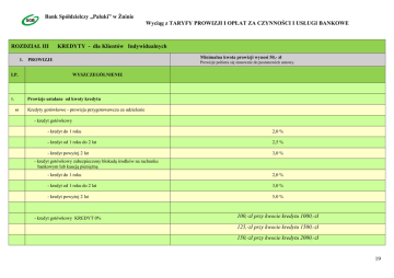 Bank Spółdzielczy „Pałuki” w Żninie Wyciąg z TARYFY PROWIZJI I OPŁAT ZA CZYNNOŚCI I USŁUGI BANKOWE ROZDZIAŁ III 1. KREDYTY - dla Klientów Indywidualnych Minimalna kwota prowizji wynosi 50,- zł PROWIZJE Prowizje pobiera się stosownie do postanowień umowy. WYSZCZEGÓLNIENIE LP. Prowizje ustalane od kwoty kredytu 1. a) Kredyty gotówkowe - prowizja przygotowawcza za udzielenie - kredyt gotówkowy - kredyt do 1 roku 2,0 % - kredyt od 1 roku do 2 lat 2,5 % - kredyt powyżej 2 lat 3,0 % - kredyt gotówkowy zabezpieczony blokadą środków na rachunku bankowym lub kaucją pieniężną - kredyt do 1 roku 2,0 % - kredyt od 1 roku do 2 lat 3,0 % - kredyt powyżej 2 lat 5,0 % - kredyt gotówkowy KREDYT 0% 100,-zł przy kwocie kredytu 1000,-zł 125,-zł przy kwocie kredytu 1500,-zł 150,-zł przy kwocie kredytu 2000,-zł 19 175,-zł przy kwocie kredytu 2500,-zł 200,-zł przy kwocie kredytu 3000,-zł 225,-zł przy kwocie kredytu 3500,-zł 250,-zł przy kwocie kredytu 4000,-zł 275,-zł przy kwocie kredytu 4500,-zł 300,-zł przy kwocie kredytu 5000,-zł b) Kredyty w ROR - prowizja przygotowawcza za udzielenie - prowizja z tytułu obsługi, po każdych 12 miesiącach w okresie obowiązywania umowy kredytowej - prowizja za odnowienie limitu kredytu na kolejny okres obowiązywania umowy kredytowej c) 2. 1,0 % 1,0 % Pozostałe kredyty - prowizja przygotowawcza za udzielenie: - kredyt mieszkaniowy 1,5 % - pożyczka hipoteczna 2,0 % Prowizja z tytułu prolongaty ustalana od prolongowanej kwoty kredytów - za zmianę warunków spłaty kredytów i sporządzenie aneksu 0,5 % oraz - za wydłużenie okresu kredytowania za każdy rozpoczęty okres półroczny 0,5 % - maksymalna kwota prowizji 3. 1,0 % Prowizja za obniżenie limitu kredytu w ROR w okresie kredytowania (bez aneksu umowy) 500,- zł 0,0 % 20 2. OPŁATY 1. Wydanie na wniosek klienta zaświadczenia stwierdzającego wysokość zadłużenia z tyt. kredytów bankowych i innych tytułów oraz zaświadczeń, że klient nie jest dłużnikiem Banku 2. Sporządzanie i wysyłanie w przypadkach określonych w umowie kredytu/pożyczki/o kartę (nie więcej niż jedno w okresie rozliczeniowym) monitu, upomnienia lub wezwania do zapłaty 3. Sporządzenie odpisu umowy o kredyt 30,-zł 4. Promesa kredytowa 50,-zł 5. Zlecenie klienta - pobierania z rachunku dodatkowych rat kredytu poza określonymi w Harmonogramie 30,-zł 6. Zezwolenie na bezciężarowe odłączenie 50,-zł 7 Z tytułu czynności związanych ze zmianą zabezpieczenia 100,- 8. Z tytułu zmian treści i warunków umowy o kredyt 100,- 30,-zł koszt listu poleconego za potwierdzeniem odbioru wg. stawki operatora pocztowego dla kredytów udzielonych według umów od 11 marca 2016 roku nie pobiera się opłaty Żnin, kwiecień 2016r. 21