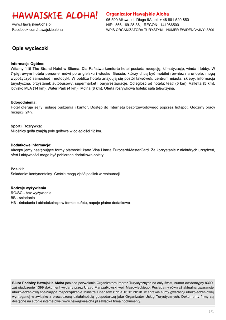 Organizator Hawajskie Aloha www.HawajskieAloha.pl Facebook.com/hawajskiealoha 06-500 Mława, ul. Długa 9A, tel. + 48 881-520-850 NIP: 566-169-28-36, REGON: 141986500 WPIS ORGANIZATORA TURYSTYKI - NUMER EWIDENCYJNY: 8300 Opis wycieczki Informacje Ogólne: Witamy 115 The Strand Hotel w Sliema. Dla Państwa komfortu hotel posiada recepcję, klimatyzację, winda i lobby. W 7-piętrowym hotelu personel mówi po angielsku i włosku. Goście, którzy chcą być mobilni również na urlopie, mogą wypożyczyć samochód i motocykl. W pobliżu hotelu znajdują się postój taksówek, centrum miasta, sklepy, informacja turystyczna, przystanek autobusowy, supermarket i bary/restauracje. Odległość od hotelu: teatr (5 km), Valletta (5 km), lotnisko MLA (14 km), Water Park (4 km) i Mdina (8 km). Oferta rozrywkowa hotelu: sala telewizyjna. Udogodnienia: Hotel oferuje sejfy, usługę budzenia i kantor. Dostęp do Internetu bezprzewodowego poprzez hotspot. Godziny pracy recepcji: 24h. Sport i Rozrywka: Miłośnicy golfa znajdą pole golfowe w odległości 12 km. Dodatkowe Informacje: Akceptujemy następujące formy płatności: karta Visa i karta Eurocard/MasterCard. Za korzystanie z niektórych urządzeń, ofert i aktywności mogą być pobierane dodatkowe opłaty. Posiłki: Śniadanie: kontynentalny. Goście mogą zjeść posiłek w restauracji. Rodzaje wyżywienia RO/SC - bez wyżywienia BB - śniadania HB - śniadania i obiadokolacje w formie bufetu, napoje płatne dodatkowo Biuro Podróży Hawajskie Aloha posiada pozwolenie Organizatora Imprez Turystycznych na cały świat, numer ewidencyjny 8300, zaświadczenie 1399 dokument wydany przez Urząd Marszałkowski woj. Mazowieckiego. Posiadamy również aktualną gwarancje ubezpieczeniową spełniająca rozporządzenie Ministra Finansów z dnia 16.12.2010r. w sprawie sumy gwarancji ubezpieczeniowej wymaganej w związku z prowadzoną działalnością gospodarczą jako Organizator Usług Turystycznych. Dokumenty firmy są dostępne na stronie internetowej www.hawajskiealoha.pl zakładka firma / dokumenty. 1/1