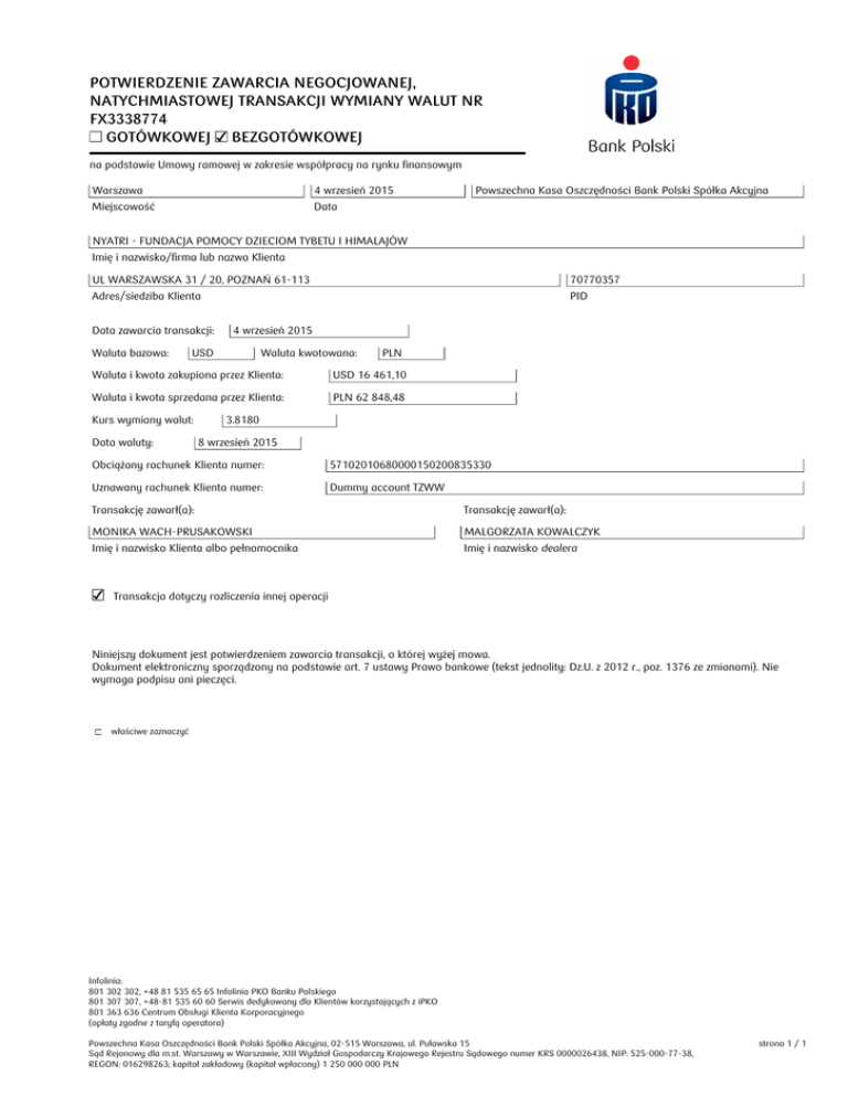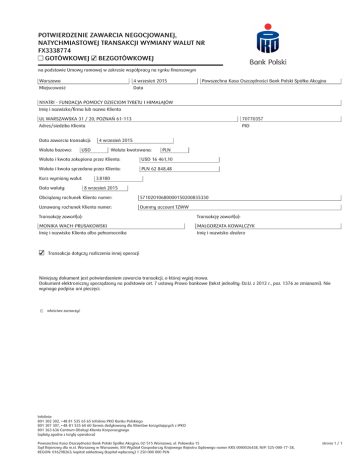 POTWIERDZENIE ZAWARCIA NEGOCJOWANEJ, NATYCHMIASTOWEJ TRANSAKCJI WYMIANY WALUT NR FX3338774 GOTÓWKOWEJ BEZGOTÓWKOWEJ na podstawie Umowy ramowej w zakresie współpracy na rynku finansowym Warszawa 4 wrzesień 2015 Powszechna Kasa Oszczędności Bank Polski Spółka Akcyjna Miejscowość Data NYATRI - FUNDACJA POMOCY DZIECIOM TYBETU I HIMALAJÓW Imię i nazwisko/firma lub nazwa Klienta UL WARSZAWSKA 31 / 20, POZNAŃ 61-113 70770357 Adres/siedziba Klienta PID Data zawarcia transakcji: Waluta bazowa: 4 wrzesień 2015 USD Waluta kwotowana: PLN Waluta i kwota zakupiona przez Klienta: USD 16 461,10 Waluta i kwota sprzedana przez Klienta: PLN 62 848,48 Kurs wymiany walut: Data waluty: 3.8180 8 wrzesień 2015 Obciążany rachunek Klienta numer: 57102010680000150200835330 Uznawany rachunek Klienta numer: Dummy account TZWW Transakcję zawarł(a): Transakcję zawarł(a): MONIKA WACH-PRUSAKOWSKI MALGORZATA KOWALCZYK Imię i nazwisko Klienta albo pełnomocnika Imię i nazwisko dealera Transakcja dotyczy rozliczenia innej operacji Niniejszy dokument jest potwierdzeniem zawarcia transakcji, o której wyżej mowa. Dokument elektroniczny sporządzony na podstawie art. 7 ustawy Prawo bankowe (tekst jednolity: Dz.U. z 2012 r., poz. 1376 ze zmianami). Nie wymaga podpisu ani pieczęci. właściwe zaznaczyć Infolinia: 801 302 302, +48 81 535 65 65 Infolinia PKO Banku Polskiego 801 307 307, +48-81 535 60 60 Serwis dedykowany dla Klientów korzystających z iPKO 801 363 636 Centrum Obsługi Klienta Korporacyjnego (opłaty zgodne z taryfą operatora) Powszechna Kasa Oszczędności Bank Polski Spółka Akcyjna, 02-515 Warszawa, ul. Puławska 15 Sąd Rejonowy dla m.st. Warszawy w Warszawie, XIII Wydział Gospodarczy Krajowego Rejestru Sądowego numer KRS 0000026438, NIP: 525-000-77-38, REGON: 016298263; kapitał zakładowy (kapitał wpłacony) 1 250 000 000 PLN strona 1 / 1