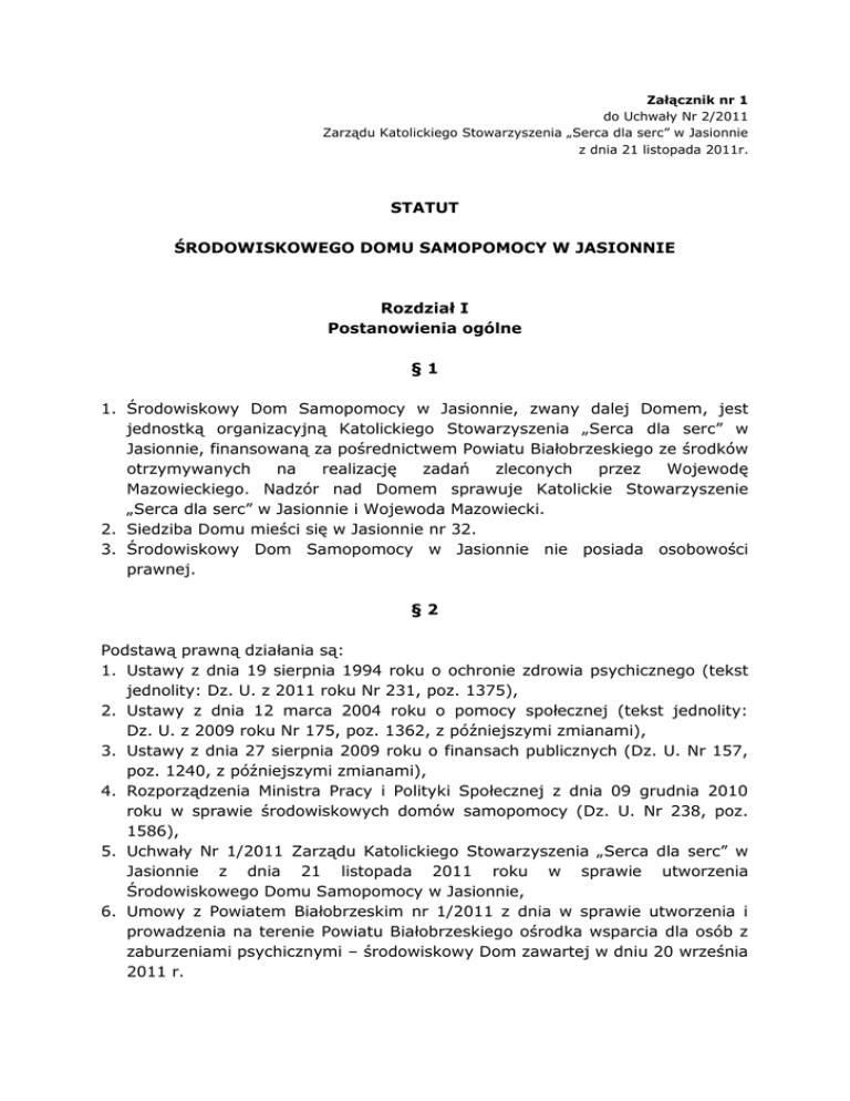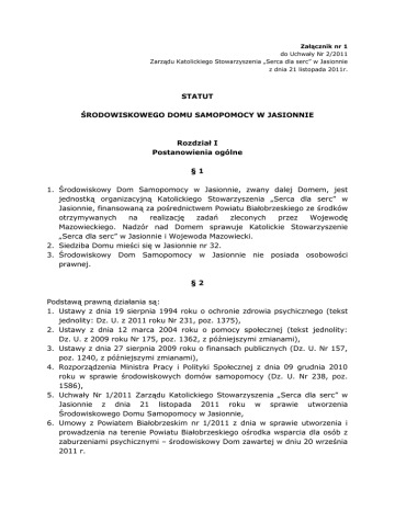 Załącznik nr 1 do Uchwały Nr 2/2011 Zarządu Katolickiego Stowarzyszenia „Serca dla serc” w Jasionnie z dnia 21 listopada 2011r. STATUT ŚRODOWISKOWEGO DOMU SAMOPOMOCY W JASIONNIE Rozdział I Postanowienia ogólne §1 1. Środowiskowy Dom Samopomocy w Jasionnie, zwany dalej Domem, jest jednostką organizacyjną Katolickiego Stowarzyszenia „Serca dla serc” w Jasionnie, finansowaną za pośrednictwem Powiatu Białobrzeskiego ze środków otrzymywanych na realizację zadań zleconych przez Wojewodę Mazowieckiego. Nadzór nad Domem sprawuje Katolickie Stowarzyszenie „Serca dla serc” w Jasionnie i Wojewoda Mazowiecki. 2. Siedziba Domu mieści się w Jasionnie nr 32. 3. Środowiskowy Dom Samopomocy w Jasionnie nie posiada osobowości prawnej. §2 Podstawą prawną działania są: 1. Ustawy z dnia 19 sierpnia 1994 roku o ochronie zdrowia psychicznego (tekst jednolity: Dz. U. z 2011 roku Nr 231, poz. 1375), 2. Ustawy z dnia 12 marca 2004 roku o pomocy społecznej (tekst jednolity: Dz. U. z 2009 roku Nr 175, poz. 1362, z późniejszymi zmianami), 3. Ustawy z dnia 27 sierpnia 2009 roku o finansach publicznych (Dz. U. Nr 157, poz. 1240, z późniejszymi zmianami), 4. Rozporządzenia Ministra Pracy i Polityki Społecznej z dnia 09 grudnia 2010 roku w sprawie środowiskowych domów samopomocy (Dz. U. Nr 238, poz. 1586), 5. Uchwały Nr 1/2011 Zarządu Katolickiego Stowarzyszenia „Serca dla serc” w Jasionnie z dnia 21 listopada 2011 roku w sprawie utworzenia Środowiskowego Domu Samopomocy w Jasionnie, 6. Umowy z Powiatem Białobrzeskim nr 1/2011 z dnia w sprawie utworzenia i prowadzenia na terenie Powiatu Białobrzeskiego ośrodka wsparcia dla osób z zaburzeniami psychicznymi – środowiskowy Dom zawartej w dniu 20 września 2011 r. Rozdział II Cel i przedmiot działania §3 1. Dom jest placówką pobytu dziennego przeznaczoną dla osób psychicznie chorych obojga płci (typ Domu A). Osoby te nazywane uczestnikami Domu wymagają wsparcia na płaszczyźnie biopsychospołecznej. 2. Podstawowym zadaniem Domu jest przede wszystkim podtrzymywanie i rozwijanie umiejętności uczestników, niezbędnych do możliwie jak najbardziej samodzielnego życia. 3. Działalność Domu ukierunkowana jest na pomoc w przezwyciężaniu trudnych sytuacji życiowych i rozwiązywaniu codziennych problemów osób niepełnosprawnych. Ważnym elementem w pracy Domu jest integracja uczestników ze społecznością lokalną poprzez ich społeczną aktywizację. 4. Działalność Domu jest otwarta na potrzeby środowiska w zakresie promocji i ochrony zdrowia psychicznego. §4 1. Utrzymanie i funkcjonowanie Domu finansowane jest ze środków na zadania zlecone z zakresu administracji rządowej, przekazywanych przez Wojewodę Mazowieckiego za pośrednictwem Powiatu Białobrzeskiego. Dom funkcjonuje na podstawie planu finansowego opracowanego przez Katolickie Stowarzyszenie „Serca dla serc” w Jasionnie. 2. Nadzór nad Domem sprawuje Katolickie Stowarzyszenie „Serca dla serc” w Jasionnie oraz Starosta Białobrzeski. 3. Na podstawie zawartych porozumień między Powiatem Białobrzeskim a jednostkami samorządów terytorialnych ościennych z usług świadczonych przez Dom korzystać mogą osoby spoza Powiatu Białobrzeskiego. §5 Do zadań Domu należy: 1. Optymalizacja funkcjonowania uczestników na płaszczyźnie zdrowotnej, społecznej i zawodowej poprzez adekwatne formułowanie oferty terapeutycznej Domu. 2. Organizowanie i realizacja działań integracyjnych sprzyjających rehabilitacji społecznej i zawodowej uczestników. 3. Prowadzenie działań o charakterze informacyjno-promocyjnym celem kształtowania adekwatnego wizerunku osób niepełnosprawnych i zmiany wobec nich postaw społecznych. 4. Inicjowanie i prowadzenie działań mających na celu przeciwdziałanie społecznemu wykluczeniu i marginalizacji uczestników poprzez aktywny udział w wydarzeniach społecznych o charakterze lokalnym i ponadlokalnym. 5. Propagowanie idei pełnego uczestnictwa w życiu społecznym osób niepełnosprawnych. 6. Promocja talentów osób niepełnosprawnych oraz ułatwianie realizacji ich zainteresowań i pasji twórczych. §6 Celem działalności Domu jest wspieranie uczestników i ich rodzin oraz kompensowanie skutków niepełnosprawności w sferze zdrowia psychicznego i funkcjonowania społecznego poprzez: 1. Stwarzanie warunków do nabycia umiejętności wykonywania podstawowych czynności życia codziennego, doskonalenia już nabytych oraz realizacji zadań życiowych. 2. Podtrzymywanie i rozwijanie umiejętności niezbędnych do osiągania maksymalnej autonomii w funkcjonowaniu. 3. Wsparcie psychologiczne i terapeutyczne. 4. Zapewnienie opieki lekarskiej i pielęgniarskiej, rehabilitację społeczną i zawodową. 5. Stymulację osobistego rozwoju poprzez opracowanie indywidualnych planów wspierająco-aktywizujących i wdrażanie ich w życie. 6. Współpracę z organizacjami społecznymi, stowarzyszeniami, Kościołem Katolickim, placówkami oświatowymi, kulturalnymi i samorządami lokalnymi w celu integracji osób z zaburzeniami psychicznymi i ich rodzin ze środowiskiem. 7. Kształtowanie wobec osób z zaburzeniami psychicznymi i ich rodzin właściwych postaw społecznych, a zwłaszcza zrozumienia, tolerancji, życzliwości, a także przeciwdziałania ich dyskryminacji. 8. Umożliwienie udziału w terapii zajęciowej indywidualnej, grupowej, grupach wsparcia, wspieraniu samopomocowym w zakresie zdrowia psychicznego. 9. Współpracę z rodzinami osób korzystających z działalności Domu. 10.Poradnictwo. 11.Informację. 12.Wsparcie i pomoc w rozwiązywaniu problemów socjalnych i życiowych. 13.Zaspokajanie w miarę możliwości tych potrzeb, które wpływają w dużym stopniu na rozwój psychiczny, bezpieczeństwo, dbałość o sprawy higieniczne, odżywiania, ruchu, odpoczynku, kontaktu, godności osobistej, kontaktu emocjonalnego, sensu życia. 14.Zapobieganie stanom powodującym konieczność ciąg