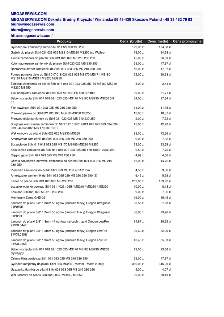 MEGASERWIS.COM MEGASERWIS.COM Dekrets Brudny Krzysztof Wislanska 56 43-430 Skoczow Poland +48 33 482 79 93 [email protected] [email protected] http://megaserwis.com/ Produkty Cylinder tłok kompletny zamiennik do Stihl 023 MS 230 Cena (brutto) Cena (netto) Cena promocyjna 129,00 zł 104,88 zł Gaźnik do pilarek Stihl 021 023 025 MS210 MS230 MS250 typ Walbro 79,00 zł 64,23 zł Tłumik zamiennik do pilarek Stihl 021 023 025 MS 210 230 250 45,00 zł 36,59 zł Koło magnesowe zamiennik do pilarek Stihl 023 025 MS 230 250 59,00 zł 47,97 zł Rozrusznik starter zamiennik do Stihl 021 023 025 MS 210 230 250 59,00 zł 47,97 zł Pompa pompka oleju do Stihl 017 018 021 023 025 MS170 MS171 MS180 MS181 MS210 MS211 MS230 MS250 25,00 zł 20,33 zł 3,00 zł 2,44 zł Tłok kompletny zamiennik do Stihl 023 MS 230 FS 400 SP 400 39,00 zł 31,71 zł Bęben sprzęgła Stihl 017 018 021 023 025 MS170 MS180 MS230 MS250 3/8 6Z 34,00 zł 27,64 zł Filtr powietrza Stihl 021 023 025 MS 210 230 250 14,00 zł 11,38 zł Przewód paliwa do Stihl 021 023 025 MS210 MS230 MS250 13,00 zł 10,57 zł 9,00 zł 7,32 zł Sprężyna rozrusznika zamiennik do Stihl 017 018 019 021 023 025 029 034 036 039 044 046 066 MS 170 180 190T 15,00 zł 12,20 zł Wał korbowy do pilarki Stihl 023 025 MS230 MS250 89,00 zł 72,36 zł 9,00 zł 7,32 zł 29,00 zł 23,58 zł Koło linowe zamiennik do Stihl 017 018 021 023 025 MS 170 180 210 230 250 9,50 zł 7,72 zł Cięgno gazu Stihl 021 023 025 MS 210 230 250 4,99 zł 4,06 zł 55,00 zł 44,72 zł 4,50 zł 3,66 zł Zabierak zamiennik do pilarki Stihl 017 018 021 023 025 MS170 MS180 MS210 MS230 MS250 Przewód oleju zamiennik do Stihl 021 023 025 MS 210 230 250 Amortyzator zamiennik do Stihl 023 025 029 MS 230 250 290 Sprzęgło do Stihl 017 018 023 025 MS170 MS180 MS230 MS250 Cewka zapłonowa iskrownik zamiennik do pilarek Stihl 021 023 025 MS 210 230 250 Pierścień zamiennik do pilarki Stihl 023 MS 230 40x1.2 mm Amortyzator zamiennik do Stihl 023 025 029 MS 230 250 290 (2) Karter do pilarki Stihl 021 023 025 MS 230 250 Łożysko wału korbowego Stihl 021 / 023 / 025 / MS210 / MS230 / MS250 Kolektor Stihl 023 025 MS 210 230 250 6,49 zł 5,28 zł 209,00 zł 169,92 zł 10,00 zł 8,13 zł 9,00 zł 7,32 zł Membrany Zama GND-35 19,00 zł 15,45 zł Łańcuch do pilarki 3/8" 1,3mm 50 ogniw (łańcuch tnący) Oregon Xtraguard 91P050E 33,55 zł 27,28 zł Łańcuch do pilarki 3/8" 1,3mm 55 ogniw (łańcuch tnący) Oregon Xtraguard 91P055E 36,85 zł 29,96 zł Łańcuch do pilarki 3/8" 1,3mm 44 ogniwa (łańcuch tnący) Oregon LowPro 91VXL044E 34,87 zł 28,35 zł Łańcuch do pilarki 3/8" 1,3mm 50 ogniw (łańcuch tnący) Oregon LowPro 91VXL050E 39,60 zł 32,20 zł Łańcuch do pilarki 3/8" 1,3mm 55 ogniw (łańcuch tnący) Oregon LowPro 91VXL055E 43,45 zł 35,33 zł Bęben sprzęgła Stihl 017 018 021 023 025 MS170 MS180 MS230 MS250 pływający 29,00 zł 23,58 zł Osłona filtra powietrza Stihl 021 023 025 MS 210 230 250 59,00 zł 47,97 zł 389,00 zł 316,26 zł 5,00 zł 4,07 zł 99,00 zł 80,49 zł Cylinder kompletny do pilarki Stihl 023 MS230 - Meteor - Made in Italy Uszczelka tłumika do pilarki Stihl 021 023 025 MS 210 230 250 Wał korbowy do pilarki Stihl 023, 025, MS230, MS250