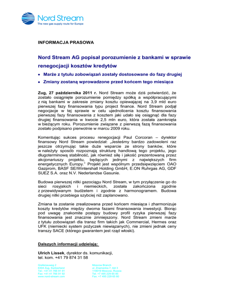 INFORMACJA PRASOWA Nord Stream AG popisał porozumienie z bankami w sprawie renegocjacji kosztów kredytów Marże z tytułu zobowiązań zostały dostosowane do fazy drugiej Zmiany zostaną wprowadzone przed końcem tego miesiąca Zug, 27 października 2011 r. Nord Stream może dziś potwierdzić, że zostało osiągnięte porozumienie pomiędzy spółką a współpracującymi z nią bankami w zakresie zmiany kosztu opiewającej na 3,9 mld euro pierwszej fazy finansowania typu project finance. Nord Stream podjął negocjacje w tej sprawie w celu ujednolicenia kosztu finansowania pierwszej fazy finansowania z kosztem jaki udało się osiągnąć dla fazy drugiej finansowania w kwocie 2,5 mln euro, która została zamknięta w bieżącym roku. Porozumienie związane z pierwszą fazą finansowania zostało podpisano pierwotnie w marcu 2009 roku. Komentując sukces procesu renegocjacji Paul Corcoran – dyrektor finansowy Nord Stream powiedział: „Jesteśmy bardzo zadowoleni raz jeszcze otrzymując takie duże wsparcie ze strony banków, które w należyty sposób rozpoznają strukturę handlową tego projektu, jego długoterminową stabilność, jak również siłę i jakość prezentowaną przez akcjonariuszy projektu, będących jednymi z największych firm energetycznych Europy.” Projekt jest wspólnym przedsięwzięciem OAO Gazprom, BASF SE/Wintershall Holding GmbH, E.ON Ruhrgas AG, GDF SUEZ S.A. oraz N.V. Nederlandse Gasunie. Budowa pierwszej nitki gazociągu Nord Stream, w tym przyłączenie go do sieci rosyjskich i niemieckich, została zakończona zgodnie z przewidywanym budżetem i zgodnie z harmonogramem. Budowa drugiej nitki przebiega szybciej niż zaplanowano. Zmiana ta zostanie zrealizowana przed końcem miesiąca i zharmonizuje koszty kredytów między dwoma fazami finansowania inwestycji. Biorąc pod uwagę znakomite postępy budowy profil ryzyka pierwszej fazy finansowania jest znacznie zmniejszony. Nord Stream zmieni marże z tytułu zobowiązań dla transz firm takich jak Commercial, Hermes oraz UFK (niemiecki system pożyczek niewiązanych), nie zmieni jednak ceny transzy SACE (którego gwarantem jest rząd włoski). Dalszych informacji udzielają: Ulrich Lissek, dyrektor ds. komunikacji, tel. kom. +41 79 874 31 58 Grafenauweg 2 6304 Zug, Switzerland Tel.: +41 41 766 91 91 Fax: +41 41 766 91 92 www.nord-stream.com Moscow Branch ul. Znamenka 7, bld 3 119019 Moscow, Russia Tel. +7 495 229 65 85 Fax. +7 495 229 65 80 Frank Dudley, menedżer ds. relacji z mediami, tel. kom. +41 79 536 68 26 E-mail: [email protected] Uwagi do wydawców Nord Stream (Gazociąg Północny) jest gazociągiem biegnącym po dnie Morza Bałtyckiego i łączącym Rosję z krajami Unii Europejskiej. W 2008 r. Unia Europejska zaimportowała ok. 320 mld metrów sześciennych gazu ziemnego, a do 2030 r. liczba ta ma wzrosnąć do ponad 500 mld metrów sześciennych. Do tego czasu UE potrzebować będzie dodatkowych dostaw gazu wynoszących 188 metrów sześciennych gazu ziemnego rocznie. (Źródło: IEA, 2011). Gazociąg Północny, łączący jedne z największych złóż gazu ziemnego z Europą, będzie pokrywał prawie jedną trzecią zapotrzebowania na dodatkowy gaz. Projekt będzie istotnym wkładem w długoterminowe zabezpieczenie dostaw i kamieniem milowym w energetycznym partnerstwie pomiędzy Unią Europejską a Rosją. Nord Stream AG planuje uruchomienie pierwszej z dwóch nitek gazociągu w 2011 r. Obie nitki będą mieć po ok. 1220 km i przepustowość po 27,5 mld metrów sześciennych surowca rocznie. Pełna przepustowość gazociągu, czyli 55 mld metrów sześciennych, będzie możliwa po uruchomieniu drugiej nitki. Gazociąg Północny będzie dostarczał gaz do ponad 26 milionów gospodarstw domowych w Europie. Nord Stream AG jest międzynarodową spółką joint venture założoną w celu planowania, budowy i operacji związanych z obsługą nowego gazociągu biegnącego po dnie Bałtyku. W rękach rosyjskiej spółki OAO Gazprom pozostaje 51 proc. udziałów spółki. Niemieckie spółki BASF SE/Wintershall Holding GmbH i E.ON Ruhrgas AG posiadają po 15,5 proc. udziałów, natomiast duńska spółka gazociągowa N.V. Nederlandse Gasunie i francuska spółka energetyczna GDF SUEZ S.A. posiadają po 9 proc. akcji. Gazociąg Północny jest wymieniany w wytycznych dla transeuropejskich sieci energetycznych Unii Europejskiej. W 2006, r. projekt został uznany przez Komisję Europejską, Parlament Europejski i Radę Unii Europejskiej jako „projekt leżący w interesie Europy”. Gazociąg Północny jest zatem uznawany za kluczowy projekt pod względem zaspokojenia infrastruktury energetycznej Europy. Budowę Gazociągu Północnego rozpoczęto w kwietniu 2010 r. po zakończeniu planowania i badań dotyczących wpływu gazociągu na środowisko zwieńczonych sporządzeniem raportu z oceny oddziaływania na środowisko na całej jego długości. Do budowy gazociągu zostaną zaangażowane trzy specjalistyczne statki-platformy: Castoro Sei wykonuje większość prac na Bałtyku. Castoro Dieci zakończył już swoje prace na wodach niemieckich gdzie budował część przybrzeżną obu nitek gazociągu. Solitaire należący do koncernu Allseas, będącego podwykonawcą dla Saipem zakończył kładzenie rur w Zatoce Fińskiej w sierpniu 2011 r. Uruchomienie pierwszej nitki gazociągu jest planowane na 2011 r., drugiej na 2012 r. Grafenauweg 2 6304 Zug, Switzerland Tel.: +41 41 766 91 91 Fax: +41 41 766 91 92 www.nord-stream.com Moscow Branch ul. Znamenka 7, bld 3 119019 Moscow, Russia Tel. +7 495 229 65 85 Fax. +7 495 229 65 80