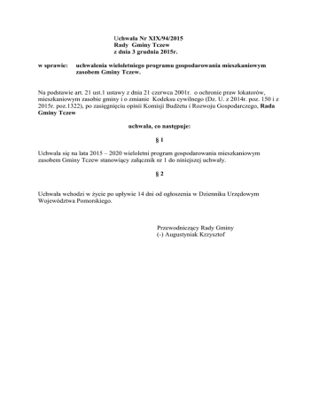 Uchwała Nr XIX/94/2015 Rady Gminy Tczew z dnia 3 grudnia 2015r. w sprawie: uchwalenia wieloletniego programu gospodarowania mieszkaniowym zasobem Gminy Tczew. Na podstawie art. 21 ust.1 ustawy z dnia 21 czerwca 2001r. o ochronie praw lokatorów, mieszkaniowym zasobie gminy i o zmianie Kodeksu cywilnego (Dz. U. z 2014r. poz. 150 i z 2015r. poz.1322), po zasięgnięciu opinii Komisji Budżetu i Rozwoju Gospodarczego, Rada Gminy Tczew uchwala, co następuje: §1 Uchwala się na lata 2015 – 2020 wieloletni program gospodarowania mieszkaniowym zasobem Gminy Tczew stanowiący załącznik nr 1 do niniejszej uchwały. §2 Uchwała wchodzi w życie po upływie 14 dni od ogłoszenia w Dzienniku Urzędowym Województwa Pomorskiego. Przewodniczący Rady Gminy (-) Augustyniak Krzysztof UZASADNIENIE Ustawa z dnia 21 czerwca 2001r. o ochronie praw lokatorów, mieszkaniowym zasobie gminy i o zmianie Kodeksu cywilnego nałożyła na Radę Gminy obowiązek uchwalenia wieloletniego programu gospodarowania mieszkaniowym zasobem gminy. Proponowany 5-letni program obejmuje: 1) prognozę dotyczącą wielkości oraz stanu technicznego zasobu mieszkaniowego gminy; 2) analizę potrzeb oraz stan remontów i modernizacji wynikający ze stanu technicznego budynków i lokali, z podziałem na kolejne lata; 3) planowaną sprzedaż lokali w kolejnych latach; 4) zasady polityki czynszowej; 5) sposób i zasady zarządzania lokalami i budynkami wchodzącymi w skład mieszkaniowego zasobu gminy oraz przewidywane zmiany w zakresie zarządzania mieszkaniowym zasobem; 6) źródła finansowania gospodarki mieszkaniowej; 7) wysokość wydatków w kolejnych latach; 8) opis innych działań mających na celu poprawę wykorzystania i racjonalizację gospodarowania mieszkaniowym zasobem gminy. Załącznik do Uchwały Nr XIX/94/2015 Rady Gminy Tczew z dnia 3 grudnia 2015r. PROGRAM GOSPODAROWANIA MIESZKANIOWYM ZASOBEM GMINY NA LATA 2015-2020. I. PROGNOZA DOTYCZĄCA WIELKOŚCI ORAZ STANU TECHNICZNEGO ZASOBU MIESZKANIOWEGO. Zakłada się, że w latach 2015-2020 przy utrzymaniu dotychczas obowiązujących zasad sprzedaży , ustalonych odrębną Uchwałą Nr XXIV/412/2004 Rady Gminy Tczew z dnia 24 listopada 2004r. w sprawie przyznawania pierwszeństwa oraz ulg w nabywaniu lokali mieszkalnych stanowiących gminny zasób nieruchomości, w wyniku dokonanych sprzedaży na koniec 2020r. liczba lokali komunalnych zmniejszy się o 10%. Gmina posiada w swoim zasobie 12 lokali wyodrębnionych jako lokale socjalne w miejscowości Boroszewo nr 36, 1 lokal socjalny w miejscowości Łukocin nr 14, 1 lokal socjalny w miejscowości Bałdowo, ul. Miłosza 11 oraz 15 lokali komunalnych. Sprzedaż mieszkań komunalnych będzie miała wpływ na poziom uzyskanych wpływów czynszowych. Obecny stan techniczny budynków i lokali nie jest zadowalający, co wynika głównie z faktu, iż zasoby mieszkaniowe gminy, poza małymi wyjątkami, powstały przed 1945 rokiem lub tuż po wojnie. II. ANALIZA POTRZEB ORAZ PLAN REMONTÓW: Zakłada się, iż dotychczas przeprowadzane na bieżąco konieczne remonty oraz remonty planowane w okresie 2015-2020r. pozwolą na utrzymanie stanu technicznego zasobów na niepogorszonym poziomie. Do najpilniejszych potrzeb remontowych gminnego zasobu mieszkaniowego w latach 2015 – 2020 należą: remonty dachów, obróbek blacharskich, opierzeń, osuszanie budynków. Niezbędna jest wymiana stolarki okiennej, remonty podłóg, remonty pieców kaflowych i systemów grzewczych. Wykaz niezbędnych prac remontowych do wykonania na przestrzeni lat 2015 - 2020 Miejscowość Nr budynku 1. 2. 3. 4. 5. Swarożyn Turze Stanisławie Mieścin Stanisławie Szkolna 4 Długa 7 36 5 Przewidywany roku remontu 2017 2015/2020 2017 2015/2020 2015/2020 6. Boroszewo 36 2015/2020 7. Łukocin 14 2015/2020 Lp. Potrzeby remontowe Wymiana stolarki okiennej Według bieżących potrzeb Wymiana stolarki okiennej Według bieżących potrzeb Według bieżących potrzeb Wykonanie izolacji fundamentów i konserwacja dachu, remont i malowanie klatek schodowych Naprawa i konserwacja dachu, naprawa elewacji, wyremontowanie klatki schodowej, ułożenie tynków i malowanie 8. III. Bałdowo Miłosza 11 2016 Remont C.O. oraz instalacji elektrycznej ZASADY POLITYKI CZYNSZOWEJ. 1. Stawki czynszu za wynajem lokali mieszkalnych ustalane są przez Wójta Gminy Tczew w drodze zarządzenia. Wyłącznym dysponentem lokali tworzących mieszkaniowy zasób jest Wójt Gminy Tczew. Lokale mieszkalne stanowiące mieszkaniowy zasób gminy przeznaczone są na: - wynajem na ogólnych zasadach stosownie do ustawy z dnia 21.06.2001r. o ochronie praw lokatorów, mieszkaniowym zasobie gminy i zmianie Kodeksu cywilnego (t. j. Dz. U. z 2014r. poz. 150); - wynajem lokali socjalnych. 2. W stosunku do stawki czynszu, o której mowa w ust. 1 ustala się czynniki obniżające wartość użytkową lokalu, obniżające stawkę czynszu: - dla lokali wspólnych, w których poszczególne izby najmowane są przez 2 lub więcej najemców, a pozostałe pomieszczenia używane są wspólnie - 5% -za stwierdzony ogólny zły stan techniczny budynku (budynek zakwalifikowany do remontu kapitalnego lub rozbiórki) - 10% - za brak urządzeń i instalacji technicznych - 1% - dla lokali z bezpośrednim wejściem do izby użytkowej - 2% - dla lokali z kuchnią bez bezpośredniego oświetlenia naturalnego - 5% 3. Czynniki określone w ust. 2 nie mają zastosowania do stawek czynszu za lokale socjalne. IV. SPOSÓB I ZASADY ZARZĄDZANIA LOKALAMI I BUDYNKAMI WCHODZĄCYMI W SKŁAD ZASOBÓW MIESZKANIOWYCH GMINY. 1.Aktualnie zarządzaniem lokalami i budynkami wchodzącymi w skład zasobów mieszkaniowych zajmuje się Gmina oraz dwoma lokalami położonymi w Swarożynie przy ul. Szkolnej – wspólnota. Nie przewiduje się zmian w tym zakresie. 2.Wójt gminy może wyłączyć ze sprzedaży lokale będące niezbędne do realizacji celów gminy. 3.Wójt Gminy musi wyrazić zgodę na dokonanie zamiany mieszkań będących w jego