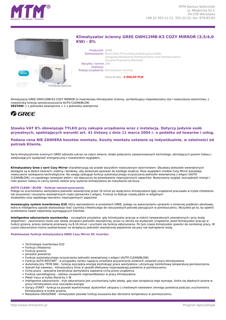 MTM Dariusz Seferyński ul. Młodnicka 52 C 04-239 Warszawa +48 22 353-11-11, 353-22-22, fax. 879-83-83 Klimatyzator ścienny GREE GWH12MB-K3 COZY MIRROR (3,5/4,0 KW) - 8% Producent: GREE Zastosowanie: Biuro,Dom,Firma,Hala produkcyjna,Lokale usługowe,Mieszkanie,Pomieszczenia inne,Pomieszczenia socjalne,Pracownia,Warsztat Wysyłka / termin 24h realizacji: Rodzaj urządzenia: Klimatyzator ścienny Cena brutto: 2 808,00 PLN Klimatyzacja GREE GWH12MB-K3 COZY MIRROR to inwerterowy klimatyzator ścienny, symbolizujący niepowtarzalny styl i nowoczesne wzornictwo, z nowatorską funkcją samooczyszczania AUTO CLEAN/BLOW. ZESTAW: 1 x jednostka wewnętrzna + 1 x jednostka zewnętrzna Stawka VAT 8% obowiązuje TYLKO przy zakupie urządzenia wraz z instalacją. Dotyczy jedynie osób prywatnych, spełniających warunki art. 41 Ustawy z dnia 11 marca 2004 r. o podatku od towarów i usług. Podana cena NIE ZAWIERA kosztów montażu. Koszty montażu ustalane są indywidualnie, w zależności od potrzeb Klienta. Seria klimatyzatorów ściennych GREE odniosła sukces na całym świecie, dzięki połączeniu zaawansowanych technologii, obniżających poziom hałasu i zwiększających wydajność energetyczną z nowatorskim wyglądem. Klimatyzatory Gree z serii Cozy Mirror charakteryzują się przede wszystkim nowoczesnym wzornictwem. Obudowy jednostek wewnętrznych dostępne są w dwóch kolorach: srebrny i bordowy, aby doskonale pasować do każdego wnętrza. Poza wyglądem modele Cozy Mirror posiadają nowoczesne rozwiązania technologiczne. Na uwagę zasługuje funkcja automatycznego oczyszczania jednostki wewnętrznej z wilgoci (AUTO CLEAN/BLOW), co zapobiega rozwojowi pleśni i nie dopuszcza do powstawania nieprzyjemnych zapachów. Nowoczesny wygląd, oszczędność energii i niski poziom hałasu to cechy bardzo istotne przy wyborze klimatyzatora do mieszkania lub biura. AUTO CLEAN / BLOW – funkcja samooczyszczania. Polega na uruchomieniu wentylatora jednostki wewnętrznej przez 10 minut po wyłączeniu klimatyzatora (gdy urządzenie pracowało w trybie chłodzenia lub osuszania) i osuszeniu wewnętrznych części parownika z wilgoci. Funkcja ta blokuje rozwój pleśni w wilgotnym środowisku oraz zapobiega tworzeniu nieprzyjemnych zapachów. Innowacyjny system inverterowy G10, który wprowadzono w produktach GREE, polega na wykorzystaniu sprężarki o zmiennej prędkości obrotowej, która w inteligentny sposób dostosowuje ilość czynnika chłodniczego do rzeczywistych potrzeb panujących w pomieszczeniu. Wszystko po to, by spełnić oczekiwania nawet najbardziej wymagających klientów. Inteligentne odszranianie wymiennika – szczególnie przydatne, gdy klimatyzator pracuje w niskich temperaturach zewnętrznych i przy dużej wilgotności - zaszronieniu może ulec wtedy skraplacz jednostki zewnętrznej, przez co obniża się wydajność urządzenia. Jeżeli klimatyzator pracuje w funkcji grzania, proces zostanie przerwany na 8-10 minut i uruchomi się funkcja odszraniania. Po tym czasie klimatyzator powróci do normalnej pracy. W czasie odszraniania można zaobserwować na skraplaczu jednostki zewnętrznej pojawienie się pary lub wykraplanie wody. Podstawowe funkcje klimatyzatora GREE Cozy Mirror DC Inverter: Technologia inverterowa G10 Funkcja chłodzenia Funkcja grzania Jonizator powietrza Funkcja automatycznego oczyszczania jednostki wewnętrznej z wilgoci (AUTO CLEAN/BLOW) Funkcja AUTO RESTART - w przypadku zaniku napięcia umożliwia przywrócenie ostatnich ustawień pracy klimatyzatora. Automatyczny TRYB SNU - funkcja oszczędza energię kontrolując prace wentylatora i utrzymując komfortową temperaturę pomieszczenia. Szeroki kąt nawiewu - klimatyzatory Gree w sposób efektywny rozprowadzają powietrze w pomieszczeniu. Cicha praca - specjalna konstrukcja wentylatora zapewnia cichą pracę urządzenia. Funkcja samodiagnozy - ułatwia usuwanie nieprawidłowości w pracy klimatyzatora. Pobór mocy w trybie Stand by 1 W Inteligentne odszranianie - tryb odszraniania jest uruchamiany tylko wtedy, gdy stan skraplacza tego wymaga. Unika się zbędnych przerw w pracy klimatyzatora oraz oszczędza energię. Gorący START - funkcja ta pozwoli wyeliminować dyskomfort związany z chwilowym nawiewem zimnego powietrza podczas uruchomienia klimatyzatora w trybie grzania. Niezależne OSUSZANIE - klimatyzator posiada funkcje osuszania bez obniżania temperatury w pomieszczeniu. http://www.firmamtm.pl Program AptusShop6 MTM Dariusz Seferyński ul. Młodnicka 52 C 04-239 Warszawa +48 22 353-11-11, 353-22-22, fax. 879-83-83 Program 24H - umożliwia ustawienie czasu włączania/wyłączania urządzenia. Funkcja TURBO (praca na pełnej mocy) - funkcja służy do szybkiego schładzania lub ogrzewania pomieszczenia, połączonego z intensywnym nawiewem powietrza. Auto RUCH ŻALUZJI - umożliwia ustawienie kąta nawiewu lub płynny ruch żaluzji. 7 prędkości wentylatora Funkcja AUTO CLEAN Stylowy design Pilot Gwarancja: 24 miesiące NA TERENIE WARSZAWY PROMOCYJNE CENY NA MONTAŻ KLIMATYZACJI Montaż podstawowy tylko 800 zł. netto!!! ZADZWOŃ I UMÓW SIĘ NA OGLĘDZINY Z TECHNIKIEM. Dane techniczne Wydajność chłodzenie (min./nom./max.) Wydajność grzanie (min./nom./max.) Klasa energetyczna Zasilanie Prąd pracy Pobór mocy ( min./nom./max.) SEER Poziom ciśnienia akust. jedn. wewnętrzna Poziom mocy akust. jedn. wewnętrzna Poziom ciśnienia akust. jedn. zewnętrzna Poziom mocy akust. jedn. zewnętrzna Przepływ powietrza jedn. wew. Orurowanie chłodnicze Długość rurociągu Różnica wysokości Wymiary jedn. wew. (dł. x wys. x szer.) Wymiary jedn. zew. (dł. x wys. x szer.) Waga jedn. wewnętrznej Waga jedn. zewnętrznej Zakres temperatur pracy Wydajność osuszania Czynnik chłodniczy Ilość czynnika chłodniczego Długość instalacji bez diładowania czynnika Dodatkowa ilość czynnika Metoda odszraniania . http://www.firmamtm.pl Powered by TCPDF (www.tcpdf.org) 0,6/3,5/3,9 kW 0,8/4,0/4,4 kW A+
