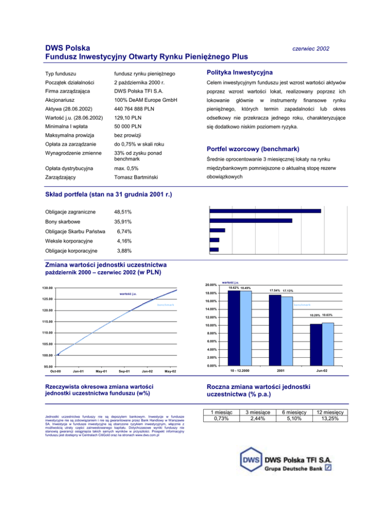 DWS Polska Fundusz Inwestycyjny Otwarty Rynku Pieniężnego Plus Typ funduszu czerwiec 2002 fundusz rynku pieniężnego Polityka Inwestycyjna Początek działalności 2 października 2000 r. Celem inwestycyjnym funduszu jest wzrost wartości aktywów Firma zarządzająca DWS Polska TFI S.A. poprzez wzrost wartości lokat, realizowany poprzez ich Akcjonariusz 100% DeAM Europe GmbH lokowanie Aktywa (28.06.2002) 440 764 888 PLN pieniężnego, Wartość j.u. (28.06.2002) 129,10 PLN odsetkowy nie przekracza jednego roku, charakteryzujące Minimalna I wpłata 50 000 PLN się dodatkowo niskim poziomem ryzyka. Maksymalna prowizja bez prowizji głównie których w instrumenty termin finansowe zapadalności lub rynku okres Opłata za zarządzanie do 0,75% w skali roku Wynagrodzenie zmienne 33% od zysku ponad benchmark Opłata dystrybucyjna max. 0,5% międzybankowym pomniejszone o aktualną stopę rezerw Zarządzający Tomasz Bartmiński obowiązkowych Portfel wzorcowy (benchmark) Średnie oprocentowanie 3 miesięcznej lokaty na rynku Skład portfela (stan na 31 grudnia 2001 r.) Obligacje zagraniczne 48,51% Bony skarbowe 35,91% Obligacje Skarbu Państwa 6,74% Weksle korporacyjne 4,16% Obligacje korporacyjne 3,88% Zmiana wartości jednostki uczestnictwa październik 2000 – czerwiec 2002 (w PLN) 20.00% 130.00 wartość j.u. 18.62% 18.49% 18.00% wartość j.u. 125.00 17.54% 17.13% 16.00% benchmark benchmark 14.00% 120.00 10.29% 10.63% 12.00% 115.00 10.00% 110.00 8.00% 6.00% 105.00 4.00% 100.00 2.00% 0.00% 95.00 Oct-00 Jan-01 May-01 Sep-01 Jan-02 May-02 Rzeczywista okresowa zmiana wartości jednostki uczestnictwa funduszu (w%) Jednostki uczestnictwa funduszy nie są depozytem bankowym. Inwestycje w fundusze inwestycyjne nie są zobowiązaniem i nie są gwarantowane przez Bank Handlowy w Warszawie SA. Inwestycje w fundusze inwestycyjne są obarczone ryzykiem inwestycyjnym, włącznie z możliwością utraty części zainwestowanego kapitału. Dotychczasowe wyniki funduszy nie stanowią gwarancji osiągnięcia takich samych wyników w przyszłości. Prospekt informacyjny funduszu jest dostepny w Centralach CitiGold oraz na stronach www.dws.com.pl 10 - 12.2000 2001 Jun-02 Roczna zmiana wartości jednostki uczestnictwa (% p.a.) 1 miesiąc 0,73% 3 miesiące 2,44% 6 miesięcy 5,10% 12 miesięcy 13,25%