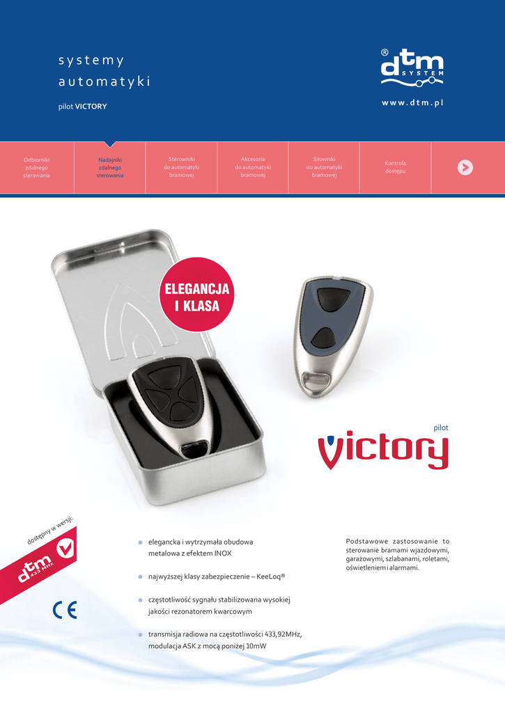 systemy automatyki www.dtm.pl pilot VICTORY Odbiorniki zdalnego sterowania Nadajniki zdalnego sterowania Sterowniki do automatyki bramowej Akcesoria do automatyki bramowej Siłowniki do automatyki bramowej Kontrola dostępu ELEGANCJA I KLASA pilot ji: ers pn stę do w yw elegancka i wytrzymała obudowa metalowa z efektem INOX najwyższej klasy zabezpieczenie – KeeLoq® częstotliwość sygnału stabilizowana wysokiej jakości rezonatorem kwarcowym transmisja radiowa na częstotliwości 433,92MHz, modulacja ASK z mocą poniżej 10mW Podstawowe zastosowanie to sterowanie bramami wjazdowymi, garażowymi, szlabanami, roletami, oświetleniem i alarmami. pilot ZASIĘG RADIOWY DO 130M Parametry pilota liczba przycisków: częstotliwość: bateria: zasięg: skuteczna moc promieniowania: system zmiennokodowy: liczba kombinacji: obudowa: temperatura pracy (min./max.): gabaryty: waga: element systemu: Odbiorniki zdalnego sterowania Nadajniki zdalnego sterowania Sterowniki do automatyki bramowej 2 lub 4 433,92MHz 2xCR2016 50-130m 3mW Keeloq® 4 294 967 296 połączenie metalu i ABS 0°C / +55°C 63x34x16mm 40g DTM433MHz Akcesoria do automatyki bramowej systemy automatyki DTM System, ul. Brzeska 7, 85-145 Bydgoszcz, tel./fax +48 52 340 15 83, e-mail: [email protected] www.dtm.pl Pilot Victory jest ekskluzywnym pilotem dla wymagających klientów. Wytrzymała metalowa obudowa z efektem INOX, wysoka jakość wykonania i dobre parametry radiowe dają gwarancję satysfakcji w użytkowaniu. Pilot posiada dwa lub cztery przyciski, mogące sterować odbiornikami radiowymi, sterownikami bram i innymi urządzeniami systemu DTM433MHz. Siłowniki do automatyki bramowej Kontrola dostępu
