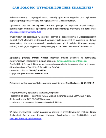 JAK ZGŁOSIĆ WYPADEK LUB INNE ZDARZENIE? Rekomendowaną i najwygodniejszą metodą zgłoszenia wypadku jest zgłoszenie poprzez pocztę elektroniczną lub poprzez Portal Klienta InterRisk. Zgłoszenie poprzez pocztę elektroniczną polaga na wysłaniu wypełnionego i podpisanego formularza zgłoszenia wraz z dokumentacją medyczną na adres mail: [email protected] Wypełniony już częściowo w zakresie danych o ubezpieczeniu i Ubezpieczającym (Zespół Szkół Morskich w Gdańsku) formularz zgłoszenia jest do pobrania na stronie www szkoły. Nie ma konieczności uzyskania pieczątki i podpisu Ubezpieczającego (szkoły) w sekcji „II. Wypełnia Ubezpieczający – placówka oświatowa” formularza. ____________________________________________________________________ Zgłoszenie poprzez Portal Klienta InterRisk można dokonać na formularzu elektronicznym znajdującym się pod adresem: https://zgloszenie.interrisk.pl Poniżej kilka informacji, które są niezbędne do wypełnienia formularza elektronicznego: -Ubezpieczający – Zespół Szkół Morskich w Gdańsku - seria i nr polisy – EDU-A/P 034236 - opcja ubezpieczenia - PODSTAWOWA ______________________________________________________________________ Zgłoszenia można dokonać także poprzez infolinię InterRisk Kontakt – 22 212 20 12 ____________________________________________________________________ Tradycyjne formy zgłoszenia zdarzenia/wypadku: - pisemnie na adres – InterRisk TU S.A. Vienna Insurance Group SU VE DLS NNW, Al. Jerozolimskie 162, 02-342 Warszawa - osobiście – w dowolnej jednostce InterRisk TU S.A. ____________________________________________________________________ W razie wątpliwości i pytań prosimy o kontakt z przedstawicielem Polskiej Grupy Brokerskiej Sp. z o.o. Panem Piotrem Gurdzińskim, tel. 534689941, mail: [email protected]