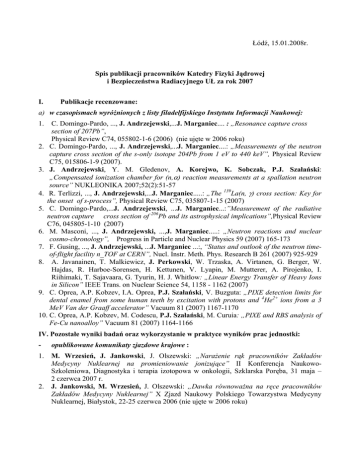 Łódź, 15.01.2008r. Spis publikacji pracowników Katedry Fizyki Jądrowej i Bezpieczeństwa Radiacyjnego UŁ za rok 2007 I. Publikacje recenzowane: a) w czasopismach wyróżnionych z listy filadelfijskiego Instytutu Informacji Naukowej: 1. C. Domingo-Pardo, ..., J. Andrzejewski,...J. Marganiec.... : „Resonance capture cross section of 207Pb”, Physical Review C74, 055802-1-6 (2006) (nie ujęte w 2006 roku) 2. C. Domingo-Pardo, ..., J. Andrzejewski,...J. Marganiec....: „Measurements of the neutron capture cross section of the s-only isotope 204Pb from 1 eV to 440 keV”, Physical Review C75, 015806-1-9 (2007). 3. J. Andrzejewski, Y. M. Gledenov, A. Korejwo, K. Sobczak, P.J. Szałański: „Compensated ionization chamber for (n,α) reaction measurements at a spallation neutron source” NUKLEONIKA 2007;52(2):51-57 4. R. Terlizzi, ..., J. Andrzejewski,...J. Marganiec.....: „The 139La(n, γ) cross section: Key for the onset of s-process”, Physical Review C75, 035807-1-15 (2007) 5. C. Domingo-Pardo,...J. Andrzejewski, ...J. Marganiec...:”Measurement of the radiative neutron capture cross section of 206Pb and its astrophysical implications”,Physical Review C76, 045805-1-10 (2007) 6. M. Masconi, ..., J. Andrzejewski, ...,J. Marganiec.....: „Neutron reactions and nuclear cosmo-chronology”, Progress in Particle and Nuclear Physics 59 (2007) 165-173 7. F. Gusing, ..., J. Andrzejewski, ...J. Marganiec ...:, “Status and outlook of the neutron timeof-flight facility n_TOF at CERN”, Nucl. Instr. Meth. Phys. Research B 261 (2007) 925-929 8. A. Javanainen, T. Malkiewicz, J. Perkowski, W. Trzaska, A. Virtanen, G. Berger, W. Hajdas, R. Harboe-Sorensen, H. Kettunen, V. Lyapin, M. Mutterer, A. Pirojenko, I. Riihimaki, T. Sajavaara, G. Tyurin, H. J. Whitlow: „Linear Energy Transfer of Heavy Ions in Silicon” IEEE Trans. on Nuclear Science 54, 1158 - 1162 (2007) 9. C. Oprea, A.P. Kobzev, I.A. Oprea, P.J. Szałański, V. Buzguta: „PIXE detection limits for dental enamel from some human teeth by excitation with protons and 4He2+ ions from a 3 MeV Van der Graaff accelerator” Vacuum 81 (2007) 1167-1170 10. C. Oprea, A.P. Kobzev, M. Codescu, P.J. Szałański, M. Curuia: „PIXE and RBS analysis of Fe-Cu nanoalloy” Vacuum 81 (2007) 1164-1166 IV. Pozostałe wyniki badań oraz wykorzystanie w praktyce wyników prac jednostki: 1. opublikowane komunikaty zjazdowe krajowe : M. Wrzesień, J. Jankowski, J. Olszewski: „Narażenie rąk pracowników Zakładów Medycyny Nuklearnej na promieniowanie jonizujące” II Konferencja NaukowoSzkoleniowa, Diagnostyka i terapia izotopowa w onkologii, Szklarska Poręba, 31 maja – 2 czerwca 2007 r. 2. J. Jankowski, M. Wrzesień, J. Olszewski: „Dawka równoważna na ręce pracowników Zakładów Medycyny Nuklearnej” X Zjazd Naukowy Polskiego Towarzystwa Medycyny Nuklearnej, Białystok, 22-25 czerwca 2006 (nie ujęte w 2006 roku) 3. 4. 1. 2. 3. 4. 5. 6. R.Brzozowski, P.Uznański, K.Polański, P.Sovak, M.Moneta, “Properties of Fe73.5xSi13.5B9Cu1Nb3Mnx alloys measured by Mossbauer spectroscopy” MagElMat New materials for magnetoelectronics, Będlewo (2007) P.75 R.Brzozowski, M.Moneta, “Properties of 1H18N9T steel measured by Mossbauer spectroscopy”, MagElMat New materials for magnetoelectronics, Będlewo (2007) P. 35 opublikowane komunikaty zjazdowe międzynarodowe : J. Jankowski, S. Papierz, J. Domienik, A. Werduch, J. Kacprzyk: „Doses Received by Patients and Staff During Cardiac Procedures” IRPA Regional Congress for Central and Eastern Europe Brasov, Romania, 24-28 September 2007 Abstract M. Wrzesień, J. Jankowski, J. Olszewski: „Exposure of the Nuclear Medicine Workers to Ionising Radiation” IRPA Regional Congress for Central and Eastern Europe Brasov, Romania, 24-28 September 2007 Abstract A.Werduch and K.Faulkner: „An analysis of the frequency of interventional cardiology in various European countries” Safety and Efficacy for New Techniques and Imaging using New equipment to support European Legislation” SENTINEL, Delft, The Netherlands, April 18 - 20, 2007. Obecnie jako abstract w materiałach pokonferencyjnych dostępny na stronie http://wwwtest.iri.tudelft.nl/~sentinel. (w druku jako publikacja w czasopiśmie z listy filadelfijskiej) R. Brzozowski, P.Uznański, P. Sovák, J. Balcerski and M. Moneta: ”Properties of Fe73.5xSi13.5B9Cu1Nb3Mnx (x=1,3-15) by means of mössbauer spectroscopy”, 13th Czech&Slovak Conference on Magnetism, CSMAG’07, Kosice, (Słowacja), 9 – 12 July, (2007) P. 126 R.Brzozowski, M.Moneta, “Phase transition and residual stress in 1H18N9T steel measured by Mössbauer spectroscopy”, 13th Czech&Slovak Conference on Magnetism, CSMAG’07, Kosice, (Słowacja), 9 – 12 July, (2007) P. 277 R. Brzozowski, K.Polański and M. Moneta: ”Properties of Fe73.5-xSi13.5B9Cu1Nb3Mnx (x=1,3-15) by means of mössbauer spectroscopy” International Conference on Nanoscale Magnetizm, ICNM, Istanbul, (Turcja), (2007) P. 208 2