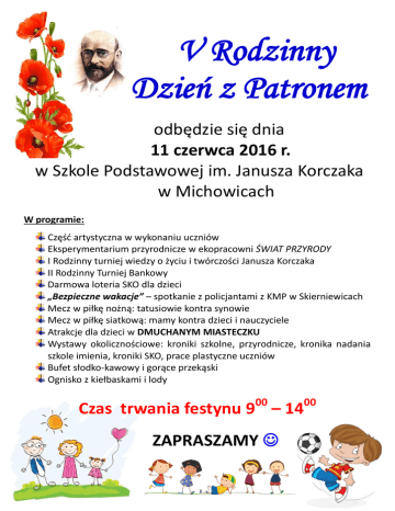 V Rodzinny Dzień z Patronem odbędzie się dnia 11 czerwca 2016 r. w Szkole Podstawowej im. Janusza Korczaka w Michowicach W programie: Część artystyczna w wykonaniu uczniów Eksperymentarium przyrodnicze w ekopracowni ŚWIAT PRZYRODY I Rodzinny turniej wiedzy o życiu i twórczości Janusza Korczaka II Rodzinny Turniej Bankowy Darmowa loteria SKO dla dzieci „Bezpieczne wakacje” – spotkanie z policjantami z KMP w Skierniewicach Mecz w piłkę nożną: tatusiowie kontra synowie Mecz w piłkę siatkową: mamy kontra dzieci i nauczyciele Atrakcje dla dzieci w DMUCHANYM MIASTECZKU Wystawy okolicznościowe: kroniki szkolne, przyrodnicze, kronika nadania szkole imienia, kroniki SKO, prace plastyczne uczniów Bufet słodko-kawowy i gorące przekąski Ognisko z kiełbaskami i lody Czas trwania festynu 900 – 1400 ZAPRASZAMY