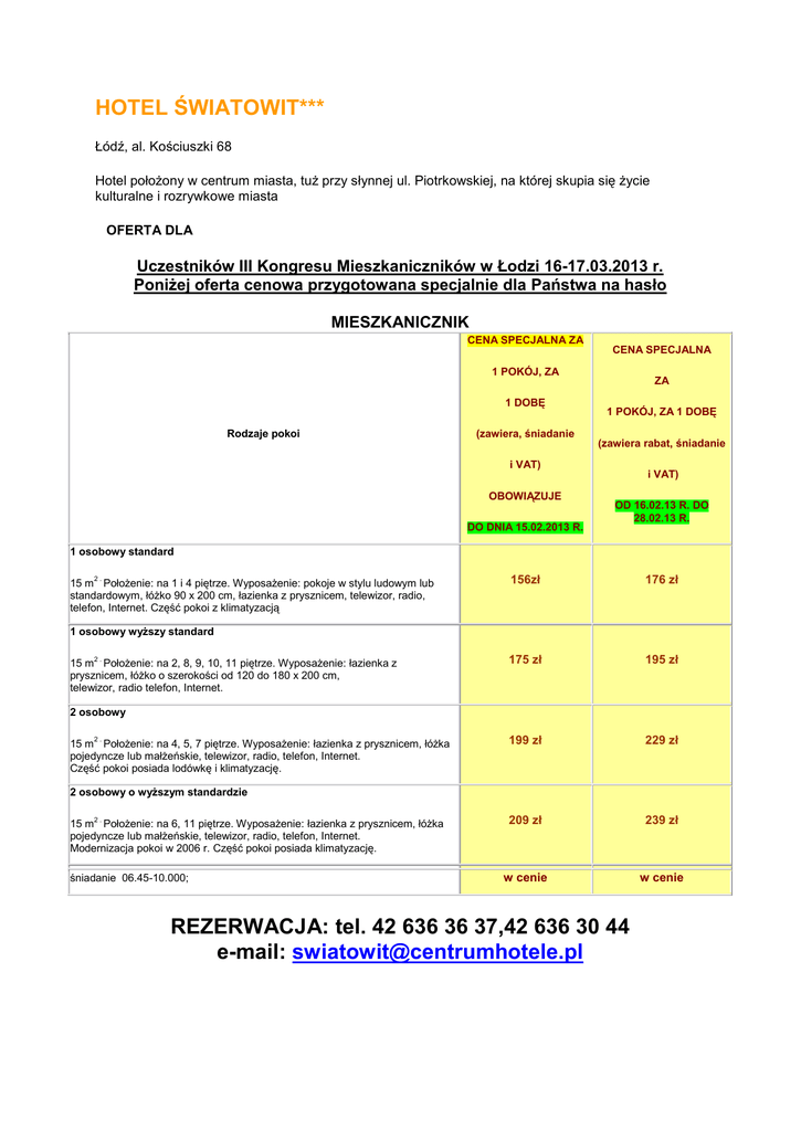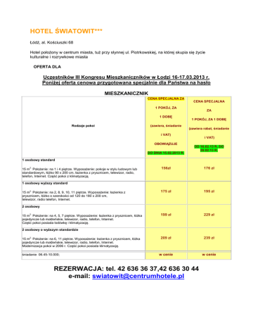 HOTEL ŚWIATOWIT*** Łódź, al. Kościuszki 68 Hotel położony w centrum miasta, tuż przy słynnej ul. Piotrkowskiej, na której skupia się życie kulturalne i rozrywkowe miasta OFERTA DLA Uczestników III Kongresu Mieszkaniczników w Łodzi 16-17.03.2013 r. Poniżej oferta cenowa przygotowana specjalnie dla Państwa na hasło MIESZKANICZNIK CENA SPECJALNA ZA CENA SPECJALNA 1 POKÓJ, ZA 1 DOBĘ Rodzaje pokoi (zawiera, śniadanie ZA 1 POKÓJ, ZA 1 DOBĘ (zawiera rabat, śniadanie i VAT) OBOWIĄZUJE DO DNIA 15.02.2013 R. i VAT) OD 16.02.13 R. DO 28.02.13 R. 1 osobowy standard 15 m2 . Położenie: na 1 i 4 piętrze. Wyposażenie: pokoje w stylu ludowym lub standardowym, łóżko 90 x 200 cm, łazienka z prysznicem, telewizor, radio, telefon, Internet. Część pokoi z klimatyzacją 156zł 176 zł 175 zł 195 zł 199 zł 229 zł 209 zł 239 zł w cenie w cenie 1 osobowy wyższy standard 15 m2 . Położenie: na 2, 8, 9, 10, 11 piętrze. Wyposażenie: łazienka z prysznicem, łóżko o szerokości od 120 do 180 x 200 cm, telewizor, radio telefon, Internet. 2 osobowy 15 m2 . Położenie: na 4, 5, 7 piętrze. Wyposażenie: łazienka z prysznicem, łóżka pojedyncze lub małżeńskie, telewizor, radio, telefon, Internet. Część pokoi posiada lodówkę i klimatyzację. 2 osobowy o wyższym standardzie 15 m2 . Położenie: na 6, 11 piętrze. Wyposażenie: łazienka z prysznicem, łóżka pojedyncze lub małżeńskie, telewizor, radio, telefon, Internet. Modernizacja pokoi w 2006 r. Część pokoi posiada klimatyzację. śniadanie 06.45-10.000; REZERWACJA: tel. 42 636 36 37,42 636 30 44 e-mail: [email protected]