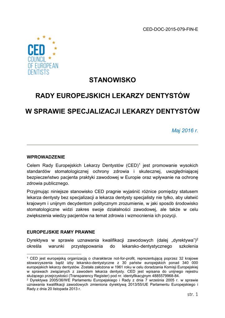 CED-DOC-2015-079-FIN-E STANOWISKO RADY EUROPEJSKICH LEKARZY DENTYSTÓW W SPRAWIE SPECJALIZACJI LEKARZY DENTYSTÓW Maj 2016 r. WPROWADZENIE Celem Rady Europejskich Lekarzy Dentystów (CED)1 jest promowanie wysokich standardów stomatologicznej ochrony zdrowia i skutecznej, uwzględniającej bezpieczeństwo pacjenta praktyki zawodowej w Europie oraz wpływanie na ochronę zdrowia publicznego. Przyjmując niniejsze stanowisko CED pragnie wyjaśnić różnice pomiędzy statusem lekarza dentysty bez specjalizacji a lekarza dentysty specjalisty nie tylko, aby ułatwić krajowym i unijnym decydentom politycznym zrozumienie, w jaki sposób środowisko stomatologiczne widzi zakres swoje działalności zawodowej, ale także w celu zwiększenia wiedzy pacjentów na temat zdrowia i wzmocnienia ich pozycji. EUROPEJSKIE RAMY PRAWNE Dyrektywa w sprawie uznawania kwalifikacji zawodowych (dalej „dyrektywa”)2 określa warunki przystępowania do lekarsko-dentystycznego szkolenia CED jest europejską organizacją o charakterze not-for-profit, reprezentującą poprzez 32 krajowe stowarzyszenia bądź izby lekarsko-dentystyczne z 30 państw europejskich ponad 340 000 europejskich lekarzy dentystów. Została założona w 1961 roku w celu doradzania Komisji Europejskiej w sprawach związanych z zawodem lekarza dentysty. CED jest wpisana do unijnego rejestru służącego przejrzystości (Transparency Register) pod nr. identyfikacyjnym 4885579968-84. 2 Dyrektywa 2005/36/WE Parlamentu Europejskiego i Rady z dnia 7 września 2005 r. w sprawie uznawania kwalifikacji zawodowych zmieniona dyrektywą 2013/55/UE Parlamentu Europejskiego i Rady z dnia 20 listopada 2013 r. 1 str. 1 specjalizacyjnego oraz minimalny okres tego szkolenia (art. 35 ust. 1 i 2). Dwie specjalizacje lekarsko-dentystyczne podlegają automatycznemu uznaniu w tych państwach członkowskich, w których występują: ortodoncja i chirurgia stomatologiczna (pkt. 5.3.3 załącznika V do dyrektywy). Zgodnie z art. 35 dyrektywy warunkiem podjęcia specjalistycznego szkolenia lekarsko-dentystycznego jest potwierdzone ukończenie podstawowego kształcenia lekarsko-dentystycznego, o którym mowa w art. 34, lub posiadanie dokumentów, o których mowa w art. 23 i 37 dyrektywy (tj. dokumentów potwierdzających tzw. prawa nabyte do wykonywania zawodu lekarza dentysty), co oznacza, że zainteresowana osoba uzyskała pod właściwym nadzorem odpowiednie doświadczenie kliniczne przy pacjencie. Ponadto, wymagany minimalny okres szkolenia specjalizacyjnego ma odpowiadać co najmniej trzem latom nauki praktycznej i teoretycznej w pełnym wymiarze czasu i składać się z co najmniej 3 000 godzin, obejmujących osobisty udział lekarza dentysty. Dyrektywa nie określa treści szkolenia w dwóch dziedzinach objętych uznawaniem automatycznym, tj. programu szkolenia lub minimalnych wymogów w zakresie wiedzy, umiejętności i kompetencji. To należy do zadań właściwych instytucji krajowych. W związku z powyższym dokument potwierdzający kwalifikacje zawodowe lekarza dentysty jest wydawany po ukończeniu studiów prowadzonych przez uniwersytet lub inną szkołę wyższą, podczas gdy dokument potwierdzający uzyskanie tytułu lekarza dentysty specjalisty jest wydawany po odbyciu dodatkowego, podyplomowego szkolenia specjalizacyjnego prowadzonego przez ośrodek uniwersytecki, ośrodek leczniczo-badawczy lub, w stosownych przypadkach, w placówkę ochrony zdrowia upoważnioną do tego przez właściwe organy lub instytucje. W roku 2013 dyrektywa został znowelizowana i wprowadziła m.in. możliwość obejmowania specjalizacji lekarsko-dentystycznych systemem automatycznego uznawania na podstawie tzw. wspólnych ram kształcenia. Europejscy lekarze dentyści sprzeciwiają się ustanawianiu wspólnych ram kształcenia w stomatologii, jako że dyrektywa przewiduje już skuteczny mechanizm prowadzący do automatycznego uznawania kolejnych specjalizacji lekarsko-dentystycznych w ten sposób ułatwiając mobilność lekarzy dentystów przy jednoczesnym zapewnieniu wysokiej jakości specjalistycznej opieki stomatologicznej3. Stanowisko CED w sprawie wspólnych zasad kształcenia w ramach dyrektywy 2005/36/WE przyjęte jednogłośnie na posiedzeniu plenarnym CED w dniu 29 maja 2015 r. 3 str. 2 ZAKRES DZIAŁALNOŚCI LEKARZY DENTYSTÓW SPECJALISTÓW Podstawowa różnica pomiędzy zakresem czynności zawodowych lekarza dentysty bez specjalizacji a lekarza dentysty specjalisty polega na tym, że specjalista, z uwagi na dodatkowe, szczegółowe szkolenie, jakie w danej dziedzinie odbył, w swojej codziennej praktyce w większym stopniu wykonuje czynności w ramach posiadanej specjalizacji. W rzeczywistości, po ukończeniu podstawowego kształcenia lekarskodentystycznego lekarz dentysta posiada odpowiednie kwalifikacje do wykonywania wszystkich czynności zawodowych, które wykonuje także lekarz dentysta specjalista. Każdy bowiem lekarz dentysta wykonuje czynności w zakresie profilaktyki, diagnozowania i leczenia nieprawidłowości i chorób zębów, jamy ustnej, szczęki, żuchwy i okolic przyległych, pracując samodzielnie i niezależnie od innych pracowników ochrony zdrowia oraz kierując zespołem stomatologicznym 4. Lekarz dentysta bez specjalizacji może skierować pacjenta do lekarza dentysty specjalisty, jeżeli uważa to za właściwe albo konieczne. STANOWISKO CED Rada Europejskich Lekarzy Dentystów popiera to, że dyrektywa w sprawie uznawania kwalifikacji zawodowych w pełni uznaje, iż określenie szczegółowego programu szkolenia specjalizacyjnego lekarzy dentystów należy do kompetencji państw członkowskich UE. Rada Europejskich Lekarzy Dentystów podkreśla, że lekarz dentysta bez specjalizacji posiada odpowiednie kwalifikacje do wykonywania wszystkich czynności zawodowych, które wykonuje także lekarz dentysta specjalista, i nie można lekarzowi dentyście bez specjalizacji zabronić wykonywania żadnej z tych czynności. Rada Europejskich Lekarz