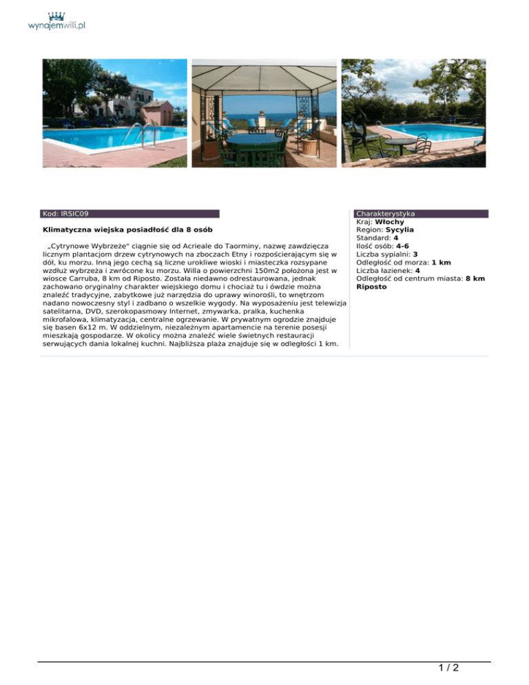 Kod: IRSIC09 Klimatyczna wiejska posiadłość dla 8 osób „Cytrynowe Wybrzeże" ciągnie się od Acrieale do Taorminy, nazwę zawdzięcza licznym plantacjom drzew cytrynowych na zboczach Etny i rozpościerającym się w dół, ku morzu. Inną jego cechą są liczne urokliwe wioski i miasteczka rozsypane wzdłuż wybrzeża i zwrócone ku morzu. Willa o powierzchni 150m2 położona jest w wiosce Carruba, 8 km od Riposto. Została niedawno odrestaurowana, jednak zachowano oryginalny charakter wiejskiego domu i chociaż tu i ówdzie można znaleźć tradycyjne, zabytkowe już narzędzia do uprawy winorośli, to wnętrzom nadano nowoczesny styl i zadbano o wszelkie wygody. Na wyposażeniu jest telewizja satelitarna, DVD, szerokopasmowy Internet, zmywarka, pralka, kuchenka mikrofalowa, klimatyzacja, centralne ogrzewanie. W prywatnym ogrodzie znajduje się basen 6x12 m. W oddzielnym, niezależnym apartamencie na terenie posesji mieszkają gospodarze. W okolicy można znaleźć wiele świetnych restauracji serwujących dania lokalnej kuchni. Najbliższa plaża znajduje się w odległości 1 km. Charakterystyka Kraj: Włochy Region: Sycylia Standard: 4 Ilość osób: 4-6 Liczba sypialni: 3 Odległość od morza: 1 km Liczba łazienek: 4 Odległość od centrum miasta: 8 km Riposto 1/2 Zakwaterowanie: Pierwsze piętro (wejście przez zewnętrzną klatkę schodową): salon z jadalnią i kuchnią, z salonu wyjście na umeblowany taras z widokiem na Etnę i na morze, toaleta, 3 sypialnie dwuosobowe z łazienkami z prysznicem, mansarda z dwoma pojedynczymi łóżkami i łazienką z prysznicem. Dodatkowe informacje: W cenę wliczono: wymianę pościeli i ręczników 1 raz w tygodniu, energię elektryczną, na życzenie łóżeczko dla dziecka. Dodatkowo płatne: sprzątanie końcowe - 130 EUR, centralne ogrzewanie i klimatyzacja - wg zużycia, obligatoryjnie 2 godzin sprzątania w tygodniu - 20 EUR. Basen czynny marzec-październik. Zwierzęta nie są akceptowane. Kaucja zwrotna w wysokości 400 EUR płatna w dniu przyjazdu. Lokalizacja: Riposto, Catania - 25 km Cena za tydzień wynajmu: 2 120 - 3 195 EUR 2/2 Powered by TCPDF (www.tcpdf.org)