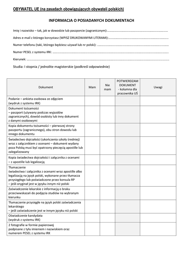 OBYWATEL UE (na zasadach obowiązujących obywateli polskich) INFORMACJA O POSIADANYCH DOKUMENTACH Imię i nazwisko – tak, jak w dowodzie lub paszporcie (zagranicznym):…………………………………………………………………… Adres e-mail z którego korzystasz (WPISZ DRUKOWANYMI LITERAMI):………………………………………………………………….. Numer telefonu (taki, którego będziesz używał lub nr polski): ..……………………………………………………………………………… Numer PESEL z systemu IRK: ………………………………………………………………………………………………………………………………….. Kierunek: ……………………………………………………………………………………………………………………………………………...................... Studia: I stopnia / jednolite magisterskie (podkreśl odpowiednie) Dokument Podanie – ankieta osobowa ze zdjęciem (wydruk z systemu IRK) Dokument tożsamości – paszport (używany podczas wyjazdów zagranicznych), dowód osobisty lub inny dokument z danymi osobowymi Kopia dokumentu tożsamości – pierwszej strony paszportu (zagranicznego), obu stron dowodu lub innego dokumentu Świadectwo dojrzałości (ukończenia szkoły średniej) wraz z załącznikiem z ocenami – dokument wydany poza Polską musi być opatrzony pieczęcią apostille lub zalegalizowany Kopia świadectwa dojrzałości i załącznika z ocenami – z apostille lub legalizacją Tłumaczenie świadectwa i załącznika z ocenami wraz apostille albo legalizacją na język polski, wykonane przez tłumacza przysięgłego lub poświadczone przez konsula RP – jeśli oryginał jest w języku innym niż polski Zaświadczenie lekarskie z informacją o braku przeciwwskazań do podjęcia studiów na wybranym kierunku Tłumaczenie przysięgłe na język polski zaświadczenia lekarskiego – jeśli zaświadczenie jest w innym języku niż polski Oświadczenie kandydata (wydruk z systemu IRK) 2 fotografie w formie papierowej podpisane z tyłu imieniem i nazwiskiem oraz numerem PESEL z systemu IRK Mam Nie mam POTWIERDZAM DOKUMENT - kolumna dla pracownika UŚ Uwagi Dokument Mam Nie mam POTWIERDZAM DOKUMENT - kolumna dla pracownika UŚ Uwagi Polisa ubezpieczeniowa na wypadek choroby lub następstw nieszczęśliwych wypadków na okres kształcenia w Polsce, Europejska Karta Ubezpieczenia Zdrowotnego lub potwierdzenie ubezpieczenia w Narodowym Funduszu Zdrowia – napisz datę ważności Kopia polisy ubezpieczeniowej na wypadek choroby lub następstw nieszczęśliwych wypadków na okres kształcenia w Polsce, EKUZ lub potwierdzenia ubezpieczenia w NFZ Oświadczam, że wszystkie informacje podane powyżej są prawdziwe i zgodne ze stanem na dzień wypełnienia ankiety. Miejscowość, data Podpis