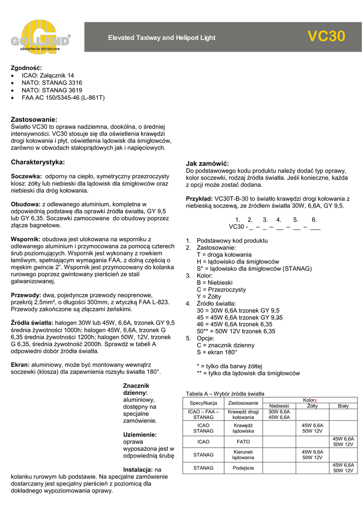VC30 Elevated Taxiway and Heliport Light Zgodność: • ICAO: Załącznik 14 • NATO: STANAG 3316 • NATO: STANAG 3619 • FAA AC 150/5345-46 (L-861T) Zastosowanie: Światło VC30 to oprawa nadziemna, dookólna, o średniej intensywności. VC30 stosuje się dla oświetlenia krawędzi drogi kołowania i płyt, oświetlenia lądowisk dla śmigłowców, zarówno w obwodach stałoprądowych jak i napięciowych. Charakterystyka: Jak zamówić: Soczewka: odporny na ciepło, symetryczny przezroczysty klosz: żółty lub niebieski dla lądowisk dla śmigłowców oraz niebieski dla dróg kołowania. Obudowa: z odlewanego aluminium, kompletna w odpowiednią podstawę dla oprawki źródła światła, GY 9,5 lub GY 6,35. Soczewki zamocowane do obudowy poprzez złącze bagnetowe. Wspornik: obudowa jest ulokowana na wsporniku z odlewanego aluminium i przymocowana za pomocą czterech śrub poziomujących. Wspornik jest wykonany z rowkiem łamliwym, spełniającym wymagania FAA, z dolną częścią o męskim gwincie 2”. Wspornik jest przymocowany do kolanka rurowego poprzez gwintowany pierścień ze stali galwanizowanej. Przewody: dwa, pojedyncze przewody neoprenowe, przekrój 2,5mm², o długości 300mm, z wtyczką FAA L-823. Przewody zakończone są złączami żeńskimi. Źródła światła: halogen 30W lub 45W, 6,6A, trzonek GY 9,5 średnia żywotności 1000h; halogen 45W, 6,6A, trzonek G 6,35 średnia żywotności 1200h; halogen 50W, 12V, trzonek G 6,35, średnia żywotność 2000h. Sprawdź w tabeli A odpowiedni dobór źródła światła. Ekran: aluminiowy, może być montowany wewnątrz soczewki (klosza) dla zapewnienia rozsyłu światła 180°. Znacznik dzienny: aluminiowy, dostępny na specjalne zamówienie. Uziemienie: oprawa wyposażona jest w odpowiednią śrubę Instalacja: na kolanku rurowym lub podstawie. Na specjalne zamówienie dostarczany jest specjalny pierścień z poziomicą dla dokładnego wypoziomowania oprawy. Do podstawowego kodu produktu należy dodać typ oprawy, kolor soczewki, rodzaj źródła światła. Jeśli konieczne, każda z opcji może zostać dodana. Przykład: VC30T-B-30 to światło krawędzi drogi kołowania z niebieską soczewą, ze źródłem światła 30W, 6,6A, GY 9,5. 1. 2. 3. 4. 5. 6. VC30 - _ – _ – __ – __ – ___ 1. Podstawowy kod produktu 2. Zastosowanie: T = droga kołowania H = lądowisko dla śmigłowców S* = lądowisko dla śmigłowców (STANAG) 3. Kolor: B = Niebieski C = Przezroczysty Y = Żółty 4. Źródło światła: 30 = 30W 6,6A trzonek GY 9,5 45 = 45W 6,6A trzonek GY 9,35 46 = 45W 6,6A trzonek 6,35 50** = 50W 12V trzonek 6,35 5. Opcje: C = znacznik dzienny S = ekran 180° * = tylko dla barwy żółtej ** = tylko dla lądowisk dla śmigłowców Tabela A – Wybór źródła światła Specyfikacja Zastosowanie ICAO – FAA – STANAG Krawędź drogi kołowania ICAO STANAG Krawędź lądowiska ICAO FATO STANAG Kierunek lądowania STANAG Podejście Niebieski 30W 6,6A 45W 6,6A Kolory Żółty Biały 45W 6,6A 50W 12V 45W 6,6A 50W 12V 45W 6,6A 50W 12V 45W 6,6A 50W 12V Dane techniczne: Wymiary zewnętrzne: - rozsył światła przy źródle 30W 6,6A - światło niebieskie - rozsył światła przy źródle światła 45W 6,6A i 50W 12V - światło żółte ICAO Instrukcja użytkownika: VC30T UT-MT-049 VC30H UT-MT-050 VC30S UT-MT-050 Instrukcja użytkownika: VC30T UT-MT-049 VC30H UT-MT-050 VC30S UT-MT-050 VC30 (bez znacznika) Waga przesyłki 1,3kg 3 Objętość przesyłki 0,009 m Akcesoria Kod 013.0010 013.0008 315.3210 315.1227 315.1062 011.2050 011.2001 011.1509 011.1510 332.3250 0,4kg 3 0,003 m Opis Zestaw dwóch pierścieni rytonowych dla utrzymania gniazda wewnątrz kolanka rurowego Kolanko rurowe z galwanizowanej stali z gwintowaną górną częścią Kolanko rurowe z galwanizowanej stali z gwintowanymi końcami Puszka L-867, Class I, Size B, głębokość 24” Podstawa do puszki L-867 z uszczelką i uchwytem na przewód Transformator separacyjny obwodów szeregowych FAA L-831 30/45 W 6.6/6,6A Transformator separacyjny obwodów szeregowych FAA L-831 30/45W 6.6/6.6A, z uziemieniem wtórnym Transformator dla obwodów równoległych 50W, 220/12V Transformator dla obwodów równoległych 50W, 380/12V Pierścień do poziomowania Części eksploatacyjne Kod 317.0030 317.0040 317.0050 758.2006 760.2140 760.2220 760.2102 760.2160 324.2110 324.2090 323.2220 155.8020 786.1001 321.7070 321.0530 303.4260 Znacznik Opis Niebieska symetryczna soczewka Żółta symetryczna soczewka Przezroczysta symetryczna soczewka Uszczelka dla soczewki Halogen 30W, 6,6A, trzonek GY 9,5 Halogen 45W, 6,6A, trzonek GY 9,5 Halogen 45W, 6,6A, trzonek G 6,35 Halogen 50W, 12V, trzonek GY 6,35 Oprawka GY 9,5 Oprawka GY 6,35 Wtyczka dwubolcowa L-823 z przewodami, długość 300mm, ze złączami żeńskimi Łamliwy wspornik z pierścieniem i osprzętem Pierścień dla wspornika Ekran 180° Znacznik dzienny Obudowa