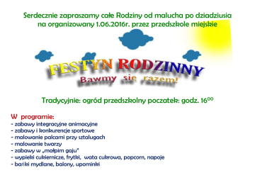 Serdecznie zapraszamy całe Rodziny od malucha po dziadziusia na organizowany 1.06.2016r. przez przedszkole miejskie Tradycyjnie: ogród przedszkolny poczatek: godz. 1600 W programie: - zabawy integracyjne animacyjne - zabawy i konkurencje sportowe - malowanie palcami przy sztalugach - malowanie twarzy - zabawy w „małpim gaju” - wypieki cukiernicze, frytki, wata cukrowa, popcorn, napoje - bańki mydlane, balony, upominki