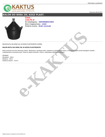 Informacje o produkcie Utworzono 08-03-2017 BALON DO WINA 20L KOSZ PLAST. Cena : 110,76 zł AK TU BALON BUTLA NA WINO 20L W KOSZU PLASTIKOWYM CHOMIK S Nr katalogowy : 5693000051902 Stan magazynowy : niski Średnia ocena : brak recenzji BALON BUTLA NA WINO 20L W KOSZU PLASTIKOWYM Butla wniarska do wina domowej roboty. Wykonana z grubego szkła, osadzona w plastikowym koszu, chroniącym balon przed dostępem światła i uszkodzeniami mechanicznymi. Kosze w dwóch kolorach: czarny i zielonkawy (dobierane losowo). eK WYMIARY Wysokość - 49cm Średnica - 35cm Średnica otworu - 4,5cm. Wygenerowano w programie www.oscGold.com