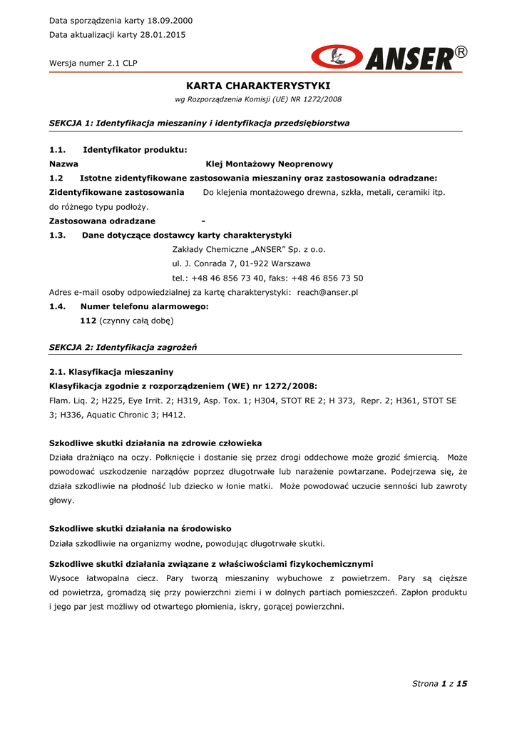 Data sporządzenia karty 18.09.2000 Data aktualizacji karty 28.01.2015 Wersja numer 2.1 CLP KARTA CHARAKTERYSTYKI wg Rozporządzenia Komisji (UE) NR 1272/2008 SEKCJA 1: Identyfikacja mieszaniny i identyfikacja przedsiębiorstwa 1.1. Identyfikator produktu: Nazwa 1.2 Klej Montażowy Neoprenowy Istotne zidentyfikowane zastosowania mieszaniny oraz zastosowania odradzane: Zidentyfikowane zastosowania Do klejenia montażowego drewna, szkła, metali, ceramiki itp. do różnego typu podłoży. Zastosowana odradzane 1.3. - Dane dotyczące dostawcy karty charakterystyki Zakłady Chemiczne „ANSER” Sp. z o.o. ul. J. Conrada 7, 01-922 Warszawa tel.: +48 46 856 73 40, faks: +48 46 856 73 50 Adres e-mail osoby odpowiedzialnej za kartę charakterystyki: [email protected] 1.4. Numer telefonu alarmowego: 112 (czynny całą dobę) SEKCJA 2: Identyfikacja zagrożeń 2.1. Klasyfikacja mieszaniny Klasyfikacja zgodnie z rozporządzeniem (WE) nr 1272/2008: Flam. Liq. 2; H225, Eye Irrit. 2; H319, Asp. Tox. 1; H304, STOT RE 2; H 373, Repr. 2; H361, STOT SE 3; H336, Aquatic Chronic 3; H412. Szkodliwe skutki działania na zdrowie człowieka Działa drażniąco na oczy. Połknięcie i dostanie się przez drogi oddechowe może grozić śmiercią. Może powodować uszkodzenie narządów poprzez długotrwałe lub narażenie powtarzane. Podejrzewa się, że działa szkodliwie na płodność lub dziecko w łonie matki. Może powodować uczucie senności lub zawroty głowy. Szkodliwe skutki działania na środowisko Działa szkodliwie na organizmy wodne, powodując długotrwałe skutki. Szkodliwe skutki działania związane z właściwościami fizykochemicznymi Wysoce łatwopalna ciecz. Pary tworzą mieszaniny wybuchowe z powietrzem. Pary są cięższe od powietrza, gromadzą się przy powierzchni ziemi i w dolnych partiach pomieszczeń. Zapłon produktu i jego par jest możliwy od otwartego płomienia, iskry, gorącej powierzchni. Strona 1 z 15 Klej Montażowy Neoprenowy – Karta Charakterystyki 2.2. Elementy oznakowania Oznakowanie zgodnie z rozporządzeniem (WE) nr 1272/2008: Piktogramy: Hasło ostrzegawcze: Niebezpieczeństwo Zwroty wskazujące rodzaj zagrożenia: H225 – Wysoce łatwopalna ciecz i pary. H319 – Działa drażniąco na oczy. H304 – Połknięcie i dostanie się przez drogi oddechowe może grozić śmiercią. H373 – Może powodować uszkodzenie narządów poprzez długotrwałe lub narażenie powtarzane. H361 – Podejrzewa się, że działa szkodliwie na płodność lub dziecko w łonie matki. H336 – Może powodować uczucie senności lub zawroty głowy. H412 - Działa szkodliwie na organizmy wodne, powodując długotrwałe skutki. Zwroty wskazujące środki ostrożności: P102 - Chronić przed dziećmi. P210 - Przechowywać z dala od źródeł ciepła, iskrzenia, otwartego ognia. – Palenie wzbronione. P261 - Unikać wdychania pyłu/dymu/gazu/mgły/par/rozpylonej cieczy. P285 - W przypadku niedostatecznej wentylacji stosować indywidualne środki ochrony dróg. P101 - W razie konieczności zasięgnięcia porady lekarza, należy pokazać pojemnik lub etykietę. P403 + P235 - Przechowywać w dobrze wentylowanym miejscu. Przechowywać w chłodnym miejscu. P273 – Unikać uwolnienia do środowiska. Inne: Zawiera octan etylu, octan butylu, destylaty bogate w węglowodory C6. 2.3. Inne zagrożenia Substancje zawarte w mieszaninie nie spełniają kryteriów PBT i vPvB zgodnie z załącznikiem XIII Rozporządzenia REACH. SEKCJA 3: Skład/informacja o składnikach Nazwa Octan etylu Zawartość Numery identyfikacyjne Klasyfikacja % wag. substancji wg Rozporządzenia (WE) 1272/2008 CAS: 141-78-6 Flam. Liq. 2; H225 WE: 205-500-4 Eye Irrit. 2; H319 <30 Nr indeksowy: 607-022-00-5 Benzyna lekka <15 CAS: 64742-49-0 STOT SE 3; H336 Flam. Liq. 2; H225 Strona 2 z 15 Klej Montażowy Neoprenowy – Karta Charakterystyki obrabiana wodorem WE: 265-151-9 Skin Irrit. 2; H315 (ropa naftowa); Nr indeksowy: 649-328-00-1 Asp. Tox. 1; H304 Niskowrząca frakcja Repr. 2; H361 naftowa obrabiana STOT SE 3; H336 wodorem/ STOT RE 2; H373 Niskowrząca Aquatic Chronic 2; H411 benzyna niespecyfkowana Destylaty bogate w węglowodory C6 Octan n-butylu <10 CAS: 123-86-4 Flam. Liq. 3; H226 WE: 204-658-1 STOT SE 3; H336 Nr indeksowy: 607-025-00-1 Pełną treść zwrotów opisujących zagrożenie podano w p. 16. Numery rejestracji właściwej: Benzyna lekka obrabiana wodorem (ropa naftowa) 01-2119475133-43-XXXX. Octan butylu 01-2119485493-29-XXXX. Pozostałe numery rejestracyjne nie są obecnie dostępne. SEKCJA 4: Środki pierwszej pomocy. 4.1. Opis środków pierwszej pomocy W przypadku narażenia przez drogi oddechowe - Opuścić miejsce narażenia (lub wyprowadzić poszkodowanego z miejsca narażenia) - Zapewnić poszkodowanemu spokój i dostęp świeżego powietrza - W razie duszności podawać tlen - W razie zatrzymania oddechu zastosować sztuczne oddychanie - Zapewnić pomoc lekarską W przypadku narażenia przez kontakt ze skórą - Zdjąć zanieczyszczoną odzież - Zmyć skórę wodą z mydłem - Skonsultować się z lekarzem w razie wystąpienia podrażnienia. W przypadku narażenia przez kontakt z oczami - Usunąć szkła kontaktowe - Nie stosować środków zobojętniających - Przemywać oczy dużą ilością chłodnej wody przez około 15 minut przy otwartych powiekach (unikać silnego strumienia wody ze względu na ryzyko mechanicznego uszkodzenia rogówki) - W przypadku dolegliwości wymagana jest konsultacja okulistyczna W przypadku narażenia przez przewód pokarmowy - Nie wywoływać wymiotów ze względu na ryzyko aspiracji do płuc - W razie wystąpienia naturalnych odruchów wymiotnych trzymać poszkodowanego w pozycji nachylonej do przodu - Natychmiast zapewnić pomoc lekarską. Strona 3 z 15 Klej Montażowy Neoprenowy – Karta Charakterystyki 4.2. Najważniejsze ostre i opóźnione objawy oraz skutki narażenia Nudności, bóle i zawroty głowy, wysuszanie i pękanie skóry, podrażnienie oczu. 4.3. Wskaz