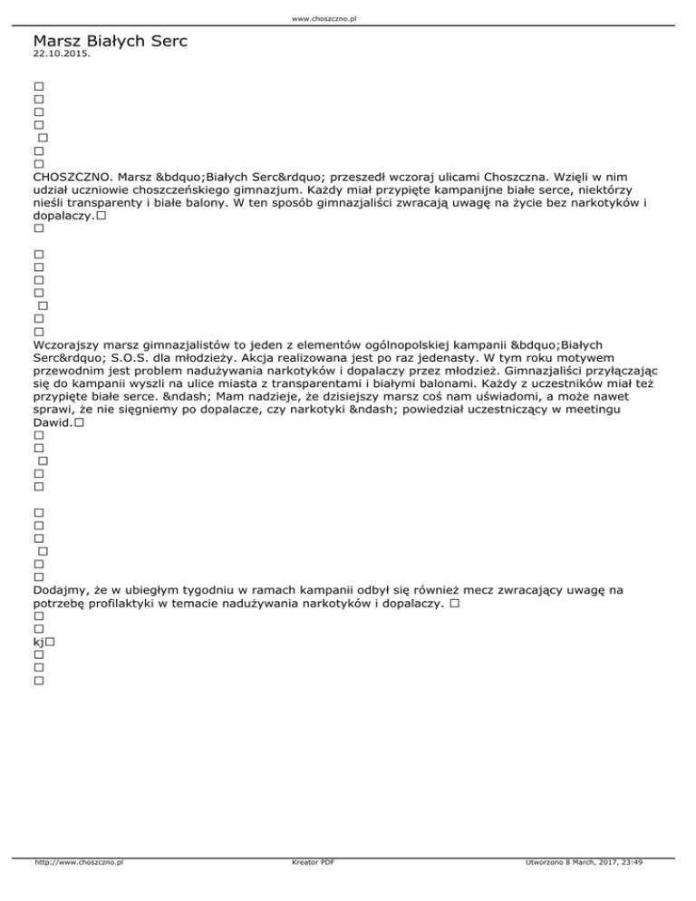 www.choszczno.pl Marsz Białych Serc 22.10.2015. CHOSZCZNO. Marsz „Białych Serc” przeszedł wczoraj ulicami Choszczna. Wzięli w nim udział uczniowie choszczeńskiego gimnazjum. Każdy miał przypięte kampanijne białe serce, niektórzy nieśli transparenty i białe balony. W ten sposób gimnazjaliści zwracają uwagę na życie bez narkotyków i dopalaczy. Wczorajszy marsz gimnazjalistów to jeden z elementów ogólnopolskiej kampanii „Białych Serc” S.O.S. dla młodzieży. Akcja realizowana jest po raz jedenasty. W tym roku motywem przewodnim jest problem nadużywania narkotyków i dopalaczy przez młodzież. Gimnazjaliści przyłączając się do kampanii wyszli na ulice miasta z transparentami i białymi balonami. Każdy z uczestników miał też przypięte białe serce. – Mam nadzieje, że dzisiejszy marsz coś nam uświadomi, a może nawet sprawi, że nie sięgniemy po dopalacze, czy narkotyki – powiedział uczestniczący w meetingu Dawid. Dodajmy, że w ubiegłym tygodniu w ramach kampanii odbył się również mecz zwracający uwagę na potrzebę profilaktyki w temacie nadużywania narkotyków i dopalaczy. kj http://www.choszczno.pl Kreator PDF Utworzono 8 March, 2017, 23:49