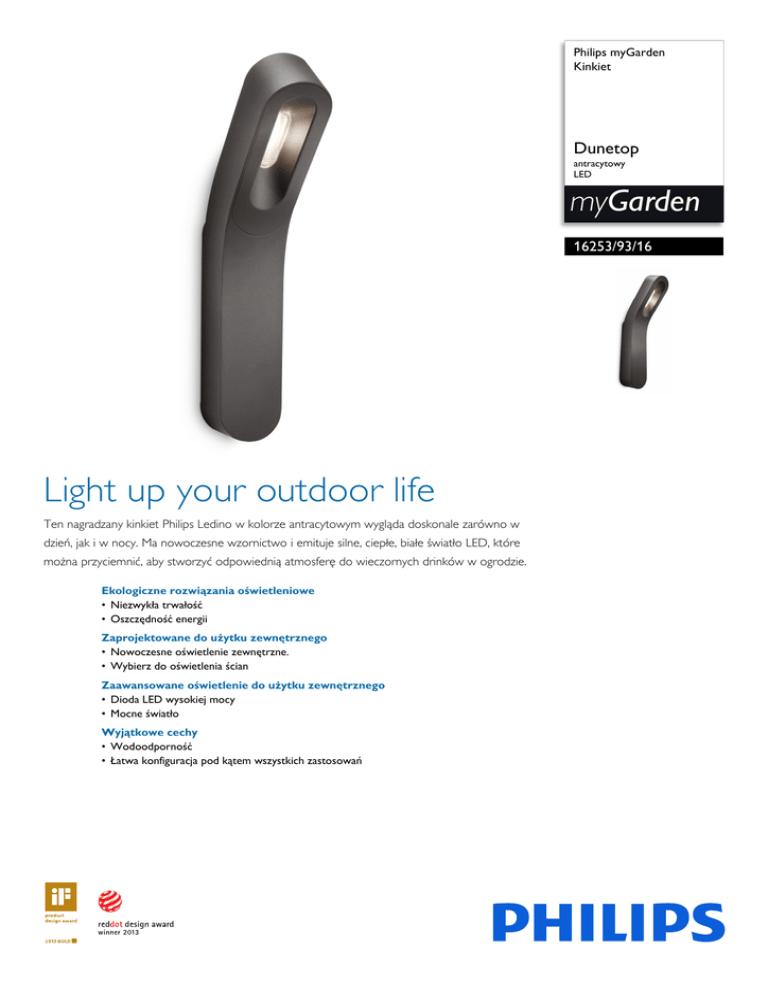 Philips myGarden Kinkiet Dunetop antracytowy LED myGarden 16253/93/16 Light up your outdoor life Ten nagradzany kinkiet Philips Ledino w kolorze antracytowym wygląda doskonale zarówno w dzień, jak i w nocy. Ma nowoczesne wzornictwo i emituje silne, ciepłe, białe światło LED, które można przyciemnić, aby stworzyć odpowiednią atmosferę do wieczornych drinków w ogrodzie. Ekologiczne rozwiązania oświetleniowe • Niezwykła trwałość • Oszczędność energii Zaprojektowane do użytku zewnętrznego • Nowoczesne oświetlenie zewnętrzne. • Wybierz do oświetlenia ścian Zaawansowane oświetlenie do użytku zewnętrznego • Dioda LED wysokiej mocy • Mocne światło Wyjątkowe cechy • Wodoodporność • Łatwa konfiguracja pod kątem wszystkich zastosowań 162539316 Kinkiet Dunetop antracytowy, LED Zalety Dane techniczne Dioda LED wysokiej mocy rachunki za prąd i przyczynia się do ochrony środowiska. Wybierz do oświetlenia ścian Wykorzystaj dostępną przestrzeń. Ten kinkiet jest idealny do zamontowania w pobliżu drzwi wejściowych lub na ścianach tarasu. Wodoodporność Stylistyka i wykończenie • Materiał: aluminium • Kolor: antracytowy Dodatkowe funkcje/akcesoria w zestawie • • • • Możliwość przyciemniania Odporność na warunki pogodowe 5 lat gwarancji na moduł LED Precyzyjne wiązki światła Wymiary i waga produktu • • • • Zewnętrzne oprawy Philips Ledino wykorzystują najnowocześniejszą technologię LED. Oferują silny strumień światła wysokiej jakości oraz długi czas eksploatacji. Dane techniczne Niezwykła trwałość Ta lampa Philips została zaprojektowana pod kątem wilgotnych miejsc i przeszła rygorystyczne testy, które potwierdziły jej odporność na wodę. Poziom IP określają dwie liczby: pierwsza to poziom ochrony przeciw kurzowi, a druga przeciw wodzie. Poziom IP44 oznacza, że jest odporna na zachlapania. To czyni z niej idealną lampę do zastosowań zewnętrznych. Mocne światło Źródło światła godne zaufania. Produkty oświetleniowe LED firmy Philips gwarantują wyjątkową trwałość min. 20 000 godzin (co oznacza 20 lat w przypadku średniego użycia przez 3 godziny dziennie, przy co najmniej 13 000 włączeń i wyłączeń). Dzięki temu już nie trzeba się martwić naprawą lub wymianą żarówki, ciesząc się doskonałym, nastrojowym oświetleniem w domu. Ta lampa zewnętrzna daje mocne, ciepłe, białe światło. Jasny strumień światła odpowiednio oświetli Twój ogród lub taras. Nowoczesne oświetlenie zewnętrzne. Elegancki, współczesny styl zewnętrznych opraw Philips Ledino robi wrażenie. Jest odważny i minimalistyczny — idealny do udekorowania światłem ogrodu, ścieżek oraz innych przestrzeni zewnętrznych. Łatwa konfiguracja Oszczędność energii Lampa i elementy montażowe są zaprojektowane tak, by instalacja przebiegała sprawnie. Wszystkie rzeczy potrzebne do instalacji, jak klucz i śruby typu Torx, są w opakowaniu. W instrukcji znajdziesz przejrzyste wskazówki dotyczące instalacji produktu i inne ważne informacje, jak poziom wodoodporności IP. Ta lampa firmy Philips zużywa mniej energii niż tradycyjne źródła światła, co pozwala zmniejszyć Data wydania 2015-09-28 © 2015 Koninklijke Philips N.V. Wszelkie prawa zastrzeżone. Wersja: 4.0.1 Dane techniczne mogą ulec zmianie bez powiadomienia. Znaki towarowe są własnością Koninklijke Philips N.V. lub własnością odpowiednich firm. 12 NC: 9150 041 22801 EAN: 87 18291 44223 3 Wysokość: 35,9 cm Długość: 6,0 cm Szerokość: 15,6 cm Waga netto: 0,900 kg www.philips.com • Zasilanie sieciowe: Przedział 220–240 V, 50–60 Hz • Technologia źródła światła: LED, Bezpieczne, bardzo niskie napięcie • Liczba źródeł światła: 1 • Moc źródła światła w zestawie: 6,5 W • Barwa światła: ciepła biel • Maksymalna trwałość źródła światła: 20 000 godz. • Kąt rozsyłu: 85° • Łączna moc strumienia świetlnego oprawy w lumenach: 210 lm • Oprawa z możliwością przyciemniania • LED • Współczynnik IP: IP44, ochrona przed przedmiotami powyżej 1 mm, ochrona przed rozchlapaną wodą • Klasa ochronności: II — podwójna izolacja • Źródło światła odpowiadające tradycyjnej żarówce o mocy: 42 W Serwis • Gwarancja: 2 lata Wymiary i waga opakowania • • • • Wysokość: 39,1 cm Długość: 16 cm Szerokość: 6,5 cm Waga: 1,305 kg Różne • Opracowano z myślą o: Ogród i patio • Styl: Nowoczesna • Typ: Kinkiet •