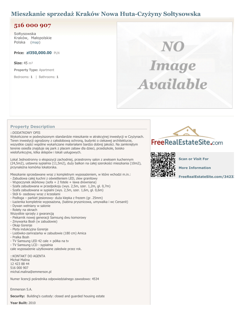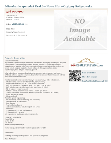 Mieszkanie sprzedaż Kraków Nowa Huta-Czyżyny Sołtysowska 516 000 907 Sołtysowska Kraków, Małopolskie Polska (map) Price: zł350,000.00 PLN Size: 45 m² Property Type: Apartment Bedrooms: 1 | Bathrooms: 1 Property Description ::DODATKOWY OPIS Wykończone w podwyższonym standardzie mieszkanie w atrakcyjnej inwestycji w Czyżynach. Teren inwestycji ogrodzony z całodobową ochroną, budynki o ciekawej architekturze, wszystkie części wspólne wykańczane materiałami bardzo dobrej jakości. Na zamkniętym terenie osiedla znajduje się park z placem zabaw dla dzieci, przedszkole, boisko wielofunkcyjne, kilka sklepów i lokali usługowych. Lokal Jednostronny o ekspozycji zachodniej, przestronny salon z aneksem kuchennym (24,5m2), ustawna sypialnia (11,5m2), duży balkon na całej szerokości mieszkania (10m2), przynależna komórka lokatorska. Mieszkanie sprzedawane wraz z kompletnym wyposażeniem, w które wchodzi m.in.: - Zabudowa całej kuchni z oświetleniem LED, zlew granitowy - Wypoczynek skórkowy (sofa + 2 fotele + ława drewniana) - Szafa zabudowana w przedpokoju (wys. 2,5m, szer. 1,2m, gł. 0,7m) - Szafa zabudowana w sypialni (wys. 2,5m, szer. 1,6m, gł. 0,6m) - Stół 6- osobowy wraz z krzesłami - Podłoga – parkiet jesionowy- duża klepka z frezem (gr. 25mm) - Łazienka kompletnie wyposażona, (kabina prysznicowa, umywalka i wc Cersanit) - Dywan wełniany w salonie - Rolety na oknach Wszystkie sprzęty z gwarancją - Piekarnik nowej generacji Samsung dwu komorowy - Zmywarka Bosh (w zabudowie) - Okap Gorenje - Płyta indukcyjna Gorenje - Lodówko-zamrażarka w zabudowie (180 cm) Amica - Pralka Bosh - TV Samsung LED 42 cale + półka na tv - TV Samsung LCD - sypialnia całe wyposażenie użytkowane zaledwie przez rok. ::KONTAKT DO AGENTA Michał Malina 12 423 88 44 516 000 907 [email protected] Numer licencji pośrednika odpowiedzialnego zawodowo: 4534 Emmerson S.A. Security: Building's custody: closed and guarded housing estate Year Built: 2010 Scan or Visit For More Information FreeRealEstateSite.com/342339 Floors: 5