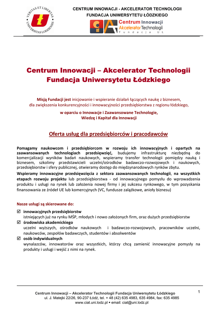 CENTRUM INNOWACJI - AKCELERATOR TECHNOLOGII FUNDACJA UNIWERSYTETU ŁÓDZKIEGO Centrum Innowacji – Akcelerator Technologii Fundacja Uniwersytetu Łódzkiego Misją Fundacji jest inicjowanie i wspieranie działań łączących naukę z biznesem, dla zwiększenia konkurencyjności i innowacyjności przedsiębiorstwa z regionu łódzkiego, w oparciu o Innowacje i Zaawansowane Technologie, Wiedzę i Kapitał dla Innowacji Oferta usług dla przedsiębiorców i pracodawców Pomagamy naukowcom i przedsiębiorcom w rozwoju ich innowacyjnych i opartych na zaawansowanych technologiach przedsięwzięć, budujemy infrastrukturę niezbędną do komercjalizacji wyników badań naukowych, wspieramy transfer technologii pomiędzy nauką i biznesem, szkolimy przedstawicieli uczelni/ośrodków badawczo‐rozwojowych i naukowych, przedsiębiorstw i sfery publicznej, otwieramy dostęp do międzynarodowych rynków zbytu. Wspieramy innowacyjne przedsięwzięcia z sektora zaawansowanych technologii, na wszystkich etapach rozwoju projektu lub przedsiębiorstwa ‐ od innowacyjnego pomysłu do wprowadzenia produktu i usługi na rynek lub założenia nowej firmy i jej sukcesu rynkowego, w tym pozyskania finansowania ze źródeł UE lub komercyjnych (VC, fundusze zalążkowe, anioły biznesu) Nasze usługi są skierowane do: ; innowacyjnych przedsiębiorstw istniejących już na rynku MŚP, młodych i nowo założonych firm, oraz dużych przedsiębiorstw ; środowiska akademickiego uczelni wyższych, ośrodków naukowych i badawczo‐rozwojowych, pracowników uczelni, naukowców, zespołów badawczych, studentów i absolwentów ; osób indywidualnych wynalazców, innowatorów oraz wszystkich, którzy chcą zamienić innowacyjne pomysły na produkty i usługi i wejść z nimi na rynek. Centrum Innowacji – Akcelerator Technologii Fundacja Uniwersytetu Łódzkiego ul. J. Matejki 22/26, 90-237 Łódź, tel. + 48 (42) 635 4983, 635 4984, fax: 635 4985 www.ciat.uni.lodz.pl email: [email protected] 1 CENTRUM INNOWACJI - AKCELERATOR TECHNOLOGII FUNDACJA UNIWERSYTETU ŁÓDZKIEGO Doradztwo biznesowe w obszarze przedsięwzięć opartych na innowacji lub technologii : Wykonujemy analizy biznesowe i rynkowe innowacji, innowacyjnych projektów badawczych i inwestycyjnych, : Wykonujemy oceny innowacyjności – w tym wymagane lub dodatkowe/dobrze widziane przy ubieganiu się o dofinansowanie ze środków UE, oceny możliwości komercjalizacji przedsięwzięć oraz wyceny technologii i firm innowacyjnych : Przeprowadzamy audyt technologiczny w przedsiębiorstwach z określeniem potrzeb firmy, oraz udzieleniem rekomendacji co do rozwiązań. : Innowacyjnym firmom i jednostkom naukowo‐badawczym pomagamy zbudować strategię wdrożenia innowacji lub technologii, oraz przygotować biznes plany dla innowacyjnych przedsięwzięć, w tym plan finansowy i ocenę możliwości finansowania ze źródeł Venture Capital, fundusze zalążkowe, anioły biznesu ; Ocenę przedsięwzięcia pod względem potencjału rynkowego oraz ocenę innowacyjności przeprowadzamy metodami opracowanymi na Uniwersytecie Stanowym Teksasu w Austin ‐ stosowanymi m.in. przez NASA. ; Wycenę technologii i przedsiębiorstwa, w tym nowej/młodej firmy przeprowadzamy metodami odpowiednimi do potrzeby i przedmiotu wyceny, wykorzystując potencjał i doświadczenie naukowców z UŁ oraz współpracujących z nami ekspertów branżowych i analityków finansowych z biznesu i instytucji finansowych. ; Ocena potencjału komercjalizacyjnego przedsięwzięć obejmuje zarówno ocenę technologiii lub innowacji, jak i ocenę potencjału rynkowego. ; Wydana na tej podstawie rekomendacja obejmuje wskazanie kroków niezbędnych w dalszych etapach komercjalizacji, zawiera scenariusze rozwoju przedsięwzięcia, ocenę i wskazanie źródeł finansowania nowego rozwiązania technologicznego, opracowanie strategii komercjalizacji technologii. Finansowanie Projektów ‐ Kapitał na Innowacje : Pomagamy w pozyskaniu finansowania na realizację transferu technologii (np. zakup technologii), oraz na wdrożenia innowacji i technologii ‐ ze środków programów UE oraz z funduszy VC, kapitału zalążkowego i od aniołów biznesu : Znajdujemy finansowanie na zbudowanie i rozwój innowacyjnej firmy ; Pomagamy określić potrzeby finansowe projektu, wybrać odpowiednie źródło finansowania (anioły biznesu, fundusze typu seed finansujące przedsięwzięcia na początkowym i wczesnym etapie rozwoju, fundusze Venture Capital oraz inne źródła kapitału takie jak: programy Unii Europejskiej, fundusze pożyczkowe, kredyty itp.), przygotować plan finansowy przedsięwzięcia oraz strategię wyjścia z inwestycji, a także przygotowujemy do rozmowy z inwestorem oraz pomagamy w negocjacjach i zawarciu umowy inwestycyjnej ; Fundacja UŁ stale współpracuje z funduszami kapitałowymi inwestującymi w nowe innowacyjne przedsięwzięcia, co zapewnia szybką ścieżkę dostępu do kapitału. ; Pomagamy również w aplikowaniu o środki unijne ‐ zarówno w znalezieniu odpowiedniego programu jak i w napisaniu projektu oraz wniosku o dofinansowanie, w szczególności w programach PO Innowacyjna Gospodarka oraz PO Kapitał Ludzki, w tym w pozyskaniu finansowania na projekty inwestycyjne, na projekty „miękkie” – szkolenia itp., na promocję przedsiębiorstw I wejście na rynki zagraniczne. Centrum Innowacji – Akcelerator Technologii Fundacja Uniwersytetu Łódzkiego ul. J. Matejki 22/26, 90-237 Łódź, tel. + 48 (42) 635 4983, 635 4984, fax: 635 4985 www.ciat.uni.lodz.pl email: [email protected] 2 CENTRUM INNOWACJI - AKCELERATOR TECHNOLOGII FUNDACJA UNIWERSYTETU ŁÓDZKIEGO Transfer technologii, Komercjalizacja wyników prac badawczych : Pomagamy w transferze innowacji i technologii z jednostek naukowych i B+R do przemysłu i biznesu w kraju i za granicą, pozyskaniu technologii dla przedsiębiorstw : również w zarządzaniu transferem technologii : Identyfikujemy projekty badawczo