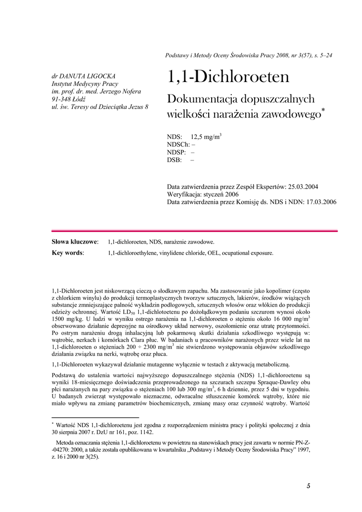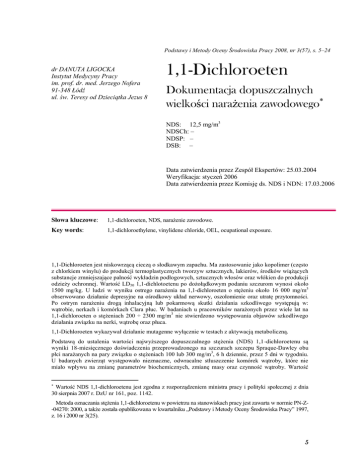 Podstawy i Metody Oceny Środowiska Pracy 2008, nr 3(57), s. 5–24 dr DANUTA LIGOCKA Instytut Medycyny Pracy im. prof. dr. med. Jerzego Nofera 91-348 Łódź ul. św. Teresy od Dzieciątka Jezus 8 1,1-Dichloroeten Dokumentacja dopuszczalnych wielkości narażenia zawodowego NDS: 12,5 mg/m3 NDSCh: – NDSP: – DSB: – Data zatwierdzenia przez Zespół Ekspertów: 25.03.2004 Weryfikacja: styczeń 2006 Data zatwierdzenia przez Komisję ds. NDS i NDN: 17.03.2006 Słowa kluczowe: 1,1-dichloroeten, NDS, narażenie zawodowe. Key words: 1,1-dichloroethylene, vinylidene chloride, OEL, ocupational exposure. 1,1-Dichloroeten jest niskowrzącą cieczą o słodkawym zapachu. Ma zastosowanie jako kopolimer (często z chlorkiem winylu) do produkcji termoplastycznych tworzyw sztucznych, lakierów, środków wiążących substancje zmniejszające palność wykładzin podłogowych, sztucznych włosów oraz włókien do produkcji odzieży ochronnej. Wartość LD50 1,1-dichlotoetenu po dożołądkowym podaniu szczurom wynosi około 1500 mg/kg. U ludzi w wyniku ostrego narażenia na 1,1-dichloroeten o stężeniu około 16 000 mg/m3 obserwowano działanie depresyjne na ośrodkowy układ nerwowy, oszołomienie oraz utratę przytomności. Po ostrym narażeniu drogą inhalacyjną lub pokarmową skutki działania szkodliwego występują w: wątrobie, nerkach i komórkach Clara płuc. W badaniach u pracowników narażonych przez wiele lat na 1,1-dichloroeten o stężeniach 200 ÷ 2300 mg/m3 nie stwierdzono występowania objawów szkodliwego działania związku na nerki, wątrobę oraz płuca. 1,1-Dichloroeten wykazywał działanie mutagenne wyłącznie w testach z aktywacją metaboliczną. Podstawą do ustalenia wartości najwyższego dopuszczalnego stężenia (NDS) 1,1-dichloroetenu są wyniki 18-miesięcznego doświadczenia przeprowadzonego na szczurach szczepu Spraque-Dawley obu płci narażanych na pary związku o stężeniach 100 lub 300 mg/m3, 6 h dziennie, przez 5 dni w tygodniu. U badanych zwierząt występowało nieznaczne, odwracalne stłuszczenie komórek wątroby, które nie miało wpływu na zmianę parametrów biochemicznych, zmianę masy oraz czynność wątroby. Wartość Wartość NDS 1,1-dichloroetenu jest zgodna z rozporządzeniem ministra pracy i polityki społecznej z dnia 30 sierpnia 2007 r. DzU nr 161, poz. 1142. Metoda oznaczania stężenia 1,1-dichloroetenu w powietrzu na stanowiskach pracy jest zawarta w normie PN-Z-04270: 2000, a także została opublikowana w kwartalniku „Podstawy i Metody Oceny Środowiska Pracy” 1997, z. 16 i 2000 nr 3(25). 5 NOAEL dla samic szczura ustalono na poziomie 100 mg/m3. Wartość NDS 1,1-dichloroetenu na poziomie 12,5 mg/m3 powinna zabezpieczyć pracowników przed wystąpieniem skutków szkodliwego działania 1,1-dichloroetenu na wątrobę nerki oraz inne narządy. Obliczona wartość normatywu higienicznego jest zbliżona do przyjętej przez ACGIH oraz obowiązującej w większości państw. W Polsce do tej pory obowiązuje wartość NDS równa 50 mg/m3 dla dichloroetenów – 1,1-dichloroetenu i 1,2-dichloroetenu (cis- i trans-). Związki te wykazują całkowicie odmienne działanie toksyczne i ich wartość normatywu higienicznego jest zbyt duża dla 1,1-dichloroetenu, a zbyt mała dla 1,2-dichloroetenu. Nie ma podstaw do ustalenia wartości najwyższego dopuszczalnego stężenia chwilowego (NDSCh) oraz dopuszczalnego stężenia w materiale biologicznym (DSB) 1,2-dichloroetenu. CHARAKTERYSTYKA SUBSTANCJI Ogólna charakterystyka substancji Ogólna charakterystyka 1,1-dichloroetenu (HSDB 2003): – nazwa chemiczna 1,1-dichloroeten – wzór sumaryczny C2H2Cl2 – wzór strukturalny Cl2C=CH2 – nazwa CAS 1,1-dichloroeten – numer CAS 75-35-4 – numer indeksowy 602-025-00-8 – numer WE 200-864-0 – synonimy 1,1-dichloroetylen i chlorek winylidenu – współczynniki przeliczeniowe 1 ppm 4 mg/m3 i 1 mg/m3 0,25 ppm (w temp. 25 oC i ciśn. 1013 hPa). Zgodnie z rozporządzeniem ministra zdrowia z dnia 28 września 2005 r. w sprawie wykazu substancji niebezpiecznych wraz z ich klasyfikacją i oznakowaniem (DzU 2005, nr 201, poz. 1674) 1,1-dichloroetan został zaklasyfikowany jako produkt niebezpieczny: produkt skrajnie łatwopalny – F+; produkt skrajnie łatwopalny – R12; 3 – substancje, co do których dostępne informacje nie pozwalają na przeprowadzenie zadowalającej oceny. Istniejące dowody pochodzące z odpowiednich badań na zwierzętach nie są wystarczające, aby można było umieścić tę substancję w kategorii 2. – Rakotw. Kat. 3; R40 – ograniczone dowody działania rakotwórczego – produkt szkodliwy – Xn; działa szkodliwie przez drogi oddechowe – R20. Właściwości fizykochemiczne Właściwości fizykochemiczne 1,1-dichloroetenu (HSDB 2003): – postać bezbarwna ciecz o słodkawym zapachu – masa cząsteczkowa 96,94 – temperatura topnienia -122,5 oC – temperatura wrzenia 31,7 oC – gęstość d420 = 1,2129 g/cm3 – gęstość pary nasyconej 3,25 (powietrze = 1) – ciśnienie pary nasyconej 810,4 hPa (w temp. 25 oC) – współczynnik podziału log KOW 2,13 6 – temperatura zapłonu – granica samozapłonu (w temp. 20 o C) – temperatura samozapłonu – stężenie pary nasyconej – rozpuszczalność – rozpuszczalność w wodzie – reaktywność -15 oC (metoda tygla otwartego) i -19 oC (metoda tygla zamkniętego) 5,6% (dolna) i 16% (górna) 513 oC 2640 g/m3 etanol, aceton, benzen i tetrachlorek węgla bardzo dobrze rozpuszczalny w eterze dietylowym i chloroformie 3 g/l (w temp. 16 oC) w obecności tlenu 1,1-dichloroeten tworzy nadtlenki, które mają własności wybuchowe; gwałtownie reaguje ze środkami utleniającymi. Produkcja, zastosowanie, narażenie zawodowe 1,1-Dichloroeten jest otrzymywany w reakcji 1,1,2-trichloroetanu z wodorotlenkiem sodowym lub wapniowym, a następnie oczyszczany drogą bezpośredniej destylacji z mieszaniny reakcyjnej. Związek ma zastosowanie jako kopolimer (często z chlo