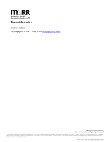 Kontakt dla mediów Kontakt z mediami Edyta Przybylska, tel. 12 617 66 85, e-mail: [email protected] Tekst pochodzi ze strony internetowej Małopolskiej Agencji Rozwoju Regionalnego: www.marr.pl Wykorzystanie m ateriałów zam ieszczonych na stronie www.m arr.pl jest dopuszczalne wyłącznie na zasadach określonych w Ustawie o prawie autorskim i prawach pokrewnych, w zakresie odpowiadającym własnem u użytkowi osobistem u oraz dozwolonem u użytkowi publicznem u. W celu uzyskania zgody na korzystanie z m ateriałów udostępnionych na stronie www.m arr.pl, prosim y o kontakt e-m ailowy: m arketing@m arr.pl. 1 https://www.marr.pl/kontakt-dla-mediow.html