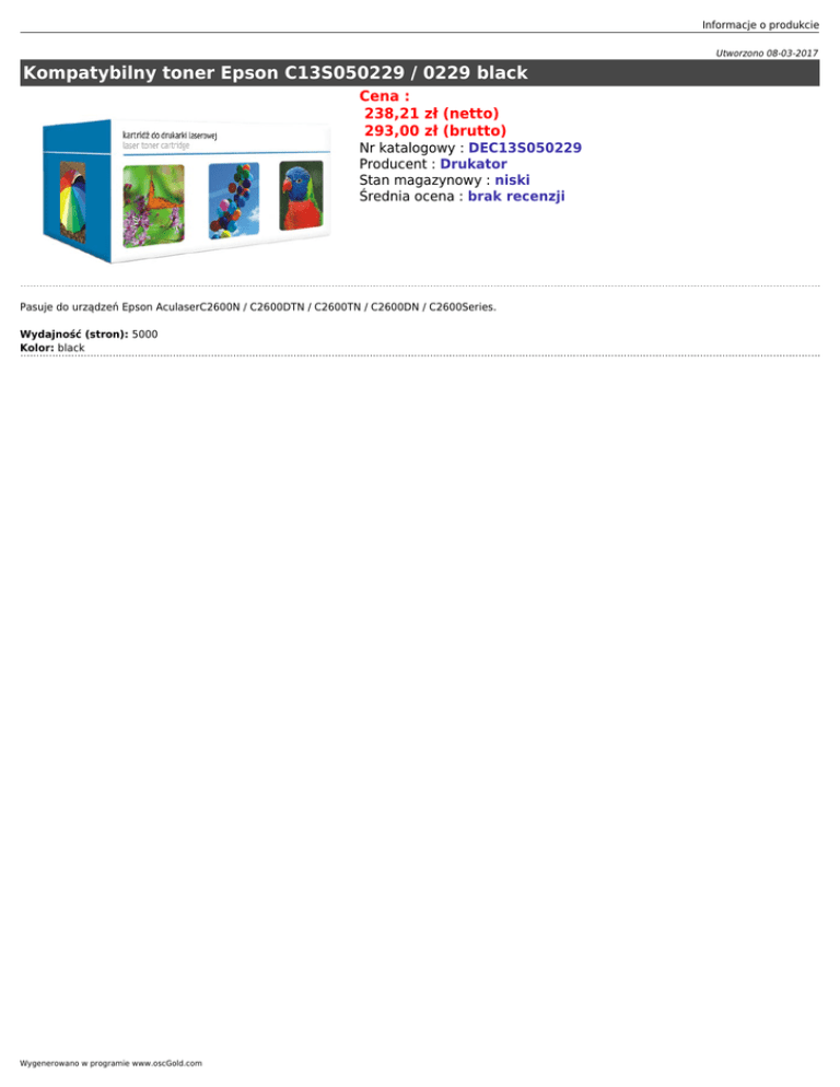 Informacje o produkcie Utworzono 08-03-2017 Kompatybilny toner Epson C13S050229 / 0229 black Cena : 238,21 zł (netto) 293,00 zł (brutto) Nr katalogowy : DEC13S050229 Producent : Drukator Stan magazynowy : niski Średnia ocena : brak recenzji Pasuje do urządzeń Epson AculaserC2600N / C2600DTN / C2600TN / C2600DN / C2600Series. Wydajność (stron): 5000 Kolor: black Wygenerowano w programie www.oscGold.com