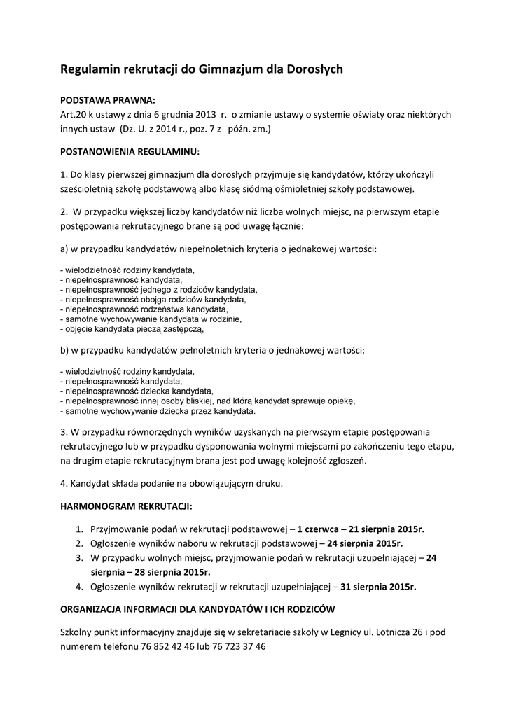 Regulamin rekrutacji do Gimnazjum dla Dorosłych PODSTAWA PRAWNA: Art.20 k ustawy z dnia 6 grudnia 2013 r. o zmianie ustawy o systemie oświaty oraz niektórych innych ustaw (Dz. U. z 2014 r., poz. 7 z późn. zm.) POSTANOWIENIA REGULAMINU: 1. Do klasy pierwszej gimnazjum dla dorosłych przyjmuje się kandydatów, którzy ukończyli sześcioletnią szkołę podstawową albo klasę siódmą ośmioletniej szkoły podstawowej. 2. W przypadku większej liczby kandydatów niż liczba wolnych miejsc, na pierwszym etapie postępowania rekrutacyjnego brane są pod uwagę łącznie: a) w przypadku kandydatów niepełnoletnich kryteria o jednakowej wartości: - wielodzietność rodziny kandydata, - niepełnosprawność kandydata, - niepełnosprawność jednego z rodziców kandydata, - niepełnosprawność obojga rodziców kandydata, - niepełnosprawność rodzeństwa kandydata, - samotne wychowywanie kandydata w rodzinie, - objęcie kandydata pieczą zastępczą, b) w przypadku kandydatów pełnoletnich kryteria o jednakowej wartości: - wielodzietność rodziny kandydata, - niepełnosprawność kandydata, - niepełnosprawność dziecka kandydata, - niepełnosprawność innej osoby bliskiej, nad którą kandydat sprawuje opiekę, - samotne wychowywanie dziecka przez kandydata. 3. W przypadku równorzędnych wyników uzyskanych na pierwszym etapie postępowania rekrutacyjnego lub w przypadku dysponowania wolnymi miejscami po zakończeniu tego etapu, na drugim etapie rekrutacyjnym brana jest pod uwagę kolejność zgłoszeń. 4. Kandydat składa podanie na obowiązującym druku. HARMONOGRAM REKRUTACJI: 1. Przyjmowanie podań w rekrutacji podstawowej – 1 czerwca – 21 sierpnia 2015r. 2. Ogłoszenie wyników naboru w rekrutacji podstawowej – 24 sierpnia 2015r. 3. W przypadku wolnych miejsc, przyjmowanie podań w rekrutacji uzupełniającej – 24 sierpnia – 28 sierpnia 2015r. 4. Ogłoszenie wyników rekrutacji w rekrutacji uzupełniającej – 31 sierpnia 2015r. ORGANIZACJA INFORMACJI DLA KANDYDATÓW I ICH RODZICÓW Szkolny punkt informacyjny znajduje się w sekretariacie szkoły w Legnicy ul. Lotnicza 26 i pod numerem telefonu 76 852 42 46 lub 76 723 37 46