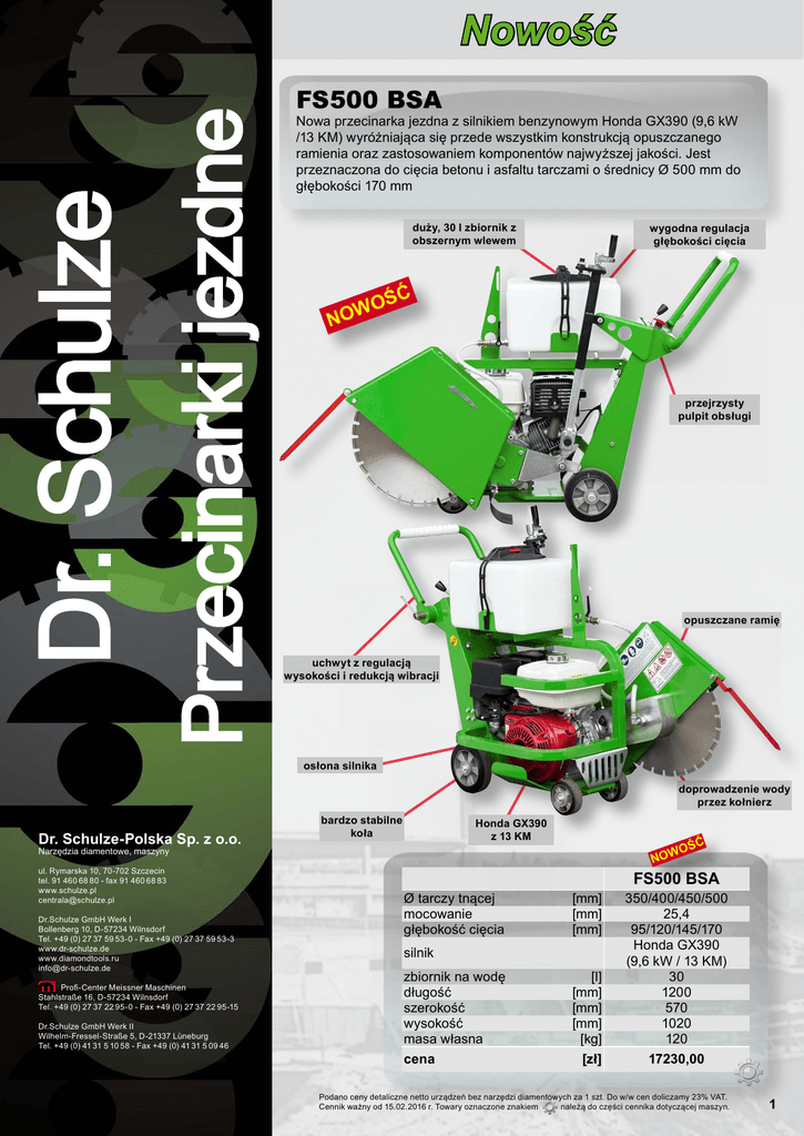 Przecinarki jezdne Dr. Schulze Nowość FS500 BSA Nowa przecinarka jezdna z silnikiem benzynowym Honda GX390 (9,6 kW /13 KM) wyróżniająca się przede wszystkim konstrukcją opuszczanego ramienia oraz zastosowaniem komponentów najwyższej jakości. Jest przeznaczona do cięcia betonu i asfaltu tarczami o średnicy Ø 500 mm do głębokości 170 mm duży, 30 l zbiornik z obszernym wlewem wygodna regulacja głębokości cięcia ŚĆ O OW N przejrzysty pulpit obsługi opuszczane ramię uchwyt z regulacją wysokości i redukcją wibracji osłona silnika doprowadzenie wody przez kołnierz Dr. Schulze-Polska Sp. z o.o. bardzo stabilne koła Honda GX390 z 13 KM ul. Rymarska 10, 70-702 Szczecin tel. 91 460 68 80 - fax 91 460 68 83 www.schulze.pl [email protected] Dr.Schulze GmbH Werk I Bollenberg 10, D-57234 Wilnsdorf Tel. +49 (0) 27 37 59 53-0 - Fax +49 (0) 27 37 59 53-3 www.dr-schulze.de www.diamondtools.ru [email protected] Profi-Center Meissner Maschinen Stahlstraße 16, D-57234 Wilnsdorf Tel. +49 (0) 27 37 22 95-0 - Fax +49 (0) 27 37 22 95-15 Dr.Schulze GmbH Werk II Wilhelm-Fressel-Straße 5, D-21337 Lüneburg Tel. +49 (0) 41 31 5 10 58 - Fax +49 (0) 41 31 5 09 46 NO Ø tarczy tnącej mocowanie głębokość cięcia [mm] [mm] [mm] silnik zbiornik na wodę długość szerokość wysokość masa własna cena ŚĆ WO Narzędzia diamentowe, maszyny [l] [mm] [mm] [mm] [kg] [zł] FS500 BSA 350/400/450/500 25,4 95/120/145/170 Honda GX390 (9,6 kW / 13 KM) 30 1200 570 1020 120 17230,00 Podano ceny detaliczne netto urządzeń bez narzędzi diamentowych za 1 szt. Do w/w cen doliczamy 23% VAT. Cennik ważny od 15.02.2016 r. Towary oznaczone znakiem należą do części cennika dotyczącej maszyn. 1 Przecinarki jezdne spalinowe i elektryczne FS 350 Tornado 1 FS 350 Tornado 2 Przecinarka jezdna ze zdejmowanym, 20 l zbiornikiem na wodę i o głębokości cięcia do 105 mm (FS 350 Tornado 1) lub do 125 mm (FS 350 Tornado 2) -4 kW / 5,5 KM (Tornado 1) lub 6,6 kW / 9 KM (Tornado 2) silnik benzynowy Honda -bezstopniowe opuszczanie i podnoszenie tarczy -automatyczne wyłączanie przy braku oleju -ten sam wózek w obydwu typach FS 450 BWT FS 500 BWT plus OŚĆ W NO Przecinarka jezdna ze zdejmowanym, 20 l zbiornikiem na wodę i o głębokości cięcia do 172 mm (FS 450 BWT) lub do 195 mm (FS 500 BWT plus) -9,6 kW (13 KM) silnik benzynowy Honda -centralne chłodzenie tarczy wodą przez kołnierz mocujący -bezstopniowe opuszczanie i podnoszenie tarczy -automatyczne wyłączanie przy braku oleju -hamulec transportowy FS 450 E Przecinarka jezdna z trójfazowym silnikiem elektrycznym o mocy 4 kW i o głębokości cięcia do 172 mm -centralne chłodzenie tarczy wodą przez kołnierz mocujący -bezstopniowe opuszczanie i podnoszenie tarczy -hamulec transportowy -cięcie z prawej lub lewej strony OŚĆ W NO FS 800 EHH Przecinarka jezdna z trójfazowym silnikiem elektrycznym o mocy 7,5 kW i o głębokości cięcia do 315 mm 2 -zdejmowany silnik dla ułatwienia transportu -dwudzielna osłona tarczy -cięcie z prawej lub lewej strony -napęd przez pasek zębaty -hydrauliczna regulacja głębokości cięcia Podano ceny detaliczne netto urządzeń bez narzędzi diamentowych za 1 szt. Do w/w cen doliczamy 23% VAT. Cennik ważny od 15.02.2016 r. Towary oznaczone znakiem należą do części cennika dotyczącej maszyn. Przecinarki jezdne elektryczne OŚĆ W NO FS 800 E -- łatwe prowadzenie i nie męcząca praca dzięki bardzo dobremu wyważeniu -- uchwyt z regulacją wysokości -- wysoka stabilność dzięki odpowiedniemu rozmieszczeniu kół -- płynna regulacja głębokości cięcia -- centralny pulpit sterowniczy zapewniający wygodną obsługę -- przełącznik fazy i kontrolki świetlne do sterowania kierunkiem obrotu tarczy -- napęd poprzez łatwą w regulacji przekładnię pasową -- zaczepy dźwigowe do transportu -- demontowalna przednia część obudowy tarczy dla umożliwienia cięcia w narożnikach -- hamulec transportowy -- elementy konstrukcji malowane proszkowo -- cięcie z prawej lub lewej strony Zwarta i łatwa w obsłudze przecinarka jezdna z silnikiem elektrycznym, do tarcz o średnicy Ø 800 mm i o głębokości cięcia do 340 mm FS 1000 EVH Przecinarka jezdna z silnikiem elektrycznym o mocy 15 kW, z posuwem elektrohydraulicznym i o głębokości cięcia do 425 (520) mm -posuw elektrohydrauliczny -pompa ręczna do awaryjnego podnoszenia tarczy -dwudzielna osłona tarczy -cięcie z prawej lub lewej strony -hydrauliczna regulacja głębokości cięcia -na zapytanie dostępna jest wersja do tarczy o średnicy Ø 1200 mm FS 350 FS 350 FS 450 Tornado 1 Tornado 2 BWT Ø średnica tarczy [mm] mocowanie [mm] głębokość cięcia [mm] silnik długość szerokość wysokość ciężar [mm] [mm] [mm] [kg] 350 350 25,4 (1‘‘), 1 NL Ø 12,TK 57,4 105 125 4 kW 6,6 kW (Honda) (Honda) 950 950 480 480 1050 1050 65 75 450 ŚĆ WO NO FS 500 BWT plus FS 450 E ŚĆ WO NO FS 800 EHH 500 450 800 25,4 (1‘‘), 1 NL Ø 12,TK 57,4 172 195 9,6 kW (Honda GX 390) 880 460 900 84 900 460 920 88 25,4 (1‘‘) 1 NL Ø 12, TK 57,4 172 315 4,0 kW 7,5 kW 400 V 400 V 830 650 650 600 770 600 2 95 118 ŚĆ WO NO FS 800 FS 1000 E EVH 800 1000 (1200 1) 60 50 340 10 kW 400 V 1680 2 670 840 198 425 (520 1) 15 kW 400 V 1150 760 1000 360 cena [zł] 5390,00 6990,00 10950,00 10480,00 11590,00 26190,00 31430,00 75610,00 dodatkowy ciężar (20 kg) [zł] - - - - 410,00 410,00 - - centralne chłodzenie wodą przez kołnierz moc. [zł] - - seryjnie seryjnie seryjnie - - 2060,00 1 2 opcjonalnie - cena na zapytanie bez celownika i przy wsuniętej kierownicy Podano ceny detaliczne netto urządzeń bez narzędzi diamentowych za 1 szt. Do w/w cen doliczamy 23% VAT. Cennik ważny od 15.02.2016 r. Towary oznaczone znakiem należą do części cennika dotyczącej maszyn. 3 Maszyny specjalne / frezarki FF 200 E Poręczna, lekka w transporcie, elektryczna frezarka do fazowania krawędzi gotowych szczelin dylatacyjnych w betonie -płynna regulacja głęboko