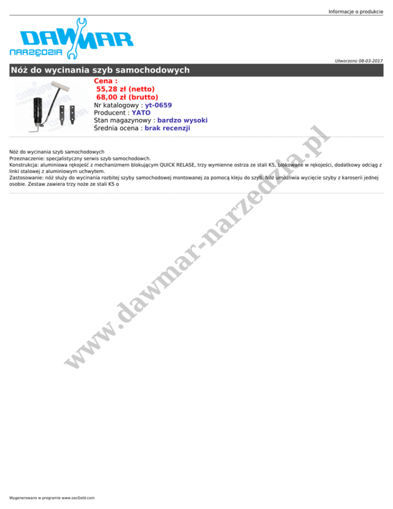 Informacje o produkcie Utworzono 08-03-2017 Nóż do wycinania szyb samochodowych Cena : 55,28 zł (netto) 68,00 zł (brutto) zi a. p l Nr katalogowy : yt-0659 Producent : YATO Stan magazynowy : bardzo wysoki Średnia ocena : brak recenzji w w w .d aw m ar -n ar ze d Nóż do wycinania szyb samochodowych Przeznaczenie: specjalistyczny serwis szyb samochodowch. Konstrukcja: aluminiowa rękojeść z mechanizmem blokującym QUICK RELASE, trzy wymienne ostrza ze stali K5, blokowane w rękojeści, dodatkowy odciąg z linki stalowej z aluminiowym uchwytem. Zastosowanie: nóż służy do wycinania rozbitej szyby samochodowej montowanej za pomocą kleju do szyb. Nóż umożliwia wycięcie szyby z karoserii jednej osobie. Zestaw zawiera trzy noże ze stali K5 o Wygenerowano w programie www.oscGold.com
