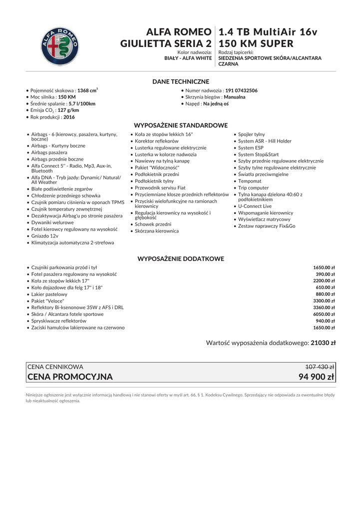 ALFA ROMEO 1.4 TB MultiAir 16v GIULIETTA SERIA 2 150 KM SUPER Kolor nadwozia: BIAŁY - ALFA WHITE Rodzaj tapicerki: SIEDZENIA SPORTOWE SKÓRA/ALCANTARA CZARNA DANE TECHNICZNE • Pojemność skokowa : 1368 cm3 • Moc silnika : 150 KM • Średnie spalanie : 5,7 l/100km • Emisja CO2 : 127 g/km • Rok produkcji : 2016 • Numer nadwozia : 191 07432506 • Skrzynia biegów : Manualna • Napęd : Na jedną oś WYPOSAŻENIE STANDARDOWE • Airbags - 6 (kierowcy, pasażera, kurtyny, boczne) • Airbags - Kurtyny boczne • Airbags pasażera • Airbags przednie boczne • Alfa Connect 5'' - Radio, Mp3, Aux-in, Bluetooth • Alfa DNA - Tryb jazdy: Dynamic/ Natural/ All Weather • Białe podświetlenie zegarów • Chłodzenie przedniego schowka • Czujnik pomiaru ciśnienia w oponach TPMS • Czujnik temperatury zewnętrznej • Dezaktywacja Airbag'u po stronie pasażera • Dywaniki welurowe • Fotel kierowcy regulowany na wysokość • Gniazdo 12v • Klimatyzacja automatyczna 2-strefowa • • • • • • • • • • • Koła ze stopów lekkich 16" Korektor reflekorów Lusterka regulowane elektrycznie Lusterka w kolorze nadwozia Nawiewy na tylną kanapę Pakiet "Widoczność" Podłokietnik przedni Podłokietnik tylny Przewodnik servisu Fiat Przyciemniane klosze przednich reflektorów Przyciski wielofunkcyjne na ramionach kierownicy • Regulacja kierownicy na wysokość i głębokość • Schowek przedni • Skórzana kierownica • • • • • • • • • • • • • • Spojler tylny System ASR - Hill Holder System ESP System Stop&Start Szyby przednie regulowane elektrycznie Szyby tylne regulowane elektrycznie Światła przeciwmgielne Tempomat Trip computer Tylna kanapa dzielona 40:60 z podłokietnikiem U-Connect Live Wspomaganie kierownicy Wyświetlacz matrycowy Zestaw naprawczy Fix&Go WYPOSAŻENIE DODATKOWE • • • • • • • • • • Czujniki parkowania przód i tył Fotel pasażera regulowany na wysokość Koła ze stopów lekkich 17" Koło dojazdowe dla felg 17" i 18" Lakier pastelowy Pakiet "Veloce" Reflektory Bi-ksenonowe 35W z AFS i DRL Skóra / Alcantara fotele sportowe Spryskiwacze reflektorów Zaciski hamulców lakierowane na czerwono 1650.00 zł 390.00 zł 2200.00 zł 610.00 zł 880.00 zł 3300.00 zł 3360.00 zł 6050.00 zł 940.00 zł 1650.00 zł Wartość wyposażenia dodatkowego: 21030 zł CENA CENNIKOWA CENA PROMOCYJNA 107 430 zł 94 900 zł Niniejsze ogłoszenie jest wyłącznie informacją handlową i nie stanowi oferty w myśl art. 66, § 1. Kodeksu Cywilnego. Sprzedający nie odpowiada za ewentualne błędy lub nieaktualność ogłoszenia.