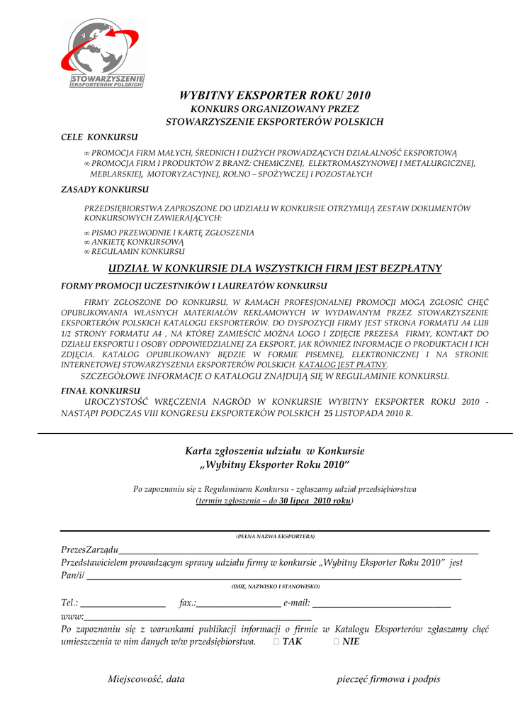 WYBITNY EKSPORTER ROKU 2010 KONKURS ORGANIZOWANY PRZEZ STOWARZYSZENIE EKSPORTERÓW POLSKICH CELE KONKURSU • PROMOCJA FIRM MAŁYCH, ŚREDNICH I DUŻYCH PROWADZĄCYCH DZIAŁALNOŚĆ EKSPORTOWĄ • PROMOCJA FIRM I PRODUKTÓW Z BRANŻ: CHEMICZNEJ, ELEKTROMASZYNOWEJ I METALURGICZNEJ, MEBLARSKIEJ, MOTORYZACYJNEJ, ROLNO – SPOŻYWCZEJ I POZOSTAŁYCH ZASADY KONKURSU PRZEDSIĘBIORSTWA ZAPROSZONE DO UDZIAŁU W KONKURSIE OTRZYMUJĄ ZESTAW DOKUMENTÓW KONKURSOWYCH ZAWIERAJĄCYCH: • PISMO PRZEWODNIE I KARTĘ ZGŁOSZENIA • ANKIETĘ KONKURSOWĄ • REGULAMIN KONKURSU UDZIAŁ W KONKURSIE DLA WSZYSTKICH FIRM JEST BEZPŁATNY FORMY PROMOCJI UCZESTNIKÓW I LAUREATÓW KONKURSU FIRMY ZGŁOSZONE DO KONKURSU, W RAMACH PROFESJONALNEJ PROMOCJI MOGĄ ZGŁOSIĆ CHĘĆ OPUBLIKOWANIA WŁASNYCH MATERIAŁÓW REKLAMOWYCH W WYDAWANYM PRZEZ STOWARZYSZENIE EKSPORTERÓW POLSKICH KATALOGU EKSPORTERÓW. DO DYSPOZYCJI FIRMY JEST STRONA FORMATU A4 LUB 1/2 STRONY FORMATU A4 , NA KTÓREJ ZAMIEŚCIĆ MOŻNA LOGO I ZDJĘCIE PREZESA FIRMY, KONTAKT DO DZIAŁU EKSPORTU I OSOBY ODPOWIEDZIALNEJ ZA EKSPORT, JAK RÓWNIEŻ INFORMACJE O PRODUKTACH I ICH ZDJĘCIA. KATALOG OPUBLIKOWANY BĘDZIE W FORMIE PISEMNEJ, ELEKTRONICZNEJ I NA STRONIE INTERNETOWEJ STOWARZYSZENIA EKSPORTERÓW POLSKICH. KATALOG JEST PŁATNY. SZCZEGÓŁOWE INFORMACJE O KATALOGU ZNAJDUJĄ SIĘ W REGULAMINIE KONKURSU. FINAŁ KONKURSU UROCZYSTOŚĆ WRĘCZENIA NAGRÓD W KONKURSIE WYBITNY EKSPORTER ROKU 2010 NASTĄPI PODCZAS VIII KONGRESU EKSPORTERÓW POLSKICH 25 LISTOPADA 2010 R. Karta zgłoszenia udziału w Konkursie „Wybitny Eksporter Roku 2010” Po zapoznaniu się z Regulaminem Konkursu - zgłaszamy udział przedsiębiorstwa (termin zgłoszenia – do 30 lipca 2010 roku) (PEŁNA NAZWA EKSPORTERA) PrezesZarządu____________________________________________________________________________ Przedstawicielem prowadzącym sprawy udziału firmy w konkursie „Wybitny Eksporter Roku 2010” jest Pan/i/ _______________________________________________________________________________ (IMIĘ, NAZWISKO I STANOWISKO) Tel.: __________________ fax.:__________________ e-mail: _______________________ www:________________________________________________ Po zapoznaniu się z warunkami publikacji informacji o firmie w Katalogu Eksporterów zgłaszamy chęć umieszczenia w nim danych w/w przedsiębiorstwa. TAK NIE Miejscowość, data pieczęć firmowa i podpis