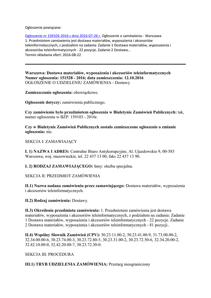 Ogłoszenie powiązane: Ogłoszenie nr 159103-2016 z dnia 2016-07-26 r. Ogłoszenie o zamówieniu - Warszawa 1. Przedmiotem zamówienia jest dostawa materiałów, wyposażenia i akcesoriów teleinformatycznych, z podziałem na zadania: Zadanie 1 Dostawa materiałów, wyposażenia i akcesoriów teleinformatycznych - 22 pozycje. Zadanie 2 Dostawa... Termin składania ofert: 2016-08-22 Warszawa: Dostawa materiałów, wyposażenia i akcesoriów teleinformatycznych Numer ogłoszenia: 151528 - 2016; data zamieszczenia: 12.10.2016 OGŁOSZENIE O UDZIELENIU ZAMÓWIENIA - Dostawy Zamieszczanie ogłoszenia: obowiązkowe. Ogłoszenie dotyczy: zamówienia publicznego. Czy zamówienie było przedmiotem ogłoszenia w Biuletynie Zamówień Publicznych: tak, numer ogłoszenia w BZP: 159103 - 2016r. Czy w Biuletynie Zamówień Publicznych zostało zamieszczone ogłoszenie o zmianie ogłoszenia: nie. SEKCJA I: ZAMAWIAJĄCY I. 1) NAZWA I ADRES: Centralne Biuro Antykorupcyjne, Al. Ujazdowskie 9, 00-583 Warszawa, woj. mazowieckie, tel. 22 437 13 00, faks 22 437 13 90. I. 2) RODZAJ ZAMAWIAJĄCEGO: Inny: służba specjalna. SEKCJA II: PRZEDMIOT ZAMÓWIENIA II.1) Nazwa nadana zamówieniu przez zamawiającego: Dostawa materiałów, wyposażenia i akcesoriów teleinformatycznych. II.2) Rodzaj zamówienia: Dostawy. II.3) Określenie przedmiotu zamówienia: 1. Przedmiotem zamówienia jest dostawa materiałów, wyposażenia i akcesoriów teleinformatycznych, z podziałem na zadania: Zadanie 1 Dostawa materiałów, wyposażenia i akcesoriów teleinformatycznych - 22 pozycje. Zadanie 2 Dostawa materiałów, wyposażenia i akcesoriów teleinformatycznych - 81 pozycji.. II.4) Wspólny Słownik Zamówień (CPV): 30.23.11.00-2, 30.23.41.00-9, 31.73.00.00-2, 32.34.00.00-6, 30.23.74.00-3, 30.23.72.80-5, 30.23.31.00-2, 30.23.72.50-6, 32.34.20.00-2, 32.42.10.00-0, 32.42.20.00-7, 30.23.72.30-0. SEKCJA III: PROCEDURA III.1) TRYB UDZIELENIA ZAMÓWIENIA: Przetarg nieograniczony III.2) INFORMACJE ADMINISTRACYJNE Zamówienie dotyczy projektu/programu finansowanego ze środków Unii Europejskiej: nie SEKCJA IV: UDZIELENIE ZAMÓWIENIA Część NR: 1 Nazwa: Dostawa materiałów, wyposażenia i akcesoriów teleinformatycznych - 22 pozycje IV.1) DATA UDZIELENIA ZAMÓWIENIA: 12.10.2016. IV.2) LICZBA OTRZYMANYCH OFERT: 3. IV.3) LICZBA ODRZUCONYCH OFERT: 2. IV.4) NAZWA I ADRES WYKONAWCY, KTÓREMU UDZIELONO ZAMÓWIENIA: Komputronik Biznes Sp. z o.o., ul. Wołczyoska 37, 60-003 Poznao, kraj/woj. wielkopolskie. IV.5) Szacunkowa wartość zamówienia (bez VAT): 295121,95 PLN. IV.6) INFORMACJA O CENIE WYBRANEJ OFERTY ORAZ O OFERTACH Z NAJNIŻSZĄ I NAJWYŻSZĄ CENĄ Cena wybranej oferty: 353922,80 Oferta z najniższą ceną: 310230,60 / Oferta z najwyższą ceną: 359766,39 Waluta: PLN . Część NR: 2 Nazwa: Dostawa materiałów, wyposażenia i akcesoriów teleinformatycznych - 81 pozycji IV.1) DATA UDZIELENIA ZAMÓWIENIA: 12.10.2016. IV.2) LICZBA OTRZYMANYCH OFERT: 2. IV.3) LICZBA ODRZUCONYCH OFERT: . IV.4) NAZWA I ADRES WYKONAWCY, KTÓREMU UDZIELONO ZAMÓWIENIA: Komputronik Biznes Sp. z o.o., ul. Wołczyoska 37, 60-003 Poznao, kraj/woj. wielkopolskie. IV.5) Szacunkowa wartość zamówienia (bez VAT): 83739,84 PLN. IV.6) INFORMACJA O CENIE WYBRANEJ OFERTY ORAZ O OFERTACH Z NAJNIŻSZĄ I NAJWYŻSZĄ CENĄ Cena wybranej oferty: 86748,96 Oferta z najniższą ceną: 86748,96 / Oferta z najwyższą ceną: 89913,00 Waluta: PLN .