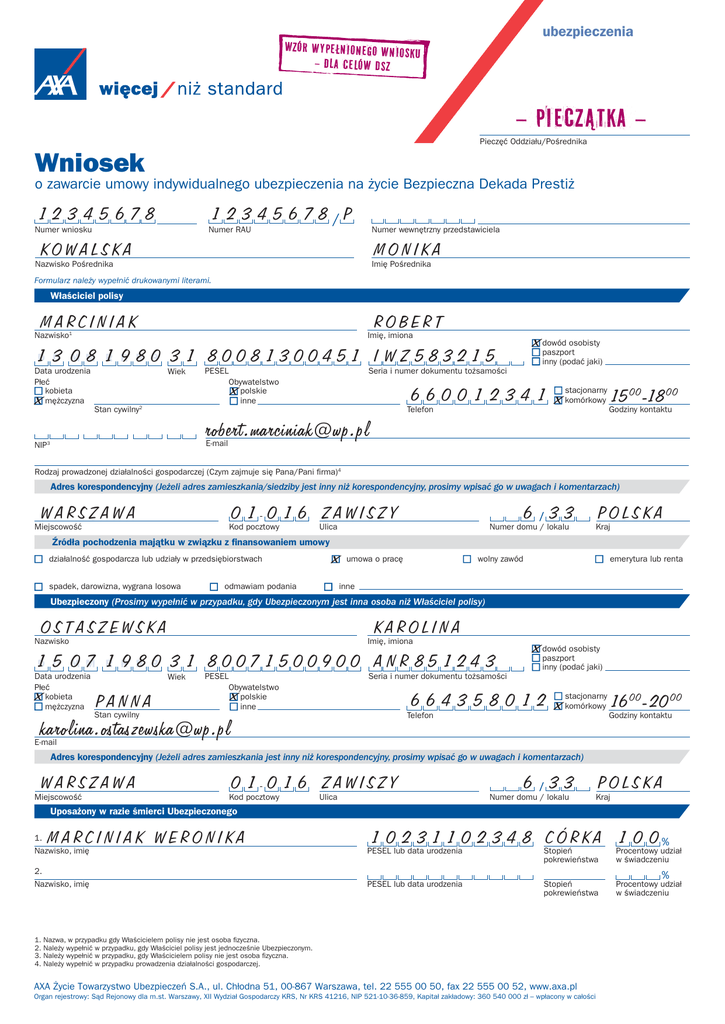 ubezpieczenia Wzór wypełnionego wnios ku – dla celów DSZ – pieczątka – Pieczęć Oddziału/Pośrednika Wniosek o zawarcie umowy indywidualnego ubezpieczenia na życie Bezpieczna Dekada Prestiż 12345678 1 2 3 4 5 6 7 8 /P Numer wniosku Numer RAU Numer wewnętrzny przedstawiciela KOWALSKA MONIKA Nazwisko Pośrednika Imię Pośrednika Formularz należy wypełnić drukowanymi literami. Właściciel polisy MARCINIAK ROBERT Nazwisko1 Imię, imiona X dowód osobisty 1 3 0 8 1 9 80 3 1 8008 1 30045 1 I WZ5832 1 5 paszport inny (podać jaki) D D M M R R R R Data urodzenia Płeć kobieta X mężczyzna Wiek Seria i numer dokumentu tożsamości PESEL Obywatelstwo X polskie inne 6600 1 234 1 Stan cywilny2 Telefon 15 00-18 00 stacjonarny X komórkowy Godziny kontaktu robert.marciniak @ wp.pl E-mail NIP3 Rodzaj prowadzonej działalności gospodarczej (Czym zajmuje się Pana/Pani firma)4 Adres korespondencyjny (Jeżeli adres zamieszkania/siedziby jest inny niż korespondencyjny, prosimy wpisać go w uwagach i komentarzach) WARSZAWA 0 1 0 1 6 ZAWISZY Miejscowość Kod pocztowy 6 33 Ulica Numer domu / lokalu POLSKA Kraj Źródła pochodzenia majątku w związku z finansowaniem umowy działalność gospodarcza lub udziały w przedsiębiorstwach spadek, darowizna, wygrana losowa X odmawiam podania umowa o pracę wolny zawód emerytura lub renta inne Ubezpieczony (Prosimy wypełnić w przypadku, gdy Ubezpieczonym jest inna osoba niż Właściciel polisy) OSTASZEWSKA KAROLINA Nazwisko Imię, imiona 1 5 0 7 1 9 80 3 1 8007 1 500900 ANR 85 1 24 3 D D M M R R R R Data urodzenia Płeć X kobieta mężczyzna Wiek PANNA X dowód osobisty paszport inny (podać jaki) Seria i numer dokumentu tożsamości PESEL Obywatelstwo X polskie inne 6643580 12 Stan cywilny Telefon karolina.ostaszewska @ wp.pl 16 00-20 00 stacjonarny X komórkowy Godziny kontaktu E-mail Adres korespondencyjny (Jeżeli adres zamieszkania jest inny niż korespondencyjny, prosimy wpisać go w uwagach i komentarzach) WARSZAWA Miejscowość 0 1 0 1 6 ZAWISZY Kod pocztowy Ulica 6 33 Numer domu / lokalu POLSKA Kraj Uposażony w razie śmierci Ubezpieczonego 1. MARCINIAK WERONIKA Nazwisko, imię 1 0 2 3 1 1 0 2 3 4 8 CÓRKA 1 0 0% PESEL lub data urodzenia Stopień pokrewieństwa Procentowy udział w świadczeniu PESEL lub data urodzenia Stopień pokrewieństwa Procentowy udział w świadczeniu 2. Nazwisko, imię 1. 2. 3. 4. Nazwa, w przypadku gdy Właścicielem polisy nie jest osoba fizyczna. Należy wypełnić w przypadku, gdy Właściciel polisy jest jednocześnie Ubezpieczonym. Należy wypełnić w przypadku, gdy Właścicielem polisy nie jest osoba fizyczna. Należy wypełnić w przypadku prowadzenia działalności gospodarczej. AXA Życie Towarzystwo Ubezpieczeń S.A., ul. Chłodna 51, 00-867 Warszawa, tel. 22 555 00 50, fax 22 555 00 52, www.axa.pl Organ rejestrowy: Sąd Rejonowy dla m.st. Warszawy, XII Wydział Gospodarczy KRS, Nr KRS 41216, NIP 521-10-36-859, Kapitał zakładowy: 360 540 000 zł – wpłacony w całości % Wybrany wariant ubezpieczenia (prosimy zakreślić kwadrat pod wybranym wariantem, zgodnie z wybraną częstotliwością opłacania składki) Świadczenie (zł) Zakres Wariant A+ Wariant B Wariant B+ Wariant C Wariant C+ 100 000 500 000 500 000 1 000 000 1 000 000 maks. 50 000 maks. 250 000 maks. 250 000 maks. 500 000 maks. 500 000 Śmierć Ubezpieczonego w następstwie NW Inwalidztwo Ubezpieczonego w następstwie NW (wysokość świadczenia za 100% inwalidztwa) Niezdolność Ubezpieczonego do pracy zarobkowej* następstwo choroby 500 (miesięczne świadczenie okresowe) następstwo NW 1 000 (miesięczne świadczenie okresowe) Śmierć Ubezpieczonego w następstwie zawału serca lub udaru mózgu Śmierć Ubezpieczonego Doraźna informacja medyczna Doraźna opieka medyczna – następstwo choroby 1 000 (miesięczne świadczenie okresowe) następstwo NW 2 000 (miesięczne świadczenie okresowe) – następstwo choroby 2 000 (miesięczne świadczenie okresowe) następstwo NW 4 000 (miesięczne świadczenie okresowe) 10 000 10 000 10 000 10 000 10 000 800 1 900 2 100 3 500 4 000 Szczegóły dotyczące przysługujących świadczeń opisane są w Regulaminie doraźnej informacji medycznej oraz w Regulaminie doraźnej opieki medycznej. Składka (zł) Roczna 800,00 1 900,00 2 100,00 3 500,00 4 000,00 Półroczna 416,00 988,00 1 092,00 1 820,00 2 080,00 Kwartalna 212,00 503,50 556,50 927,50 1 060,00 Miesięczna 72,00 171,00 X 189,00 315,00 360,00 * Ochrona ubezpieczeniowa z tytułu niezdolności Ubezpieczonego do pracy zarobkowej wygasa w rocznicę polisy następującą po osiągnięciu przez Ubezpieczonego: – wieku emerytalnego – w przypadku niezdolności Ubezpieczonego do pracy zarobkowej w następstwie NW, – 55. roku życia – w przypadku niezdolności Ubezpieczonego do pracy zarobkowej w następstwie choroby. W przypadku Ubezpieczonych, którzy w dniu podpisania wniosku ubezpieczeniowego osiągnęli 55. rok życia, zakres ubezpieczenia nie obejmuje niezdolności Ubezpieczonego do pracy zarobkowej w następstwie choroby. Uwagi i komentarze UBEZPIECZONY – ADRES ZAMIESZKANIA: UL. SOKOŁOWSKA 4/49, 08-324 WARSZAWA Oświadczenia Oświadczenie Ubezpieczonego (dotyczy wyłącznie wniosków o zawarcie umowy ubezpieczenia w wariancie A+, B+, C+) Oświadczam, że nigdy nie pobierałem(am) świadczenia rentowego lub rehabilitacyjnego przez okres dłuższy niż 6 miesięcy. Zaznacza Ubezpieczony X Tak Oświadczenia Właściciela polisy i Ubezpieczonego Oświadczam, że otrzymałem(am) Ogólne warunki indywidualnego ubezpieczenia na życie Bezpieczna Dekada Prestiż, na podstawie których zawarta zostanie zgodnie z niniejszym wnioskiem umowa ubezpieczenia na życie, zapoznałem(am) się z ww. dokumentem, jest on dla mnie zrozumiały i w pełni go akceptuję. Zaznacza Właściciel polisy X Tak Oświadczam, że zapoznałem(am) się z wyłączeniami odpowiedzialności AXA wskazanymi w § 16 Ogólnych warunków indywidualnego ubezp