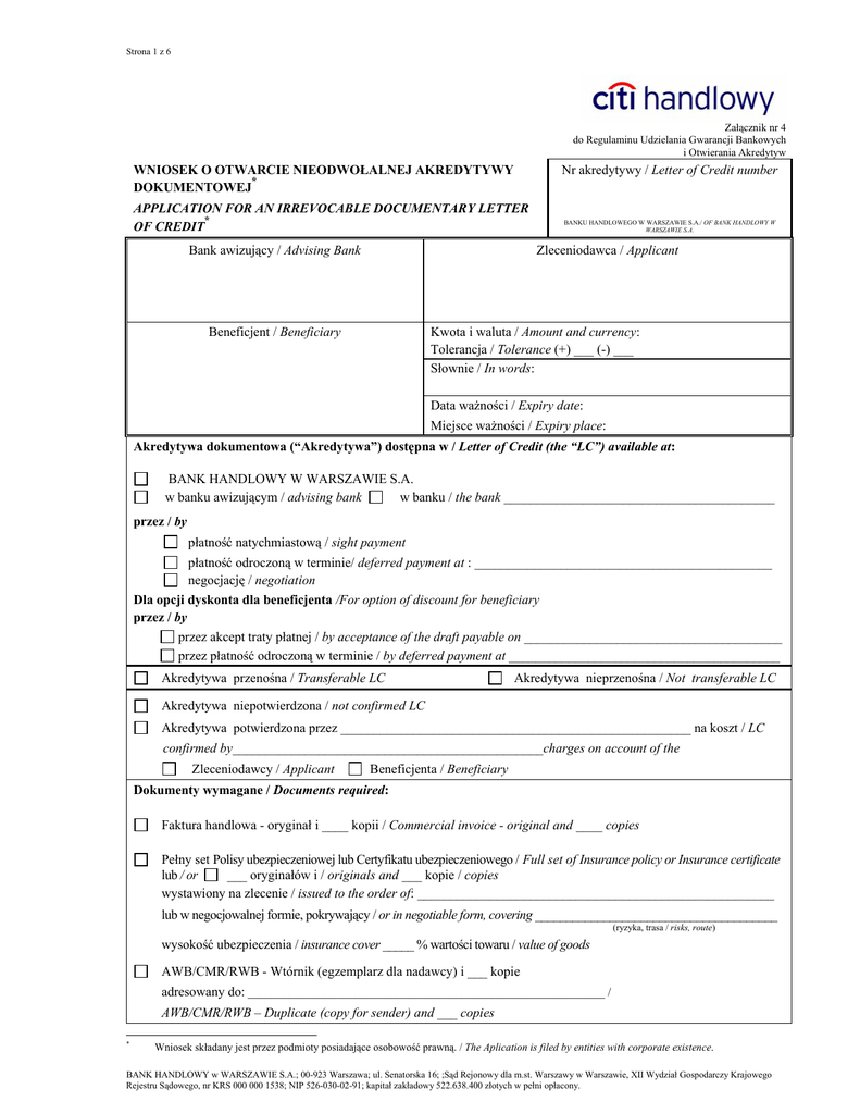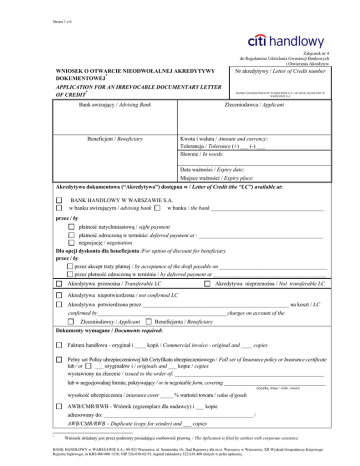 Strona 1 z 6 Załącznik nr 4 do Regulaminu Udzielania Gwarancji Bankowych i Otwierania Akredytyw Nr akredytywy / Letter of Credit number WNIOSEK O OTWARCIE NIEODWOŁALNEJ AKREDYTYWY * DOKUMENTOWEJ APPLICATION FOR AN IRREVOCABLE DOCUMENTARY LETTER * OF CREDIT BANKU HANDLOWEGO W WARSZAWIE S.A./ OF BANK HANDLOWY W WARSZAWIE S.A. Zleceniodawca / Applicant Bank awizujący / Advising Bank Beneficjent / Beneficiary Kwota i waluta / Amount and currency: Tolerancja / Tolerance (+) ___ (-) ___ Słownie / In words: Data ważności / Expiry date: Miejsce ważności / Expiry place: Akredytywa dokumentowa (“Akredytywa”) dostępna w / Letter of Credit (the “LC”) available at: BANK HANDLOWY W WARSZAWIE S.A. w banku awizującym / advising bank w banku / the bank _________________________________________ przez / by płatność natychmiastową / sight payment płatność odroczoną w terminie/ deferred payment at : _____________________________________________ negocjację / negotiation Dla opcji dyskonta dla beneficjenta /For option of discount for beneficiary przez / by przez akcept traty płatnej / by acceptance of the draft payable on _______________________________________ przez płatność odroczoną w terminie / by deferred payment at _________________________________________ Akredytywa przenośna / Transferable LC Akredytywa nieprzenośna / Not transferable LC Akredytywa niepotwierdzona / not confirmed LC Akredytywa potwierdzona przez _____________________________________________________ na koszt / LC confirmed by_______________________________________________charges on account of the Zleceniodawcy / Applicant Beneficjenta / Beneficiary Dokumenty wymagane / Documents required: Faktura handlowa - oryginał i ____ kopii / Commercial invoice - original and ____ copies Pełny set Polisy ubezpieczeniowej lub Certyfikatu ubezpieczeniowego / Full set of Insurance policy or Insurance certificate lub / or ___ oryginałów i / originals and ___ kopie / copies wystawiony na zlecenie / issued to the order of: ______________________________________________________ lub w negocjowalnej formie, pokrywający / or in negotiable form, covering _______________________________________ (ryzyka, trasa / risks, route) wysokość ubezpieczenia / insurance cover _____ % wartości towaru / value of goods AWB/CMR/RWB - Wtórnik (egzemplarz dla nadawcy) i ___ kopie adresowany do: ____________________________________________________________ / AWB/CMR/RWB – Duplicate (copy for sender) and ___ copies * Wniosek składany jest przez podmioty posiadające osobowość prawną. / The Aplication is filed by entities with corporate existence. BANK HANDLOWY w WARSZAWIE S.A.; 00-923 Warszawa; ul. Senatorska 16; ;Sąd Rejonowy dla m.st. Warszawy w Warszawie, XII Wydział Gospodarczy Krajowego Rejestru Sądowego, nr KRS 000 000 1538; NIP 526-030-02-91; kapitał zakładowy 522.638.400 złotych w pełni opłacony. Strona 2 z 6 consigned to: _______________________________________________________________ Pełny set Konosamentu / Full set of Bill of Lading lub / or ___ oryginałów i / originals and ___ kopie / copies z portu do portu / port to port kombinowany / multimodal morski / marine oceaniczny / ocean wystawiony na zlecenie / issued to the order of: __________________________________________________ powiadomić / notify: ____________________________________________________________________ do inkasa / collect oznakowany: fracht / marked: freight przedpłacony / prepaid inne dokumenty / other documents:_________________________________________________________________ ________________________________________________________________________________________________________ ________________________________________________________________________________________________________ W przypadku dodatkowych informacji dotyczących dokumentów, prosimy wypełnić Załącznik do Załącznika nr 4 / In case of additional data concerning documents, please fill in the Addendum to Appendix no 4. Dokumenty winny być prezentowane w ciągu _____ dni po wysyłce towaru lecz przed datą upływu terminu ważności Akredytywy. / Documents must be presented within _____ days after the date of shipment, but prior to the expiry of the LC. Dokumenty winny być prezentowane w ciągu: ______________________________________________________ / Documents must be presented within: _____________________________________________________________ Opis towaru / Description of merchandise: Numer kontraktu lub umowy / Contract or Agreement number: _______________________________________________________ Baza dostawy / Delivery Terms: (według INCOTERMS / according to INCOTERMS): EXW _______________ FOB _______________ Miejsce / Location Miejsce / Location CIP ________________ Miejsce / Location DDU _______________ CFR ________________________________ Miejsce / Location CIF ___________________________________ Miejsce / Location Miejsce / Location inne / other ______________________________ Wysyłka z / Shipment from: __________________________________ do / to : ______________________________ najpóźniej do / Latest shipment date: ___________ Częściowe dostawy / Partial shipments: Dozwolone / Permitted Niedozwolone / Prohibited Przeładunek / Transshipments: Dozwolony / Permitted Niedozwolony / Prohibited Częściowe płatności / Partial payment : Dozwolone / Permitted Niedozwolone / Prohibited W przypadku dodatkowych warunków do Wniosku o otwarcie Akredytywy prosimy wypełnić Załącznik do BANK HANDLOWY w WARSZAWIE S.A.; 00-923 Warszawa; ul. Senatorska 16; ;Sąd Rejonowy dla m.st. Warszawy w Warszawie, XII Wydział Gospodarczy Krajowego Rejestru Sądowego, nr KRS 000 000 1538; NIP 526-030-02-91; kapitał zakładowy 522.638.400 złotych w pełni opłacony. Strona 3 z 6 Załącznika nr 4 / In case of additional conditions to the Application for Letter of Credit please fill in the Addendum to Appendix no 4. Koszty i prowizje BANKU HANDLOWEGO W WARSZAWIE S.A. pokrywa / 