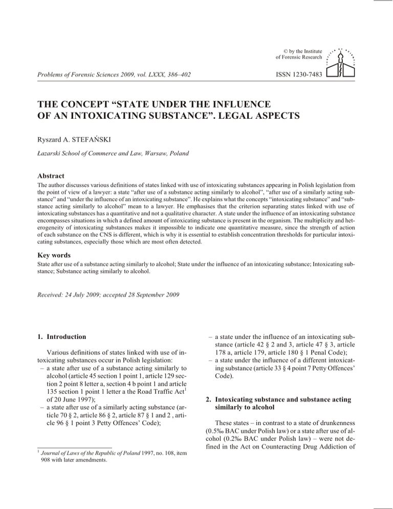 © by the Institute of Forensic Research Problems of Forensic Sciences 2009, vol. LXXX, 386–402 ISSN 1230-7483 THE CONCEPT “STATE UNDER THE INFLUENCE OF AN INTOXICATING SUBSTANCE”. LEGAL ASPECTS Ryszard A. STEFAÑSKI £azarski School of Commerce and Law, Warsaw, Poland Abstract The author discusses various definitions of states linked with use of intoxicating substances appearing in Polish legislation from the point of view of a lawyer: a state “after use of a substance acting similarly to alcohol”, “after use of a similarly acting substance” and “under the influence of an intoxicating substance”. He explains what the concepts “intoxicating substance” and “substance acting similarly to alcohol” mean to a lawyer. He emphasises that the criterion separating states linked with use of intoxicating substances has a quantitative and not a qualitative character. A state under the influence of an intoxicating substance encompasses situations in which a defined amount of intoxicating substance is present in the organism. The multiplicity and heterogeneity of intoxicating substances makes it impossible to indicate one quantitative measure, since the strength of action of each substance on the CNS is different, which is why it is essential to establish concentration thresholds for particular intoxicating substances, especially those which are most often detected. Key words State after use of a substance acting similarly to alcohol; State under the influence of an intoxicating substance; Intoxicating substance; Substance acting similarly to alcohol. Received: 24 July 2009; accepted 28 September 2009 1. Introduction Various definitions of states linked with use of intoxicating substances occur in Polish legislation: – a state after use of a substance acting similarly to alcohol (article 45 section 1 point 1, article 129 section 2 point 8 letter a, section 4 b point 1 and article 135 section 1 point 1 letter a the Road Traffic Act1 of 20 June 1997); – a state after use of a similarly acting substance (article 70 § 2, article 86 § 2, article 87 § 1 and 2 , article 96 § 1 point 3 Petty Offences’ Code); 1 Journal of Laws of the Republic of Poland 1997, no. 108, item 908 with later amendments. – a state under the influence of an intoxicating substance (article 42 § 2 and 3, article 47 § 3, article 178 a, article 179, article 180 § 1 Penal Code); – a state under the influence of a different intoxicating substance (article 33 § 4 point 7 Petty Offences’ Code). 2. Intoxicating substance and substance acting similarly to alcohol These states – in contrast to a state of drunkenness (0.5‰ BAC under Polish law) or a state after use of alcohol (0.2‰ BAC under Polish law) – were not defined in the Act on Counteracting Drug Addiction of 387 The concept “state under the influence of an intoxicating substance”... 29 July 20052. Nor were they defined in the following codes: Penal Code (P.C.), Petty Offences’ Code (P.O.C.) or the Road Traffic Act (R.T.A.). This creates significant interpretational difficulties. These are further magnified by the fact that various terms are used to describe substances engendering these states. In the Penal Code, the term “intoxicating substance” is used, in the Petty Offences’ Code, “a similarly acting substance”, and in the Road Traffic Act, “a substance acting similarly to alcohol”, which immediately raises the question as to whether the same substances are being referred to or different ones. In the last two definitions, the similarity to alcohol is emphasized – in other words a substance that acts similarly (to alcohol) on the human organism is being referred to. At first sight it might seem that use of different terms by the legislator to describe the mentioned substances attests to their difference. Such an interpretation is supported by the ban on synonymous interpretation expressed in a directive [33], prohibiting ascribing the same meaning to different terms. Furthermore, nothing stood in the way of using the term “state after use of an intoxicating substance” to define this state in the Petty Offences’ Code and Road Traffic Act, which would thus have preserved the symmetry (consistency) of the terms. The ban on synonymous interpretation is not, however, absolute and exceptions are admissible. In different systemic or functional contexts, various (different) terms can have the same meaning [52]. These definitions occur as alternatives to states linked with consumption of alcohol, which indicates that in all these cases, we are talking about substances acting similarly to alcohol – in other words ones whose action causes a similar lowering of psychophysical efficiency to that after consumption of alcohol. Substances acting similarly to alcohol are thus substances which do not cause alcoholic intoxication, but by acting depressively on the central nervous system (CNS), similarly to alcohol, lower psychophysical efficiency. Thus, we are talking about substances whose results of use are similar to those of alcohol. It is rightly indicated in the literature of the subject that certain medicines that significantly impair psychophysical efficiency or ones which can impair it depending on dose and route of administration, and also intoxicating substances and psychotropic substances and other substances which may be regarded as substitutes (organic solvents – toluene, benzene; plants, e.g. jimson weed (Datura stramonium) or substitute substances are substances acting similarly to alcohol [22]. In es2 Journal of Laws of the Republic of Poland 2005, no. 179, item 1485 with later amendments. sence these are substances which can be encompassed by the broad term “intoxicating”, which means these concepts may be considered to be identical [19, 41, 42]. It is rightly emphasized in the literature that each intoxicating substance is at the same time a substance acting similarly to alcohol and vice-versa, an