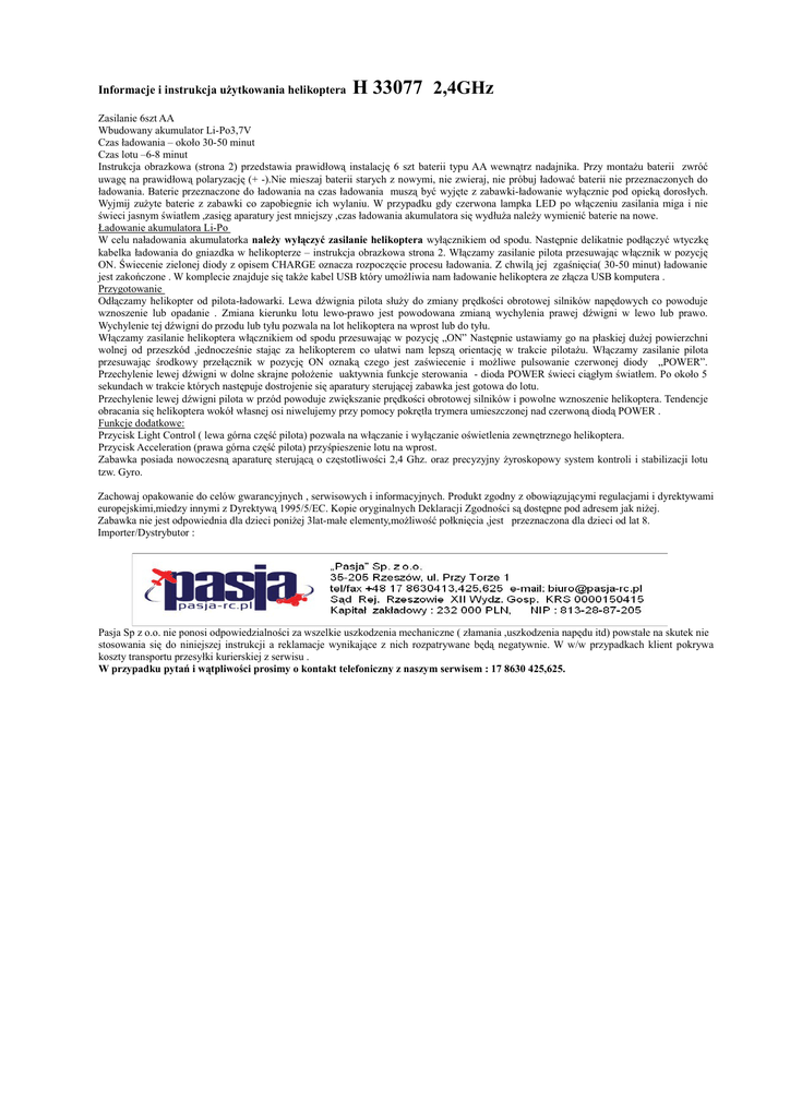 Informacje i instrukcja użytkowania helikoptera H 33077 2,4GHz Zasilanie 6szt AA Wbudowany akumulator Li-Po3,7V Czas ładowania – około 30-50 minut Czas lotu –6-8 minut Instrukcja obrazkowa (strona 2) przedstawia prawidłową instalację 6 szt baterii typu AA wewnątrz nadajnika. Przy montażu baterii zwróć uwagę na prawidłową polaryzację (+ -).Nie mieszaj baterii starych z nowymi, nie zwieraj, nie próbuj ładować baterii nie przeznaczonych do ładowania. Baterie przeznaczone do ładowania na czas ładowania muszą być wyjęte z zabawki-ładowanie wyłącznie pod opieką dorosłych. Wyjmij zużyte baterie z zabawki co zapobiegnie ich wylaniu. W przypadku gdy czerwona lampka LED po włączeniu zasilania miga i nie świeci jasnym światłem ,zasięg aparatury jest mniejszy ,czas ładowania akumulatora się wydłuża należy wymienić baterie na nowe. Ładowanie akumulatora Li-Po W celu naładowania akumulatorka należy wyłączyć zasilanie helikoptera wyłącznikiem od spodu. Następnie delikatnie podłączyć wtyczkę kabelka ładowania do gniazdka w helikopterze – instrukcja obrazkowa strona 2. Włączamy zasilanie pilota przesuwając włącznik w pozycję ON. Świecenie zielonej diody z opisem CHARGE oznacza rozpoczęcie procesu ładowania. Z chwilą jej zgaśnięcia( 30-50 minut) ładowanie jest zakończone . W komplecie znajduje się także kabel USB który umożliwia nam ładowanie helikoptera ze złącza USB komputera . Przygotowanie Odłączamy helikopter od pilota-ładowarki. Lewa dźwignia pilota służy do zmiany prędkości obrotowej silników napędowych co powoduje wznoszenie lub opadanie . Zmiana kierunku lotu lewo-prawo jest powodowana zmianą wychylenia prawej dźwigni w lewo lub prawo. Wychylenie tej dźwigni do przodu lub tyłu pozwala na lot helikoptera na wprost lub do tyłu. Włączamy zasilanie helikoptera włącznikiem od spodu przesuwając w pozycję „ON” Następnie ustawiamy go na płaskiej dużej powierzchni wolnej od przeszkód ,jednocześnie stając za helikopterem co ułatwi nam lepszą orientację w trakcie pilotażu. Włączamy zasilanie pilota przesuwając środkowy przełącznik w pozycję ON oznaką czego jest zaświecenie i możliwe pulsowanie czerwonej diody „POWER”. Przechylenie lewej dźwigni w dolne skrajne położenie uaktywnia funkcje sterowania - dioda POWER świeci ciągłym światłem. Po około 5 sekundach w trakcie których następuje dostrojenie się aparatury sterującej zabawka jest gotowa do lotu. Przechylenie lewej dźwigni pilota w przód powoduje zwiększanie prędkości obrotowej silników i powolne wznoszenie helikoptera. Tendencje obracania się helikoptera wokół własnej osi niwelujemy przy pomocy pokrętła trymera umieszczonej nad czerwoną diodą POWER . Funkcje dodatkowe: Przycisk Light Control ( lewa górna część pilota) pozwala na włączanie i wyłączanie oświetlenia zewnętrznego helikoptera. Przycisk Acceleration (prawa górna część pilota) przyśpieszenie lotu na wprost. Zabawka posiada nowoczesną aparaturę sterującą o częstotliwości 2,4 Ghz. oraz precyzyjny żyroskopowy system kontroli i stabilizacji lotu tzw. Gyro. Zachowaj opakowanie do celów gwarancyjnych , serwisowych i informacyjnych. Produkt zgodny z obowiązującymi regulacjami i dyrektywami europejskimi,miedzy innymi z Dyrektywą 1995/5/EC. Kopie oryginalnych Deklaracji Zgodności są dostępne pod adresem jak niżej. Zabawka nie jest odpowiednia dla dzieci poniżej 3lat-małe elementy,możliwość połknięcia ,jest przeznaczona dla dzieci od lat 8. Importer/Dystrybutor : Pasja Sp z o.o. nie ponosi odpowiedzialności za wszelkie uszkodzenia mechaniczne ( złamania ,uszkodzenia napędu itd) powstałe na skutek nie stosowania się do niniejszej instrukcji a reklamacje wynikające z nich rozpatrywane będą negatywnie. W w/w przypadkach klient pokrywa koszty transportu przesyłki kurierskiej z serwisu . W przypadku pytań i wątpliwości prosimy o kontakt telefoniczny z naszym serwisem : 17 8630 425,625.